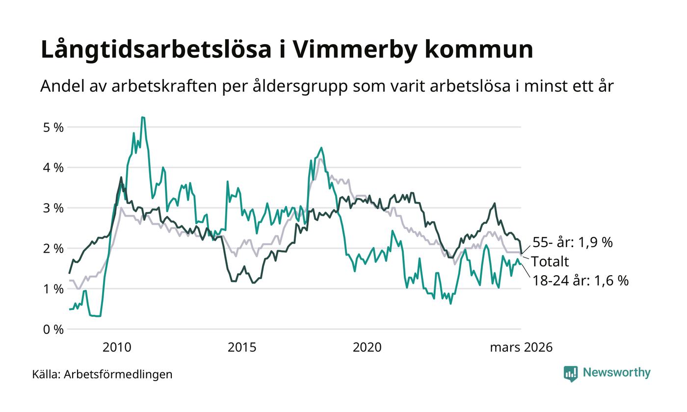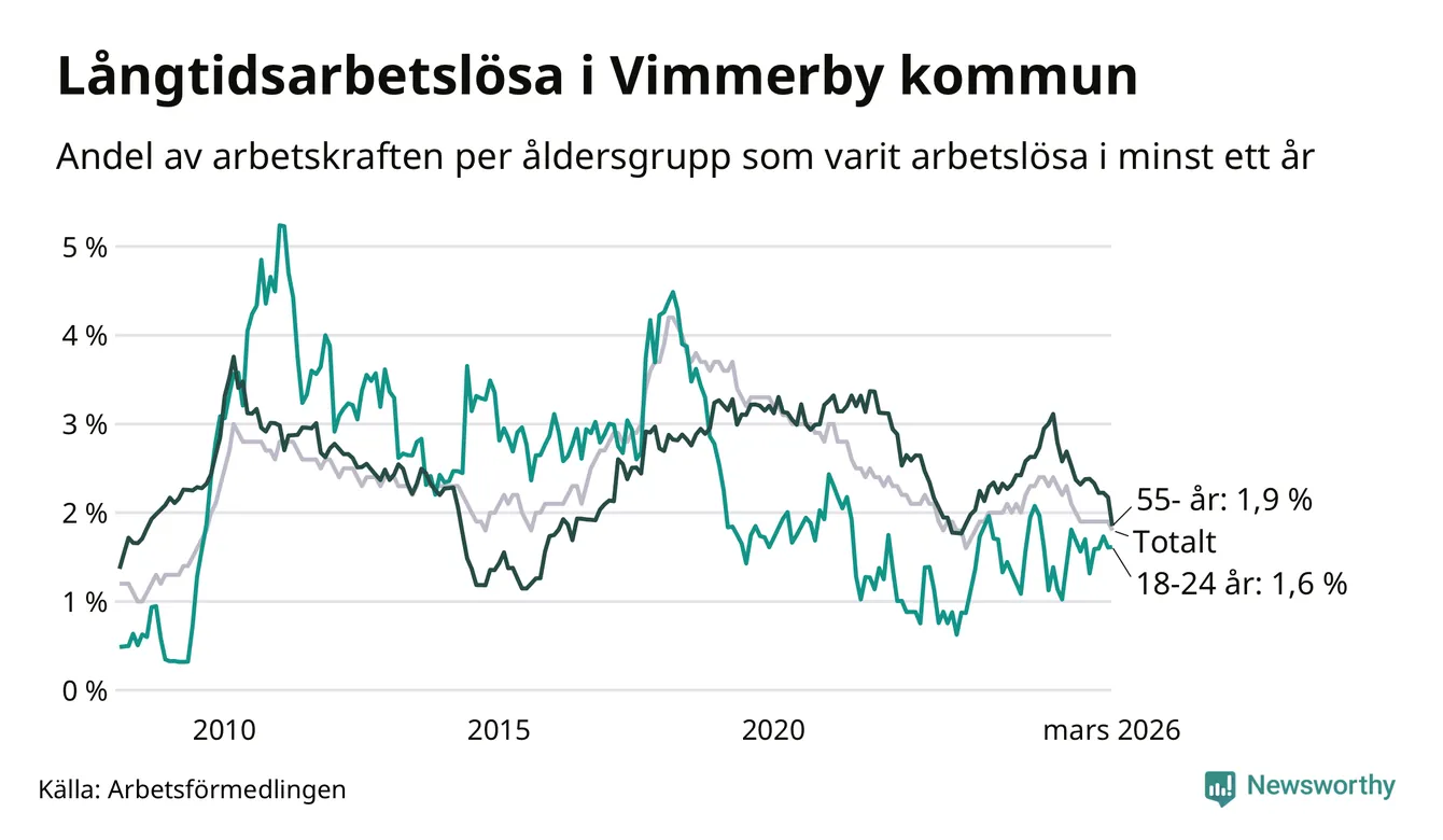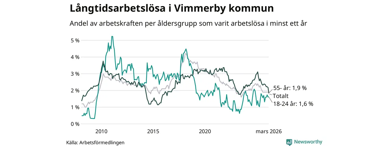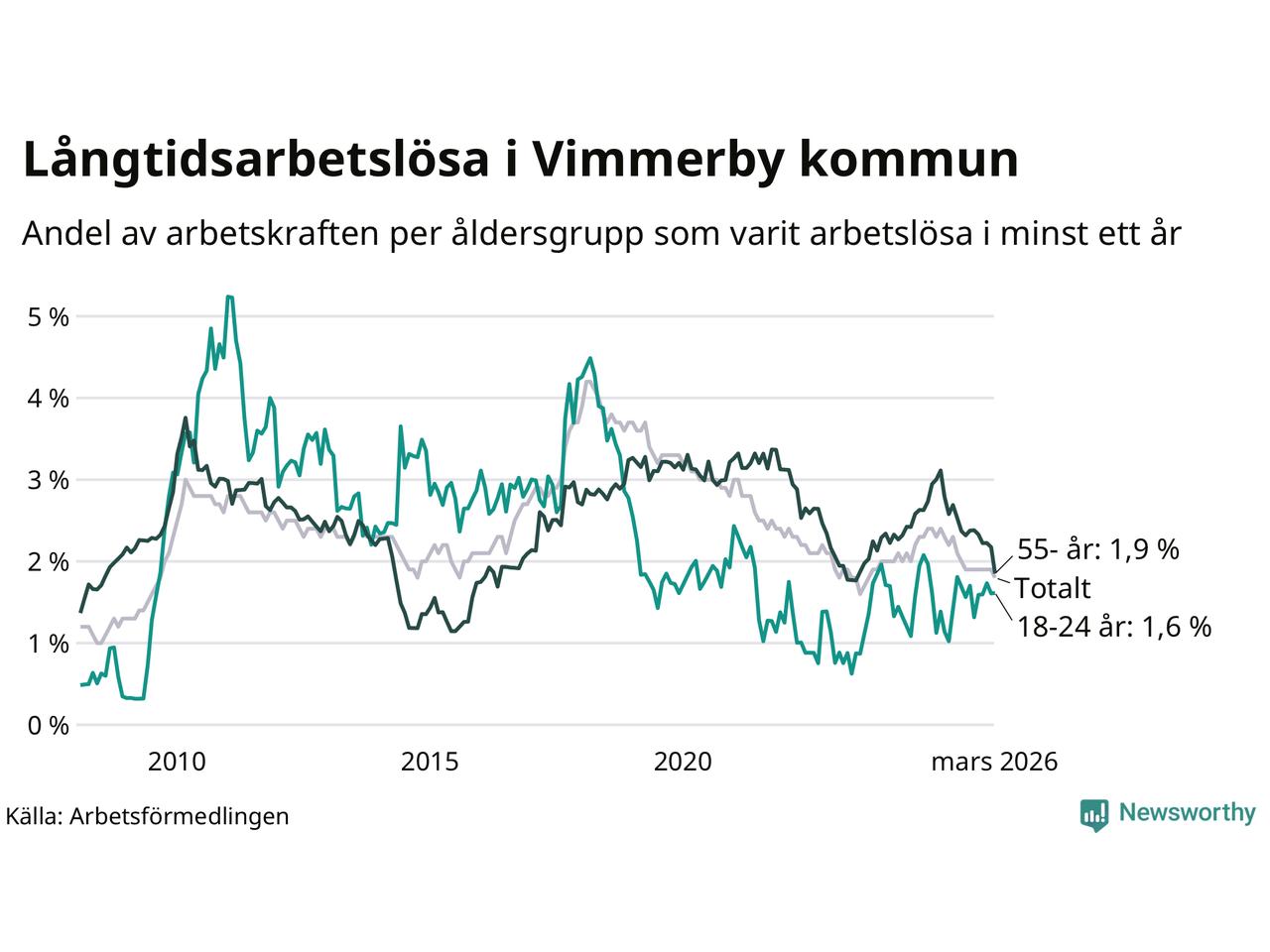 Av de 136 personerna som varit arbetslösa i mer än ett år i Vimmerby kommun är 34 personer mellan 55 och 661 år och tolv är mellan 18 och 24 år. För den äldre gruppen är andelen arbetslösa 1,9 procent medan den i den yngre gruppen är 1,6 procent. Även i riket som helhet är långtidsarbetslösheten högre i gruppen äldre.
