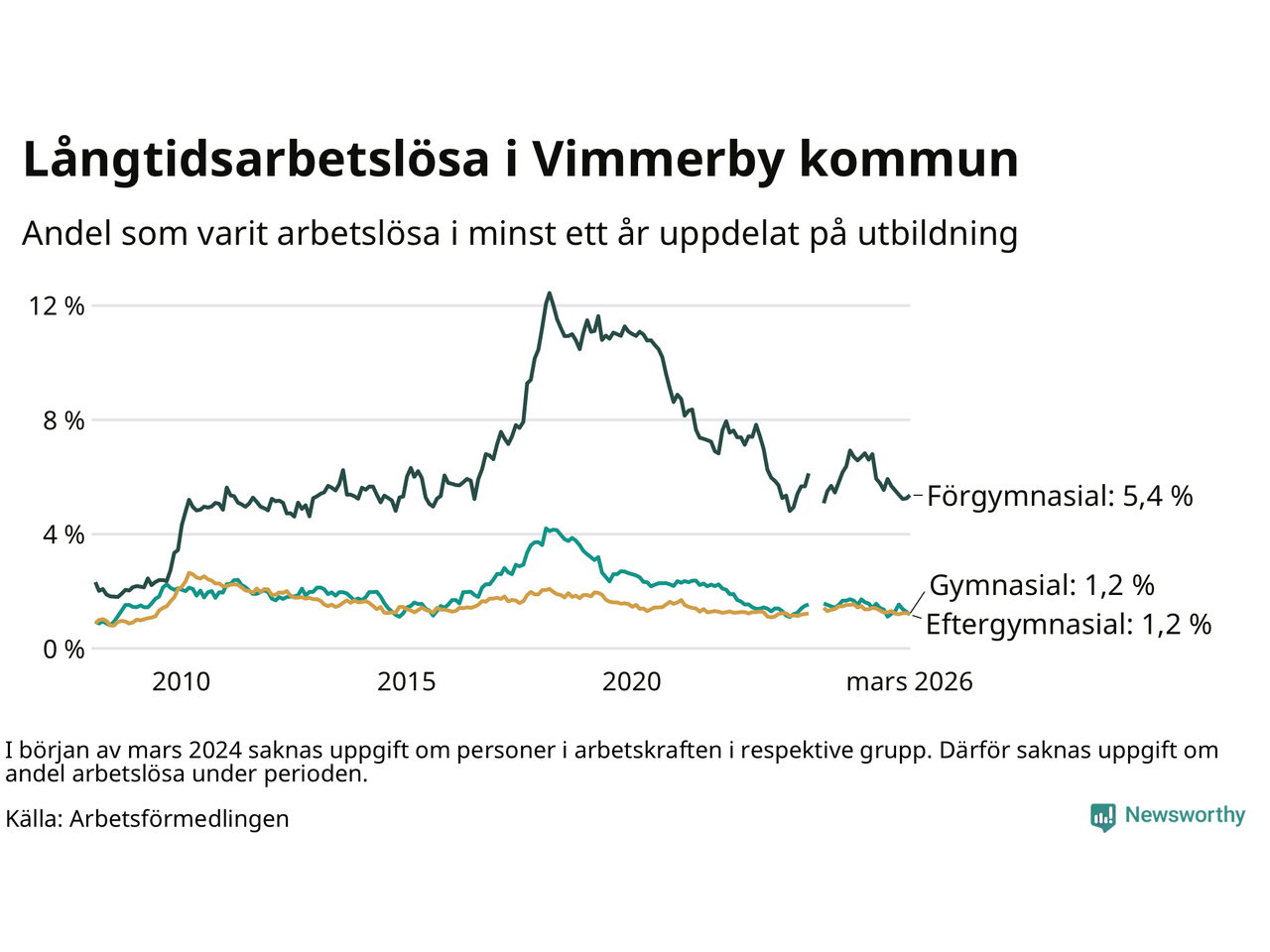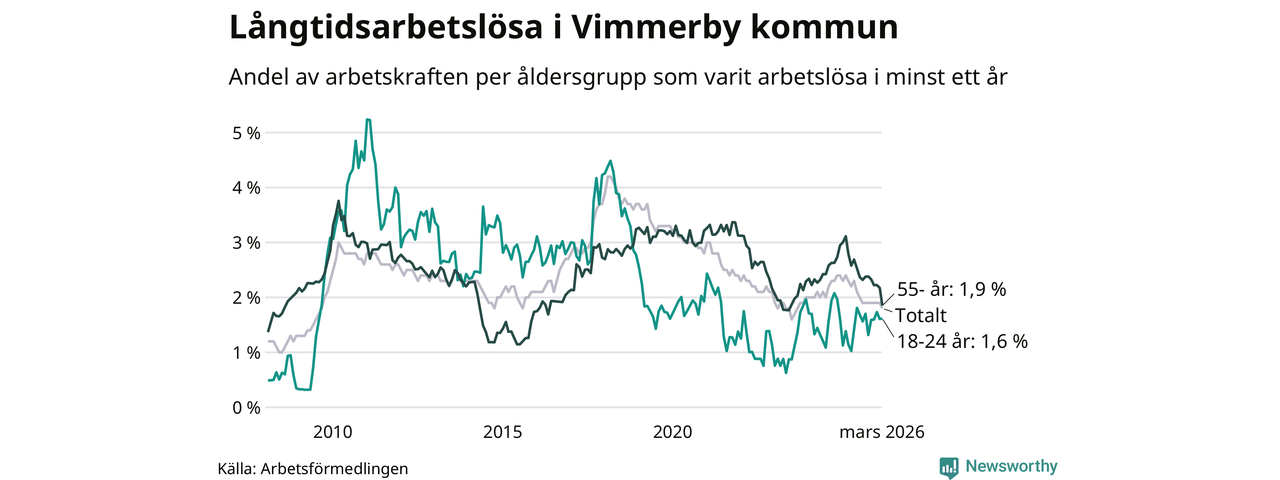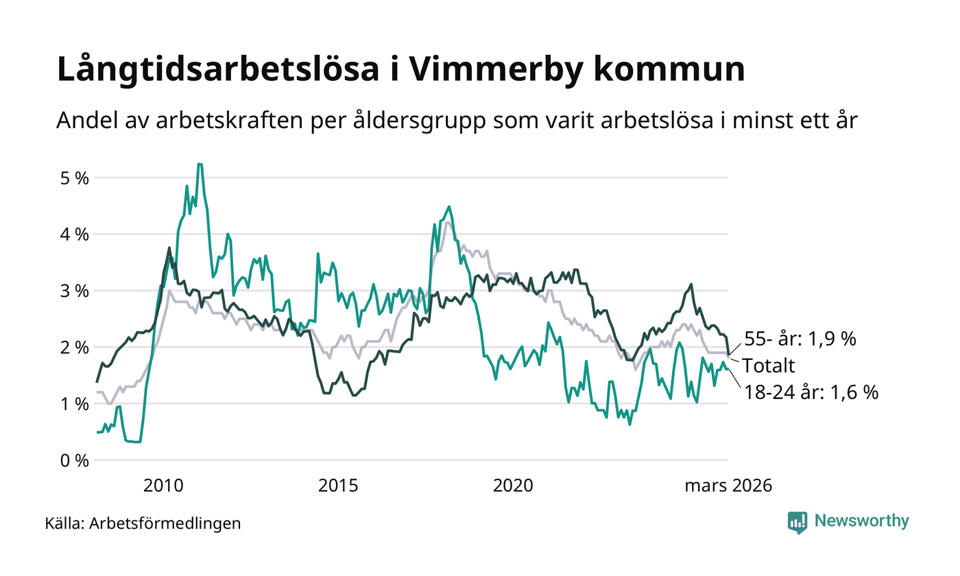 Av de 136 personerna som varit arbetslösa i mer än ett år i Vimmerby kommun är 34 personer mellan 55 och 661 år och tolv är mellan 18 och 24 år. För den äldre gruppen är andelen arbetslösa 1,9 procent medan den i den yngre gruppen är 1,6 procent. Även i riket som helhet är långtidsarbetslösheten högre i gruppen äldre.