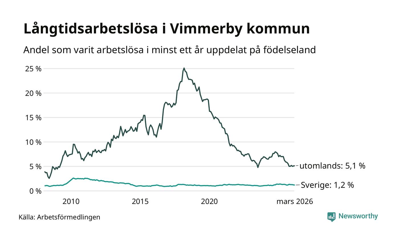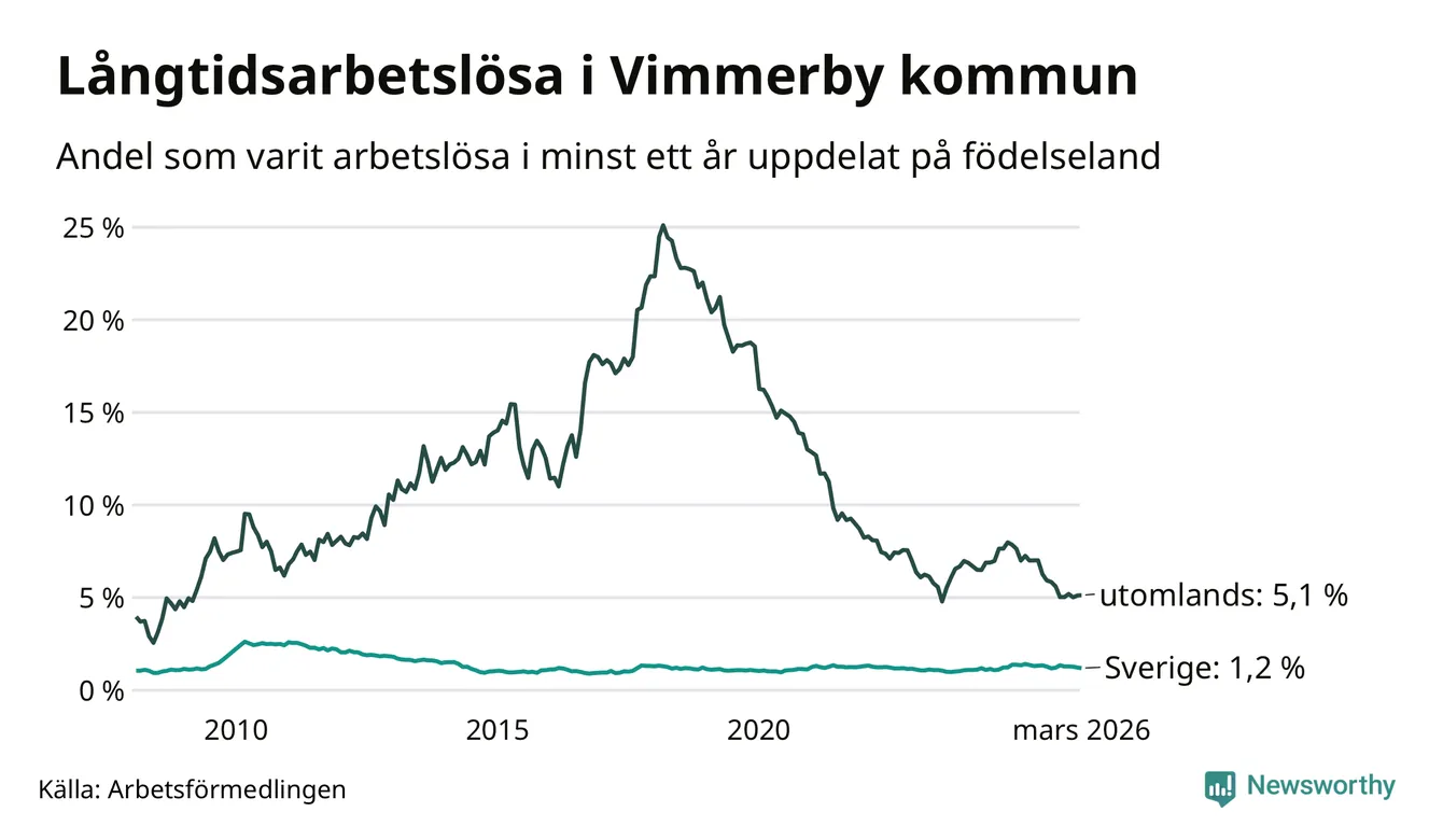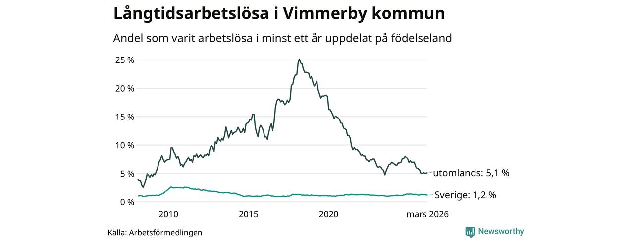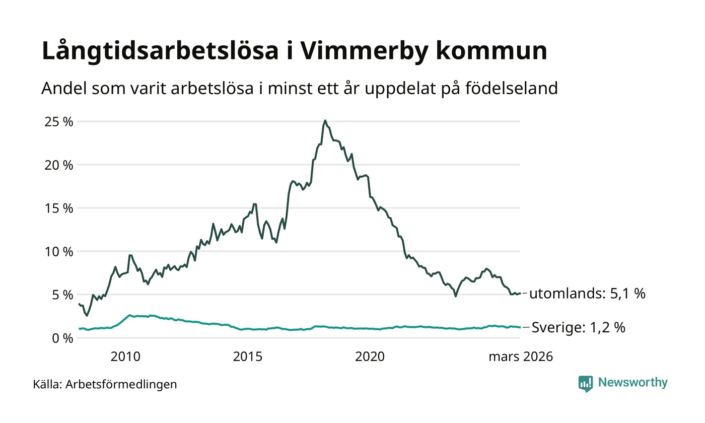 74 av de långtidsarbetslösa i Vimmerby är födda i Sverige, medan 62 är födda utomlands. Det innebär att långtidsarbetslösheten bland Sverigefödda är 1,2 procent, medan den är fyra gånger så hög – 5,1 procent – bland födda utomlands. Även i riket som helhet är arbetslösheten högre bland utrikesfödda.