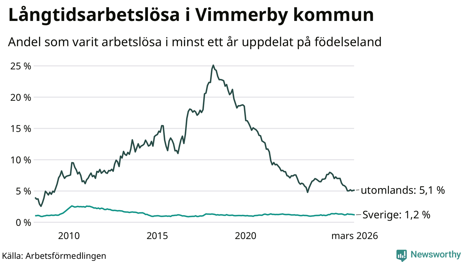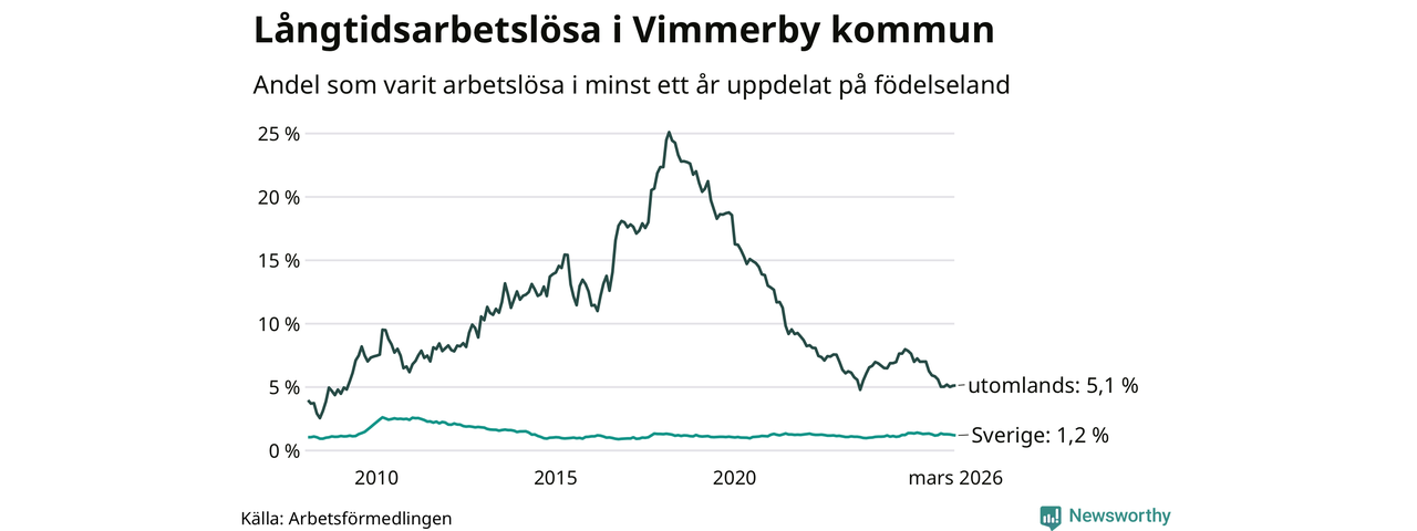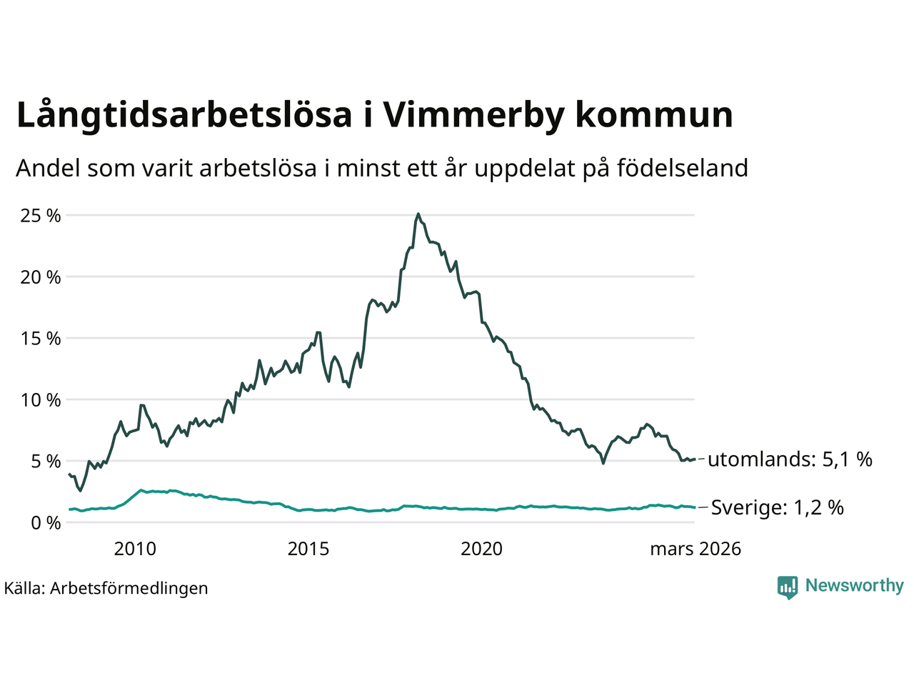 74 av de långtidsarbetslösa i Vimmerby är födda i Sverige, medan 62 är födda utomlands. Det innebär att långtidsarbetslösheten bland Sverigefödda är 1,2 procent, medan den är fyra gånger så hög – 5,1 procent – bland födda utomlands. Även i riket som helhet är arbetslösheten högre bland utrikesfödda.