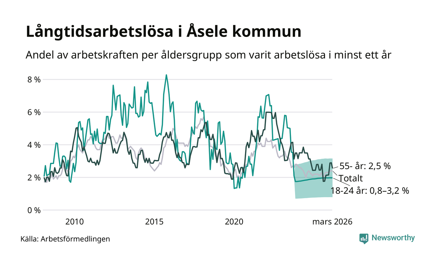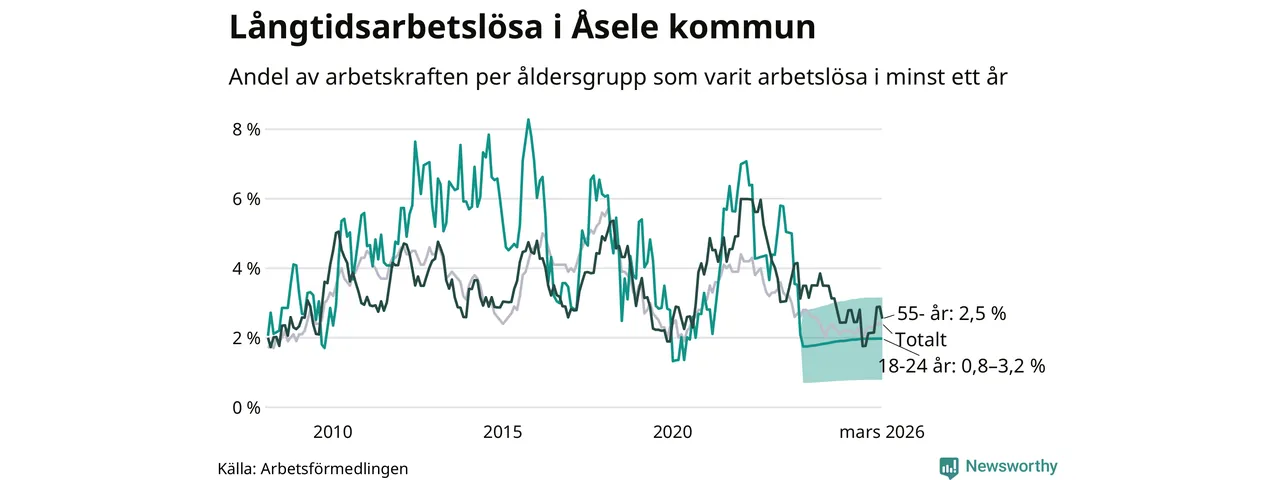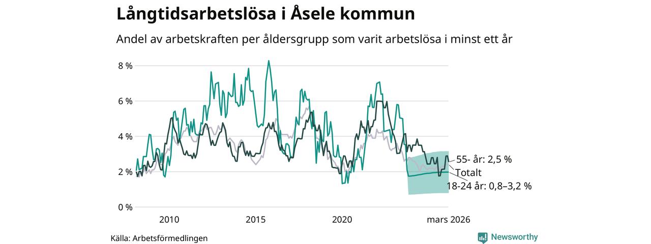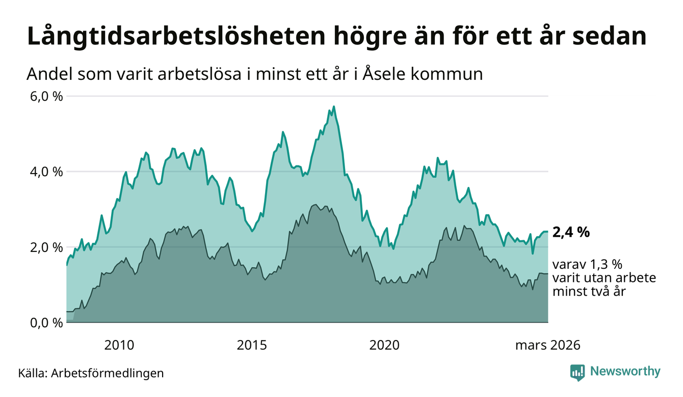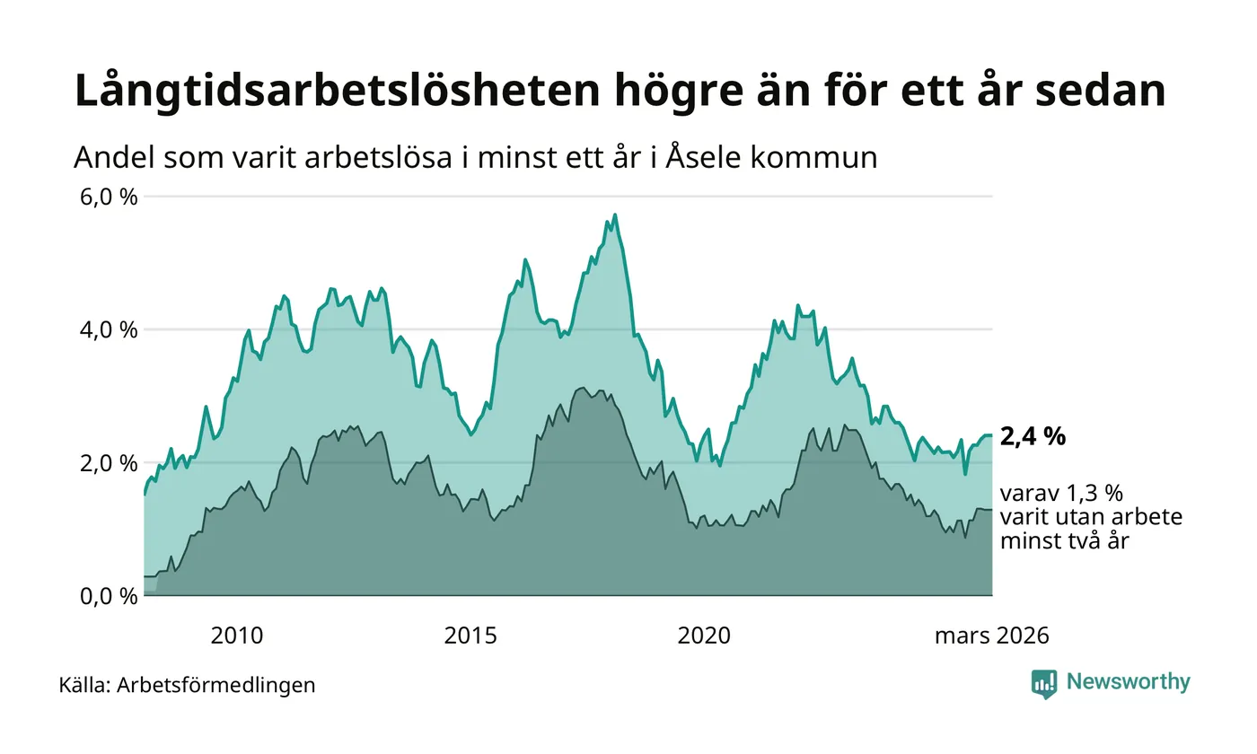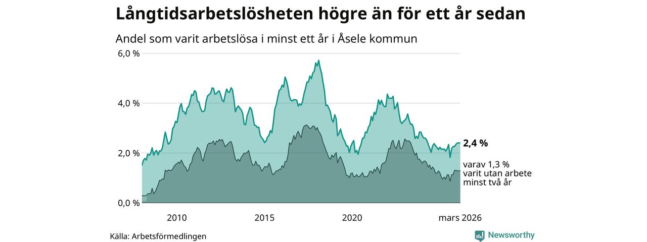 I mars hade 28 Åselebor varit arbetslösa i minst ett år, vilket är lika många som månaden innan. Det är den första månaden sedan augusti 2025 som antalet arbetslösa minskar. 28 personer motsvarar 2,4 procent av arbetskraften i kommunen – andelen långtidsarbetslösa är 0,2 procentenheter högre än samma månad för ett år sedan.