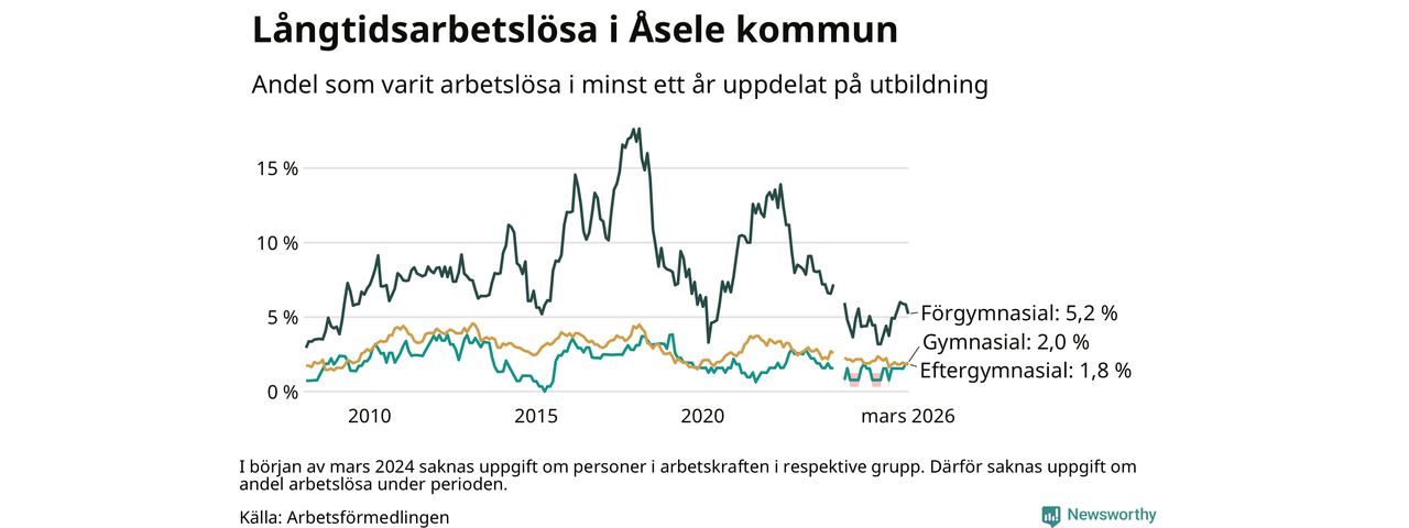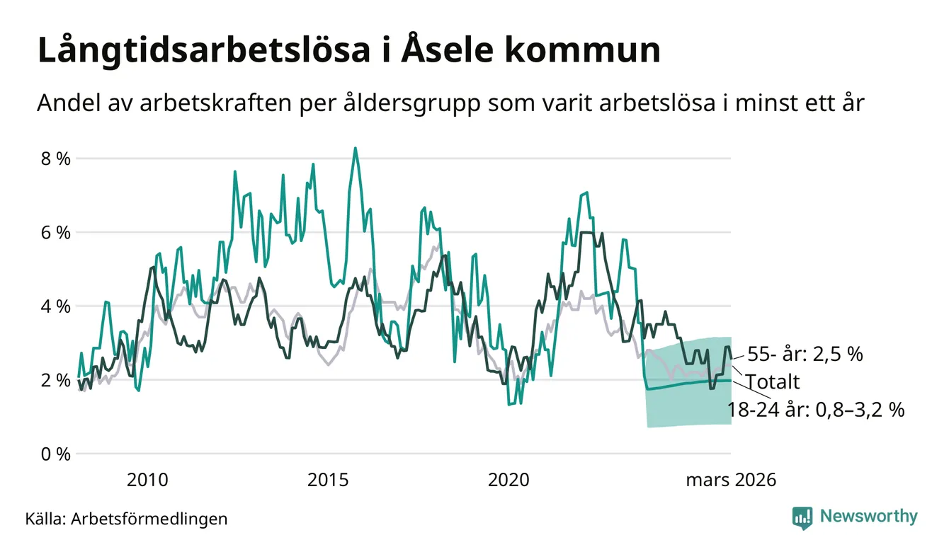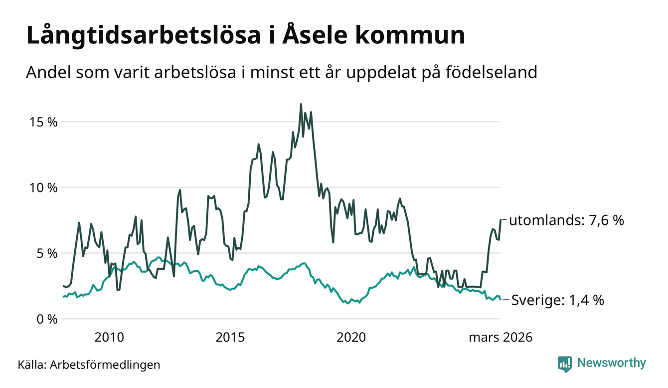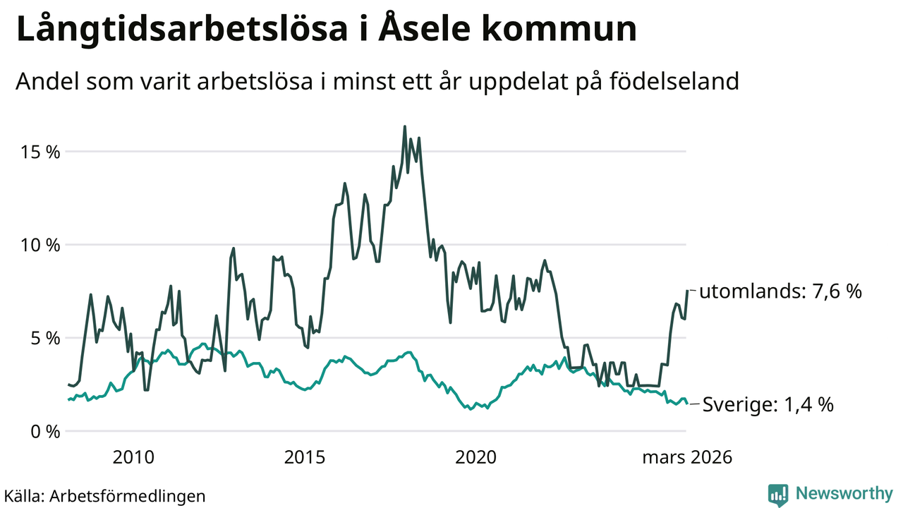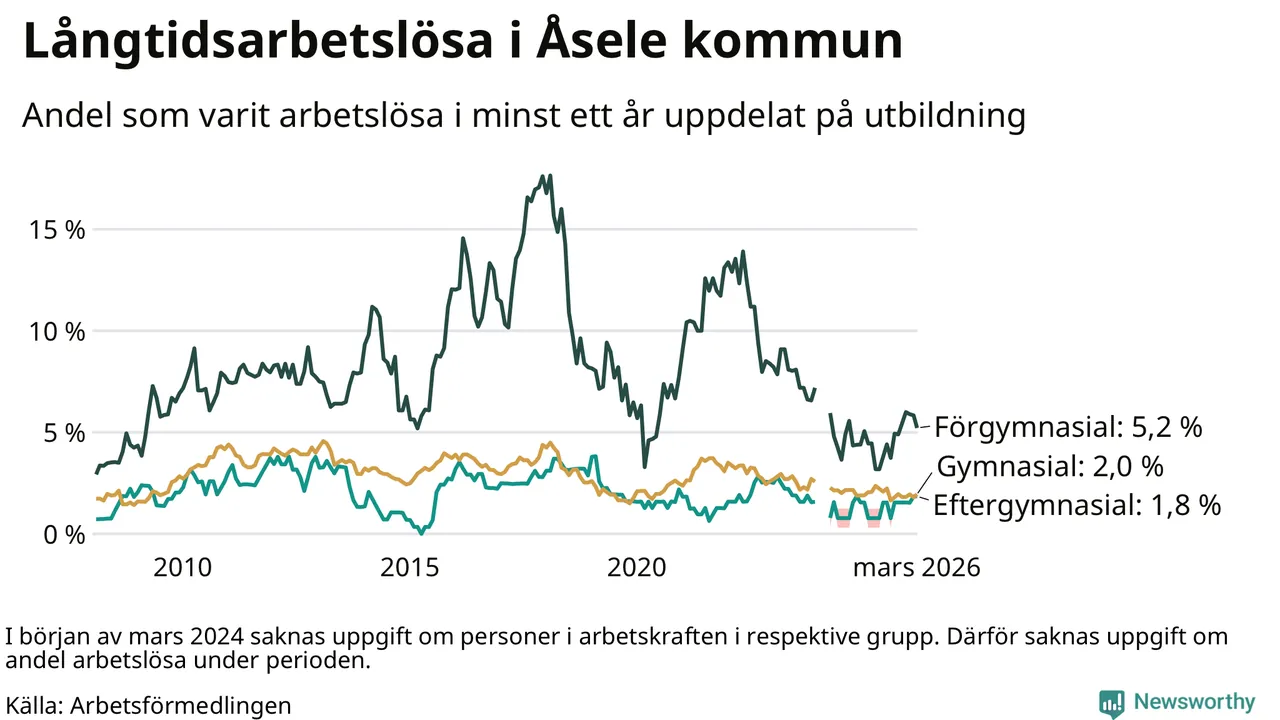 I mars hade 28 Åselebor varit arbetslösa i minst ett år, vilket är lika många som månaden innan. Det är den första månaden sedan augusti 2025 som antalet arbetslösa minskar. 28 personer motsvarar 2,4 procent av arbetskraften i kommunen – andelen långtidsarbetslösa är 0,2 procentenheter högre än samma månad för ett år sedan.