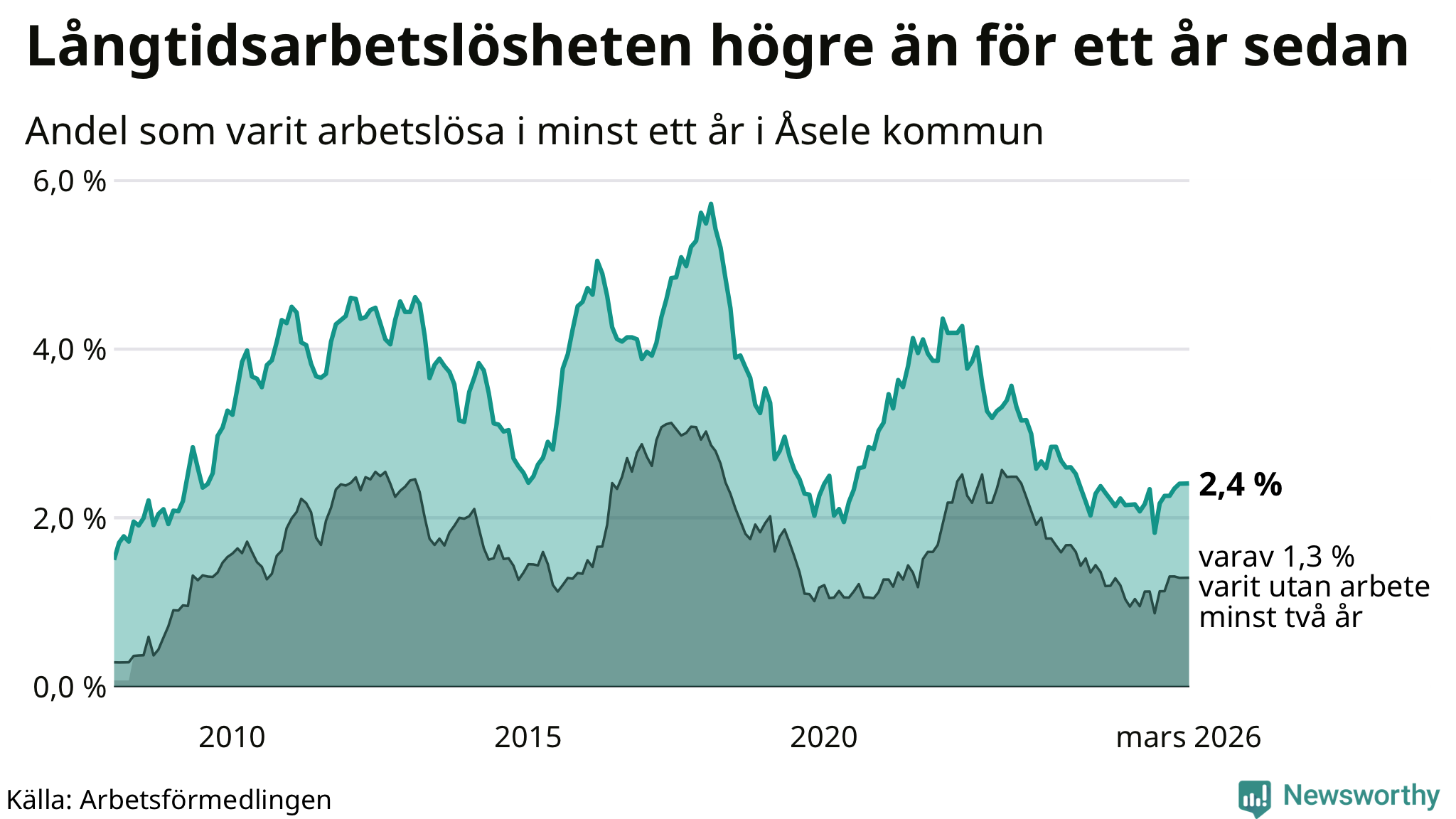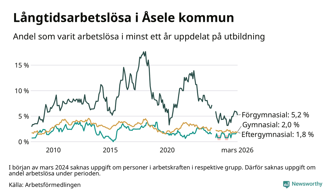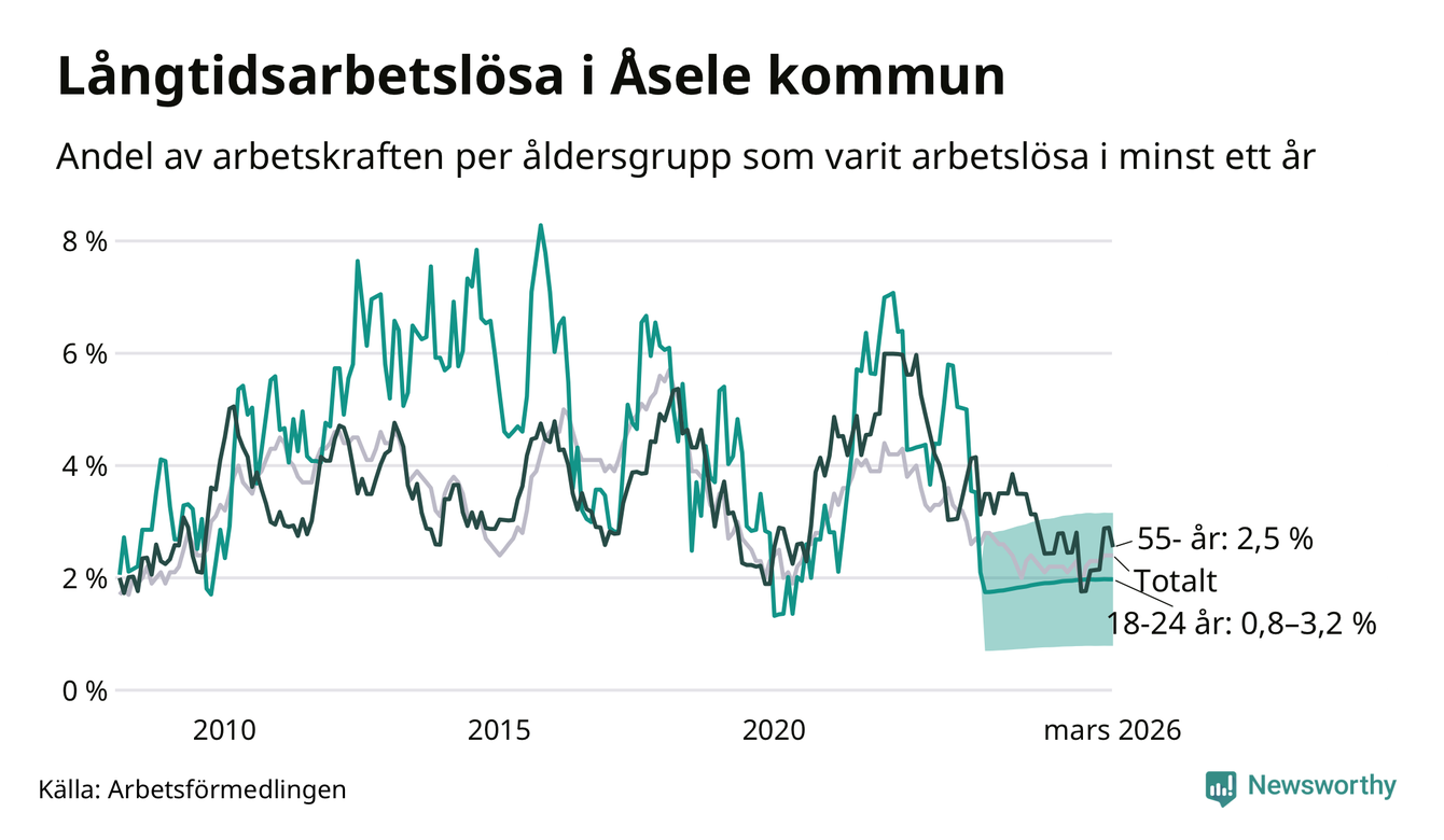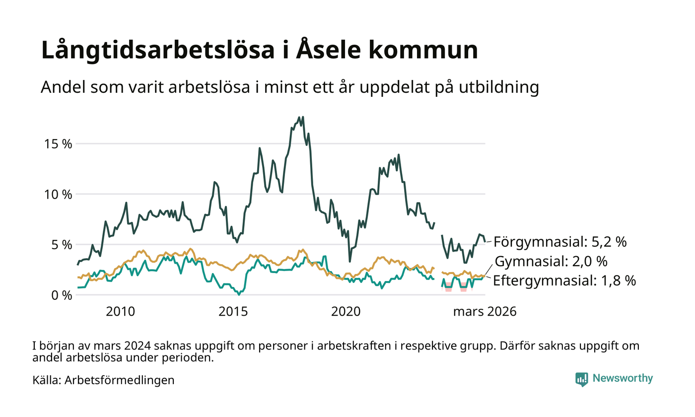 I mars hade 28 Åselebor varit arbetslösa i minst ett år, vilket är lika många som månaden innan. Det är den första månaden sedan augusti 2025 som antalet arbetslösa minskar. 28 personer motsvarar 2,4 procent av arbetskraften i kommunen – andelen långtidsarbetslösa är 0,2 procentenheter högre än samma månad för ett år sedan.