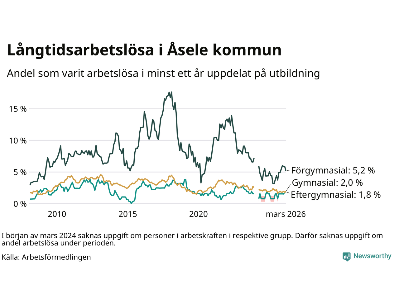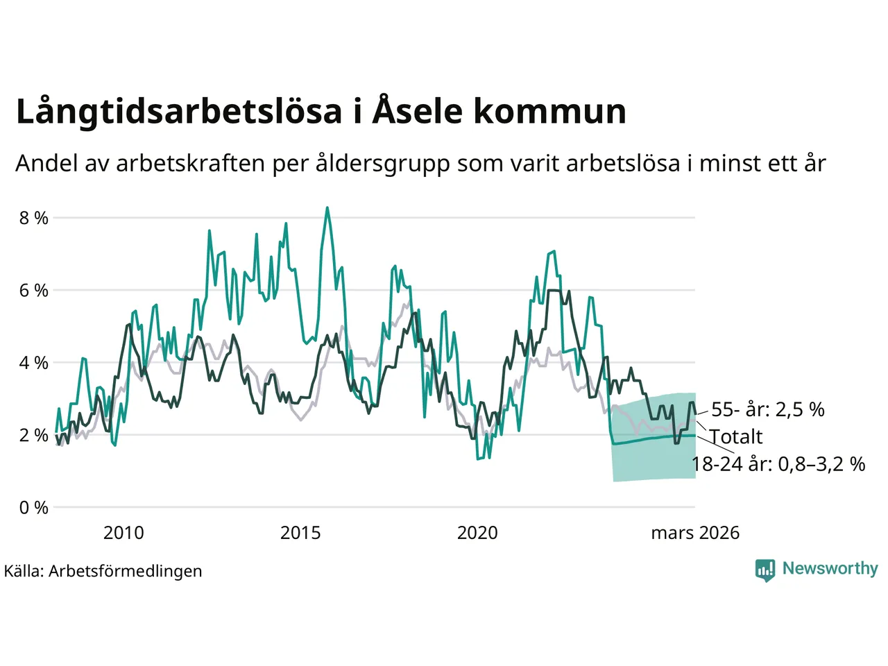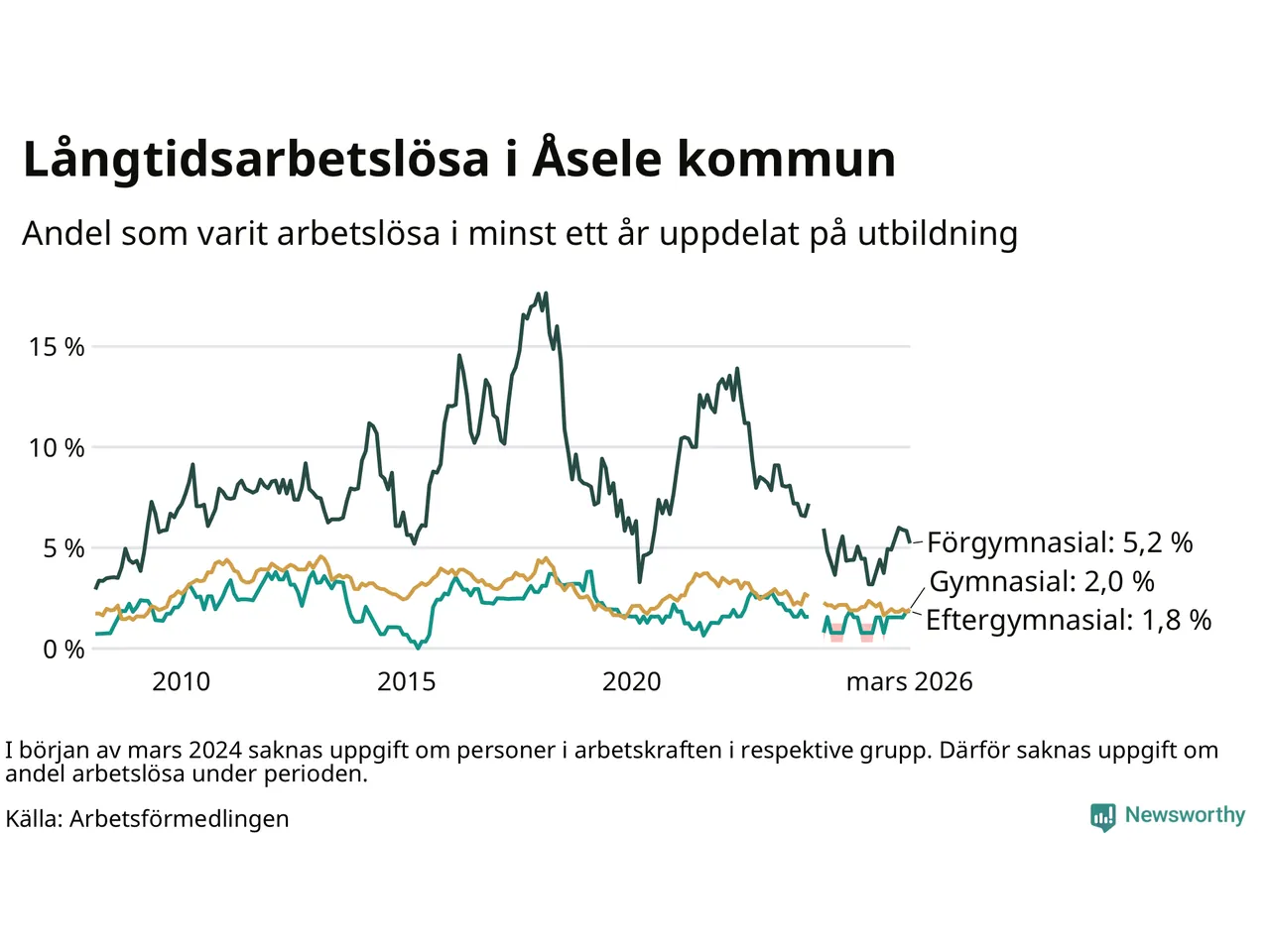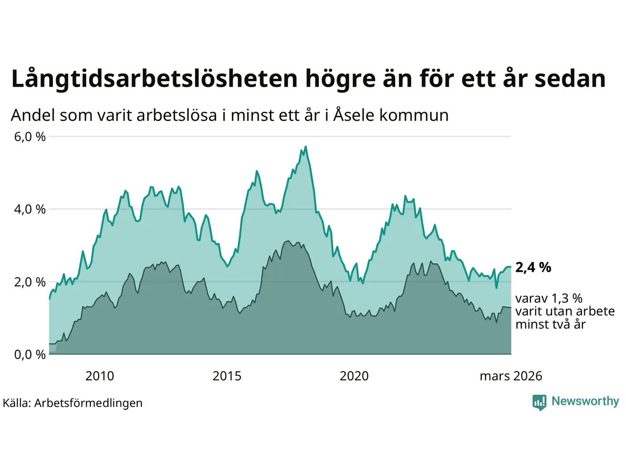 I mars hade 28 Åselebor varit arbetslösa i minst ett år, vilket är lika många som månaden innan. Det är den första månaden sedan augusti 2025 som antalet arbetslösa minskar. 28 personer motsvarar 2,4 procent av arbetskraften i kommunen – andelen långtidsarbetslösa är 0,2 procentenheter högre än samma månad för ett år sedan.