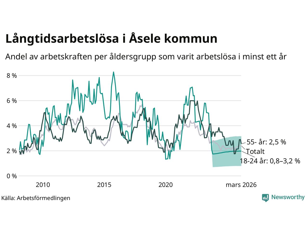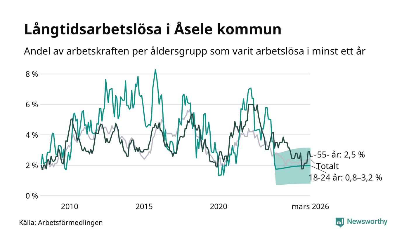 Av de 28 personerna som varit arbetslösa i mer än ett år i Åsele kommun är sju personer mellan 55 och 661 år och mellan en och fyra är mellan 18 och 24 år. För den äldre gruppen är andelen arbetslösa 2,5 procent medan den i den yngre gruppen är mellan 0,8 och 3,2 procent. Även i riket som helhet är långtidsarbetslösheten högre i gruppen äldre.
