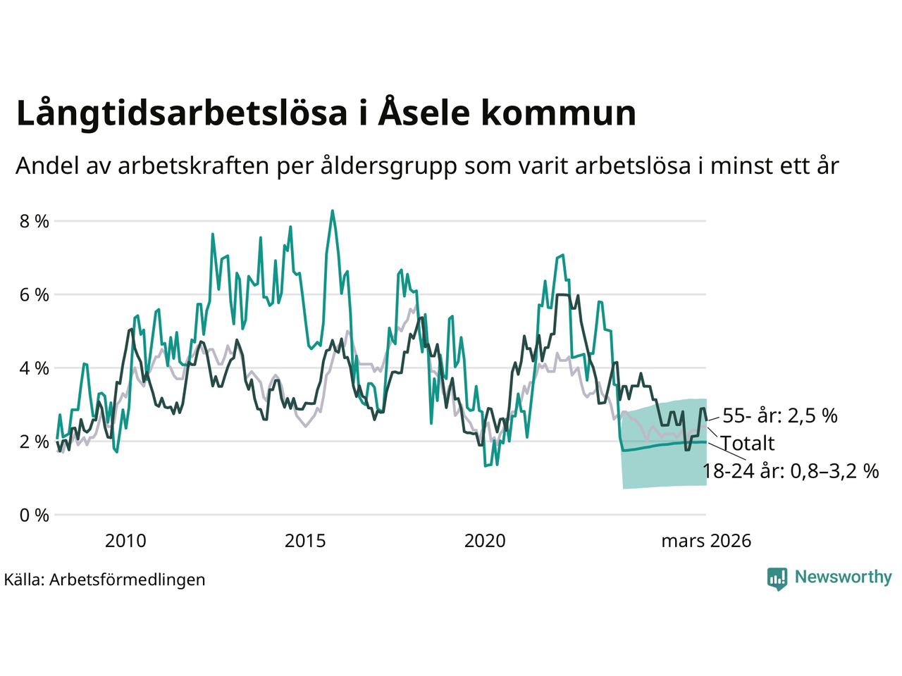 Graf: Andel arbetslösa uppdelat i åldersgrupper i Åsele