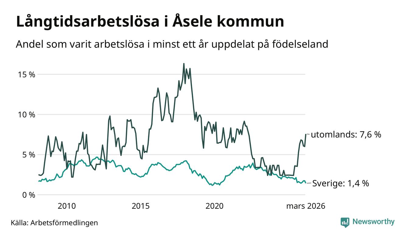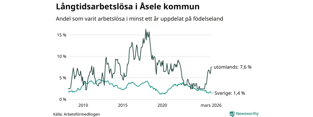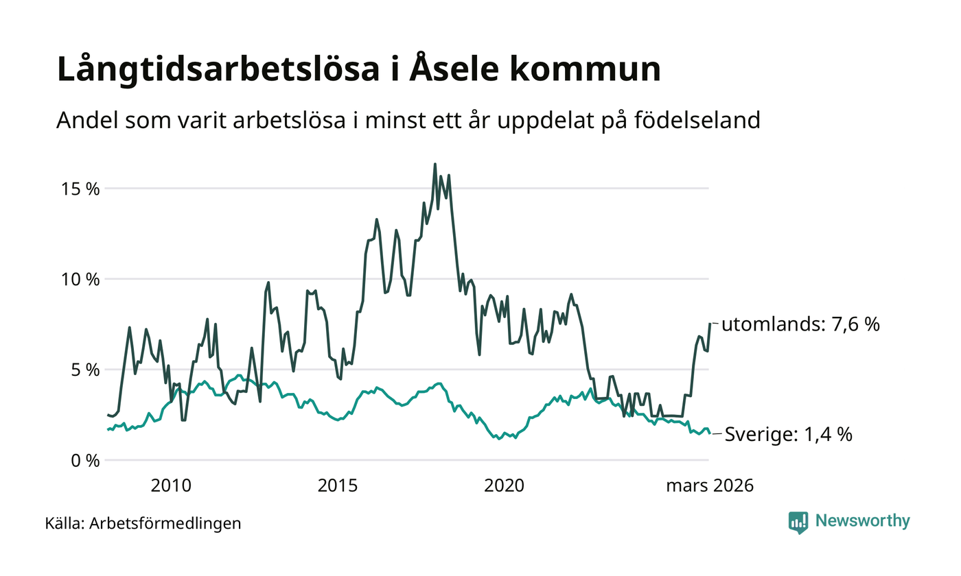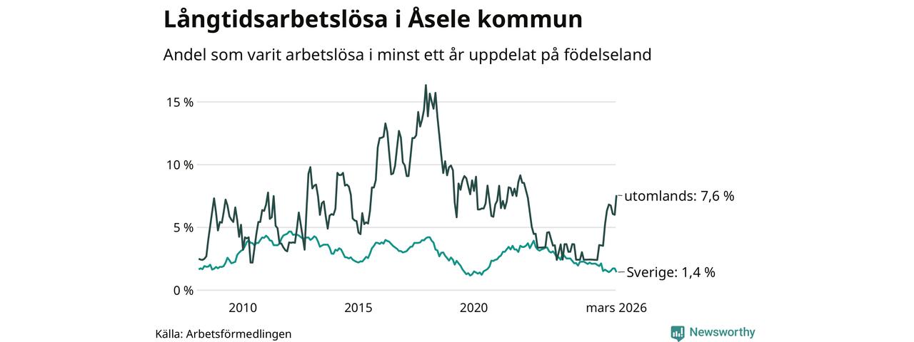 14 av de långtidsarbetslösa i Åsele är födda i Sverige, medan 14 är födda utomlands. Det innebär att långtidsarbetslösheten bland Sverigefödda är 1,4 procent, medan den är fem gånger så hög – 7,6 procent – bland födda utomlands. Även i riket som helhet är arbetslösheten högre bland utrikesfödda.