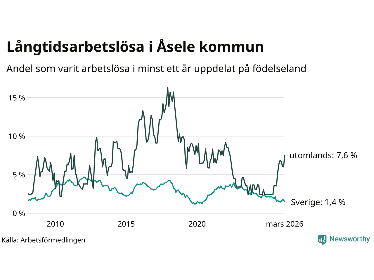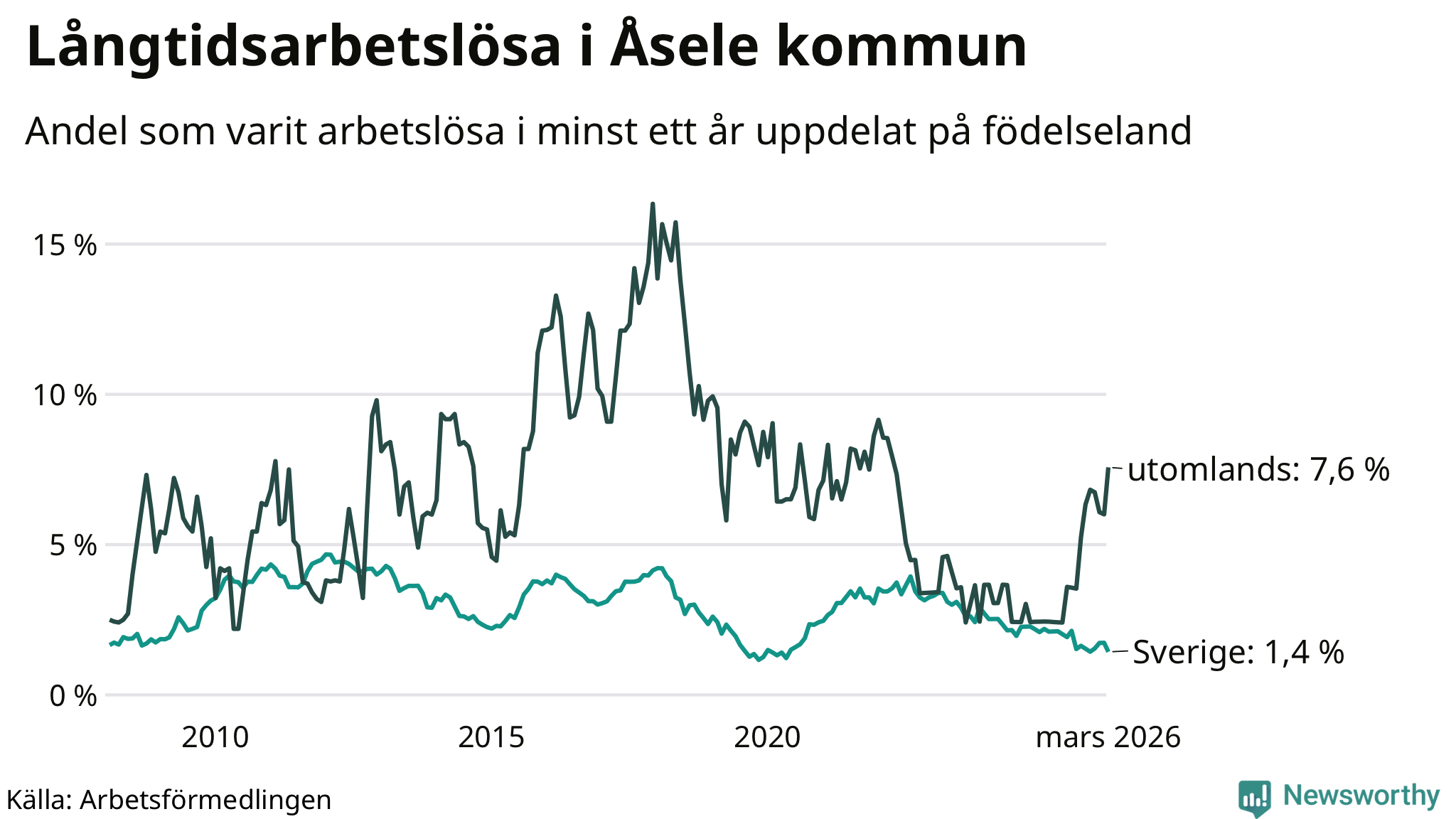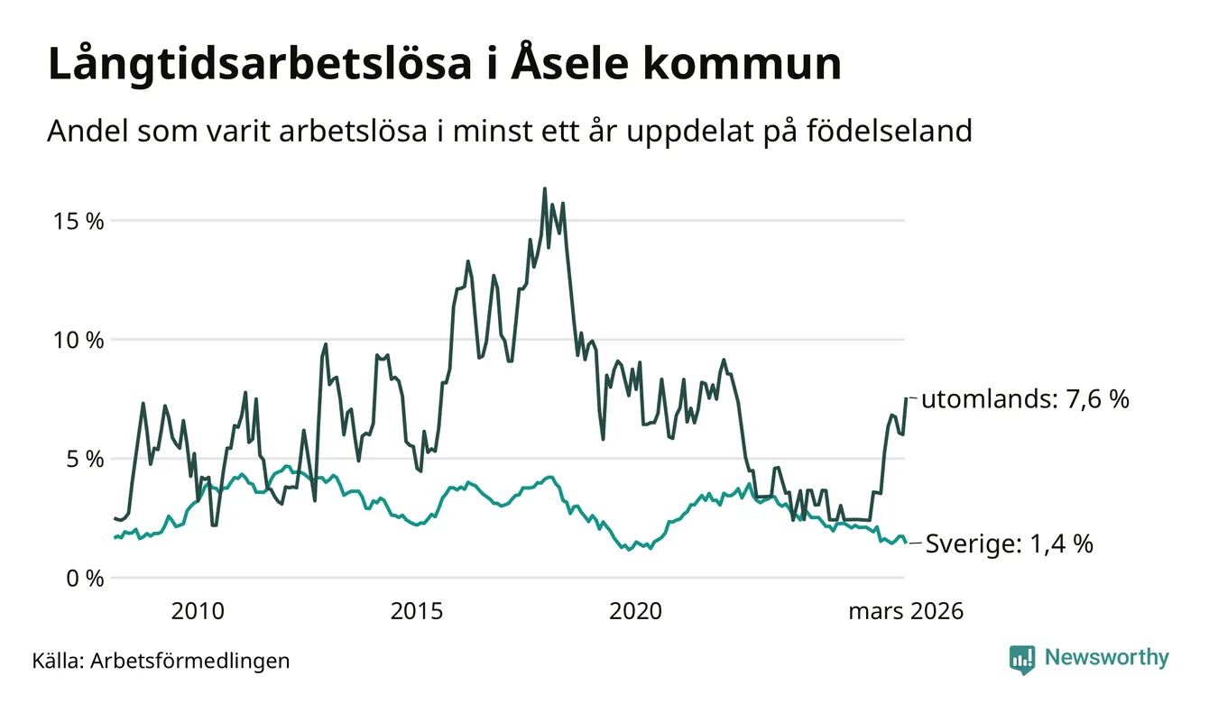 14 av de långtidsarbetslösa i Åsele är födda i Sverige, medan 14 är födda utomlands. Det innebär att långtidsarbetslösheten bland Sverigefödda är 1,4 procent, medan den är fem gånger så hög – 7,6 procent – bland födda utomlands. Även i riket som helhet är arbetslösheten högre bland utrikesfödda.