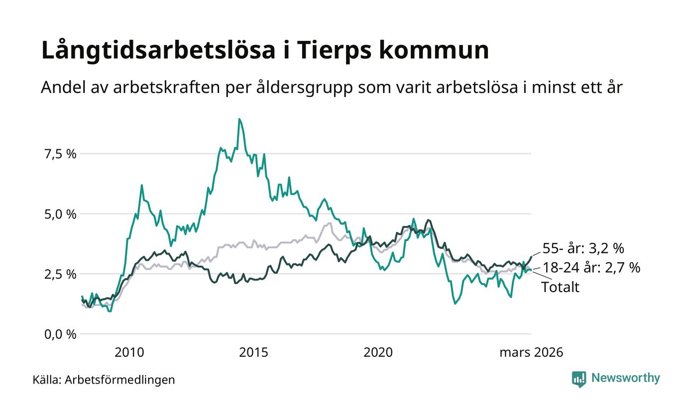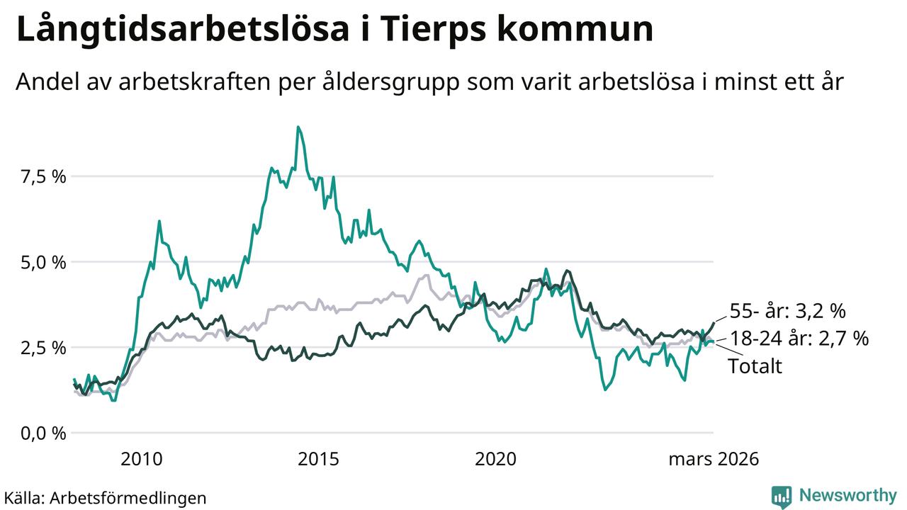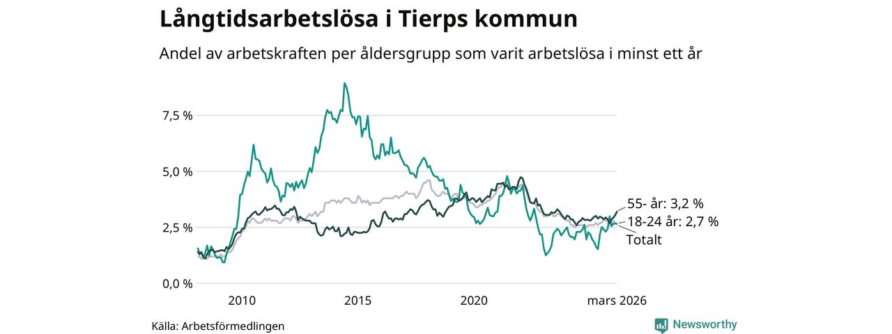 Av de 261 personerna som varit arbetslösa i mer än ett år i Tierps kommun är 77 personer mellan 55 och 661 år och 24 är mellan 18 och 24 år. För den äldre gruppen är andelen arbetslösa 3,2 procent medan den i den yngre gruppen är 2,7 procent. Även i riket som helhet är långtidsarbetslösheten högre i gruppen äldre.