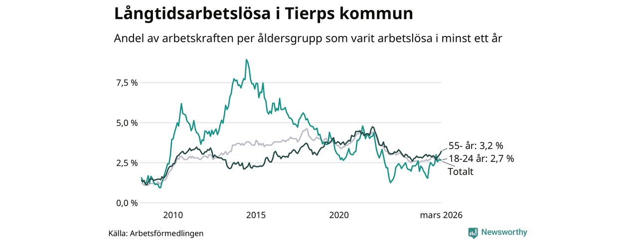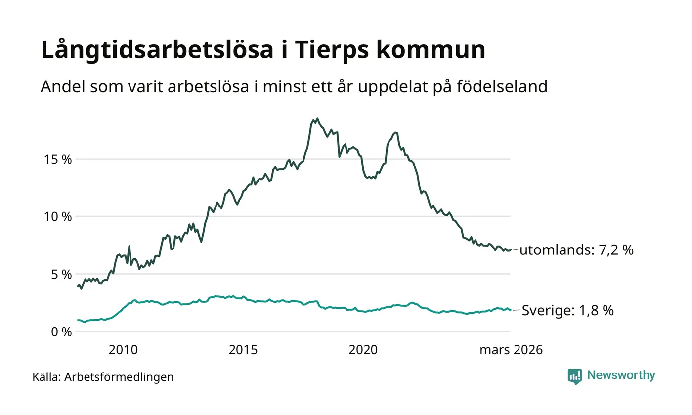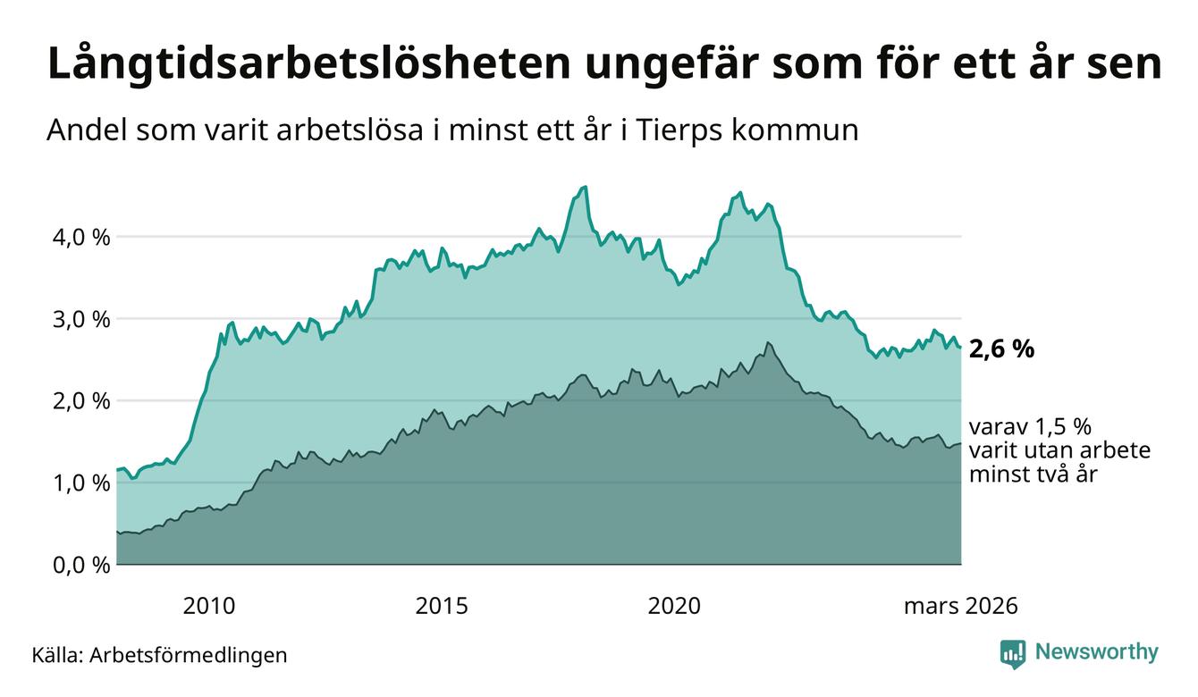 I mars hade 261 Tierpsbor varit arbetslösa i minst ett år, vilket är två färre än månaden innan. 261 personer motsvarar 2,6 procent av arbetskraften i kommunen – andelen långtidsarbetslösa är ungefär på samma nivå som för ett år sedan.