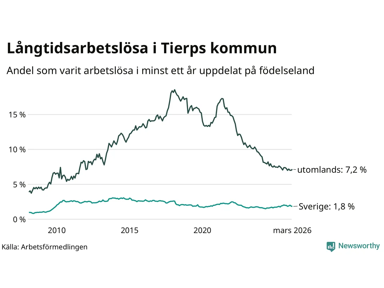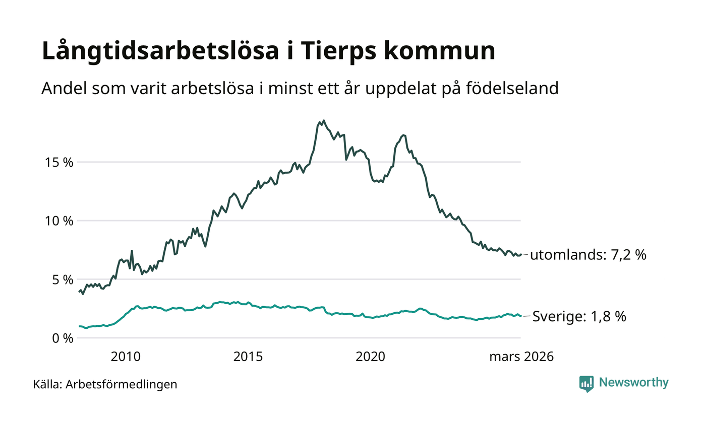 154 av de långtidsarbetslösa i Tierp är födda i Sverige, medan 107 är födda utomlands. Det innebär att långtidsarbetslösheten bland Sverigefödda är 1,8 procent, medan den är fyra gånger så hög – 7,2 procent – bland födda utomlands. Även i riket som helhet är arbetslösheten högre bland utrikesfödda.