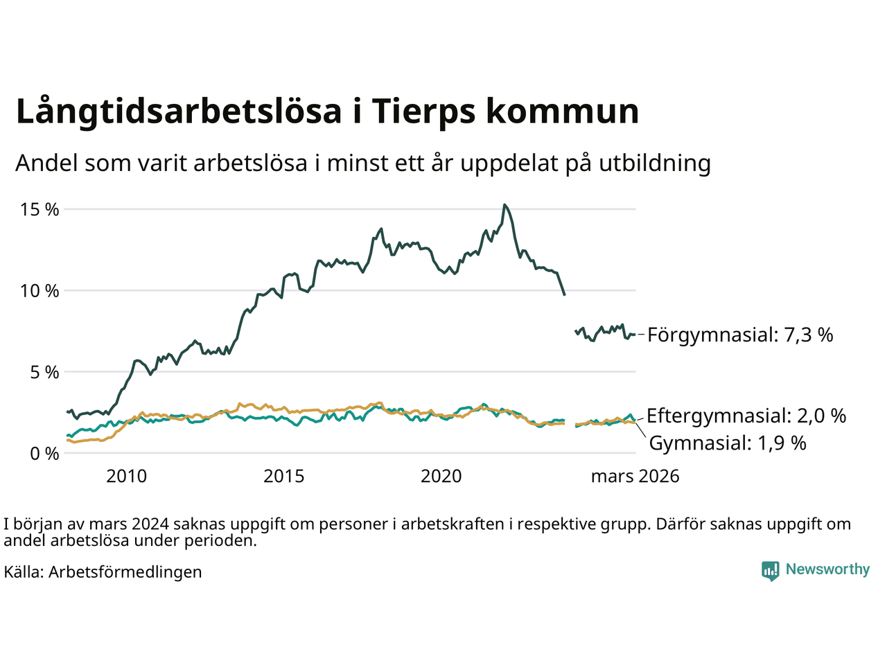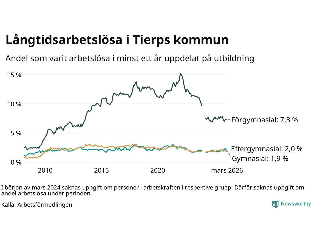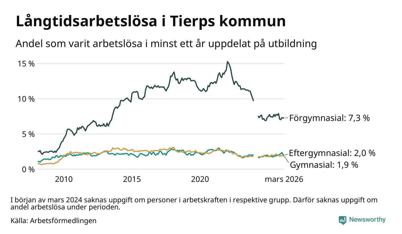 Andelen som varit utan arbete i minst ett år i Tierp var ungefär lika stor i mars jämfört med samma månad för ett år sedan. Det visar Arbetsfömedlingens senaste månadsstatistik.