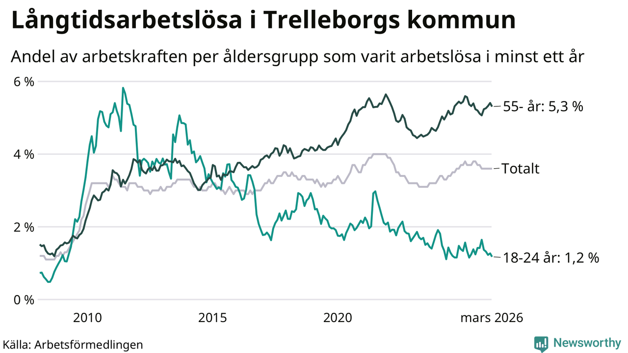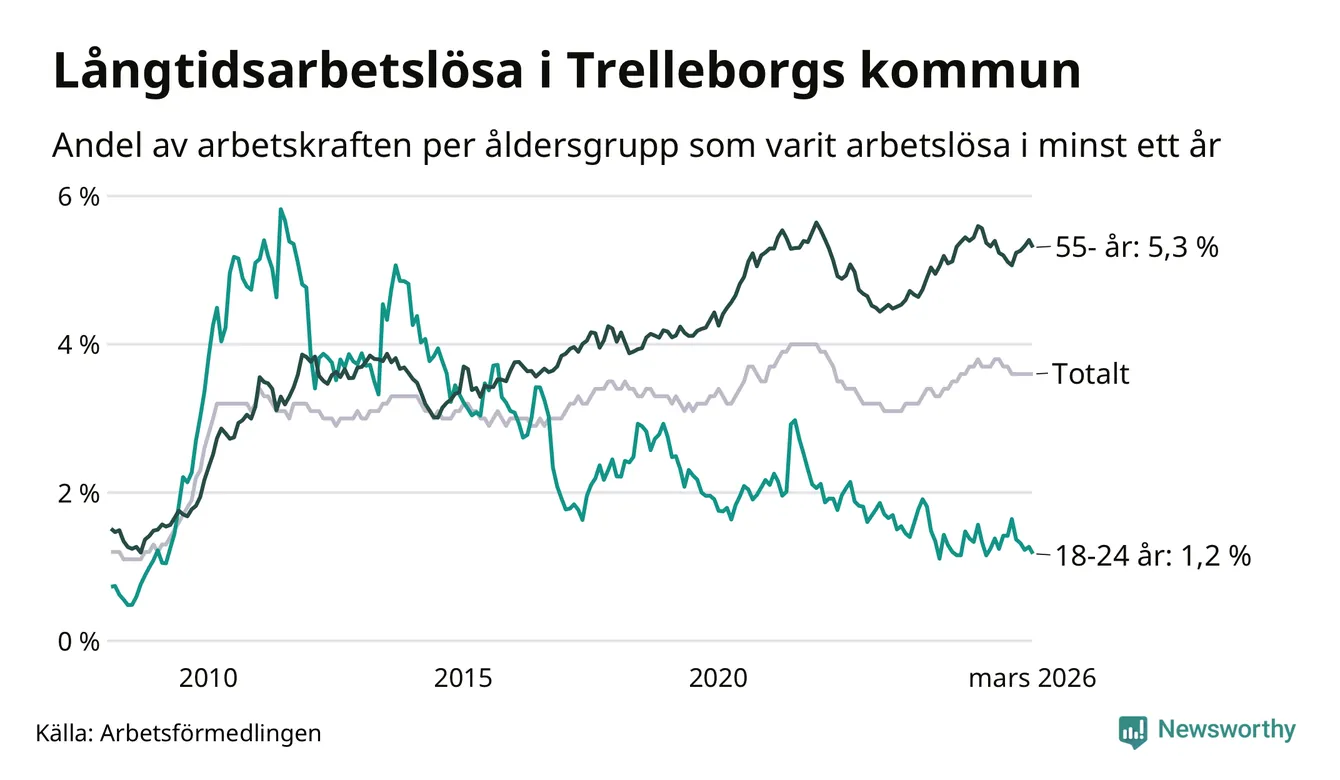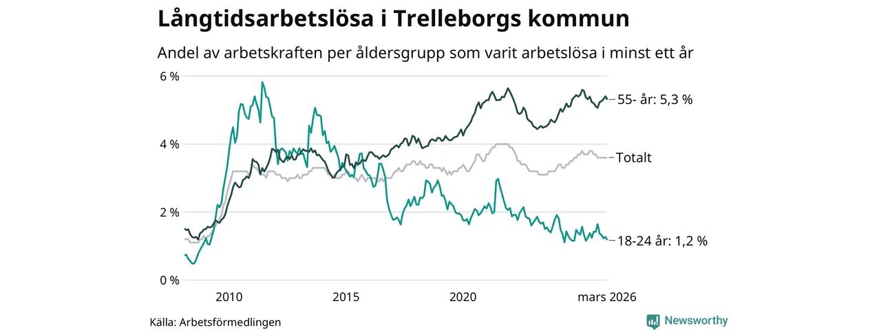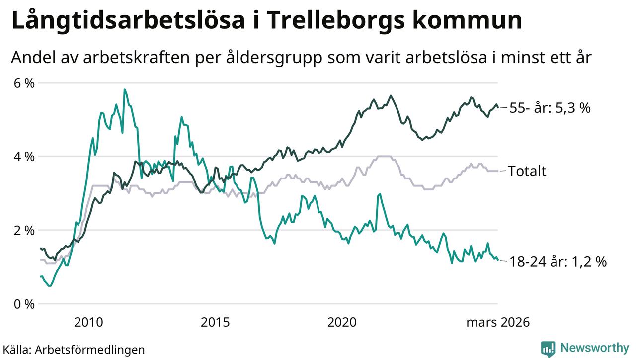 Av de 847 personerna som varit arbetslösa i mer än ett år i Trelleborgs kommun är 296 personer mellan 55 och 661 år och 26 är mellan 18 och 24 år. För den äldre gruppen är andelen arbetslösa 5,3 procent medan den i den yngre gruppen är 1,2 procent. Även i riket som helhet är långtidsarbetslösheten högre i gruppen äldre.