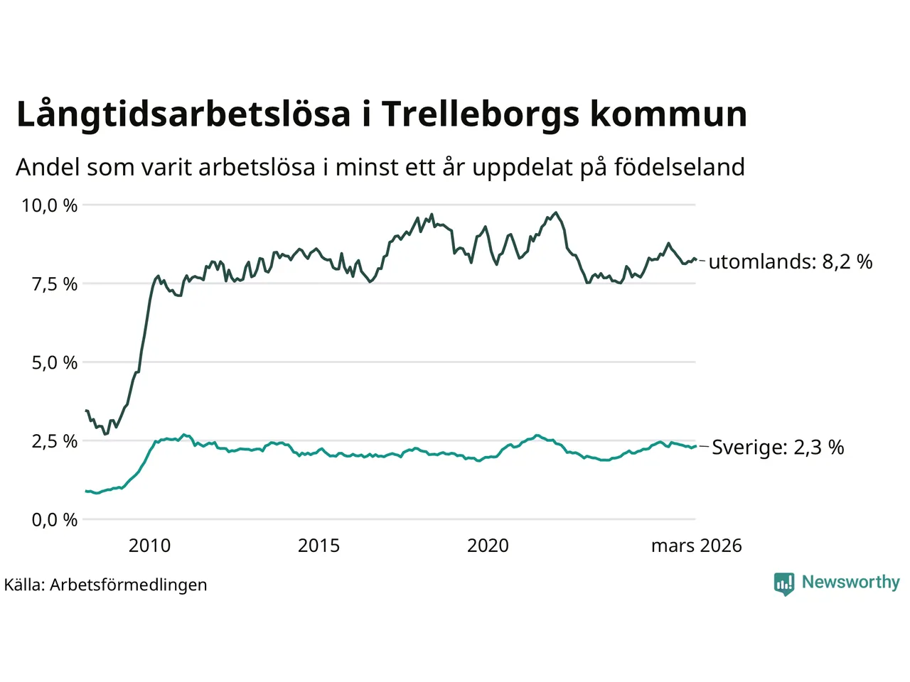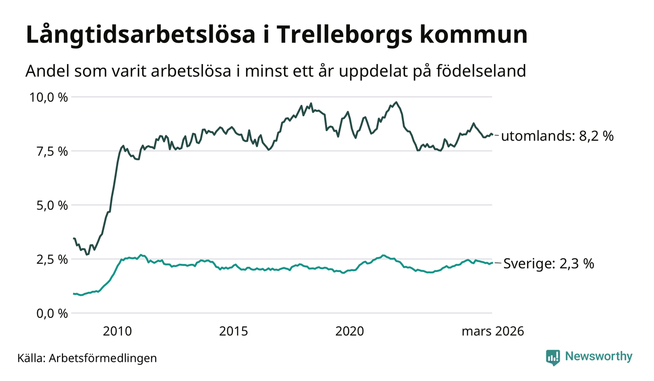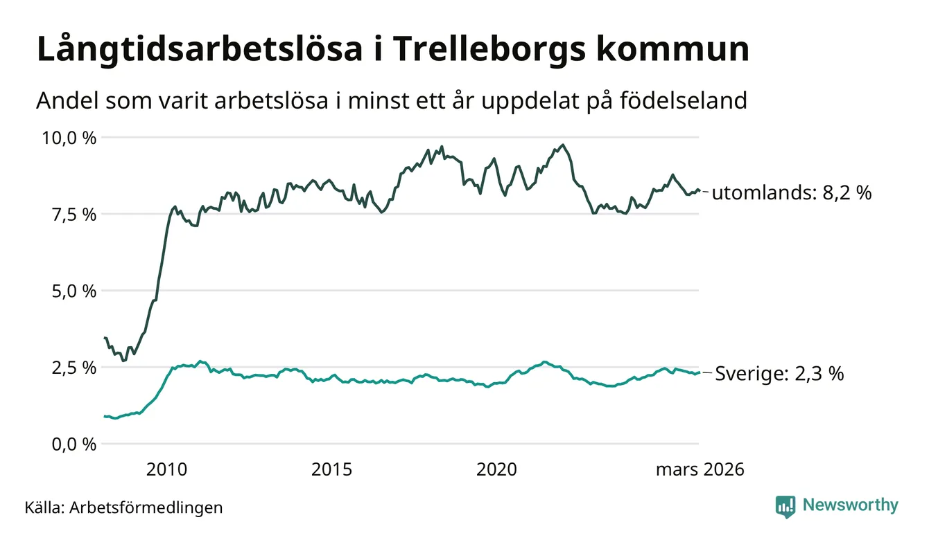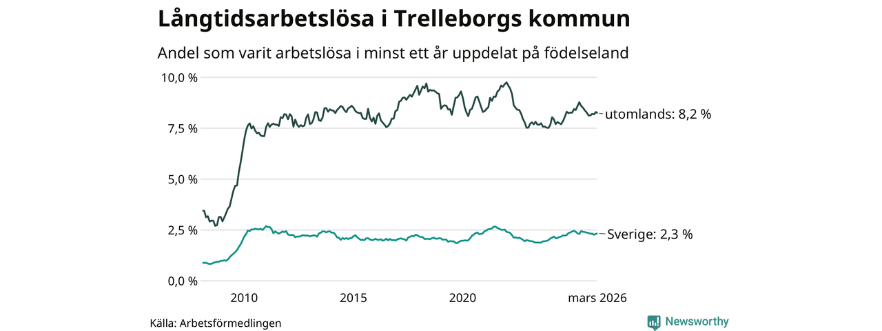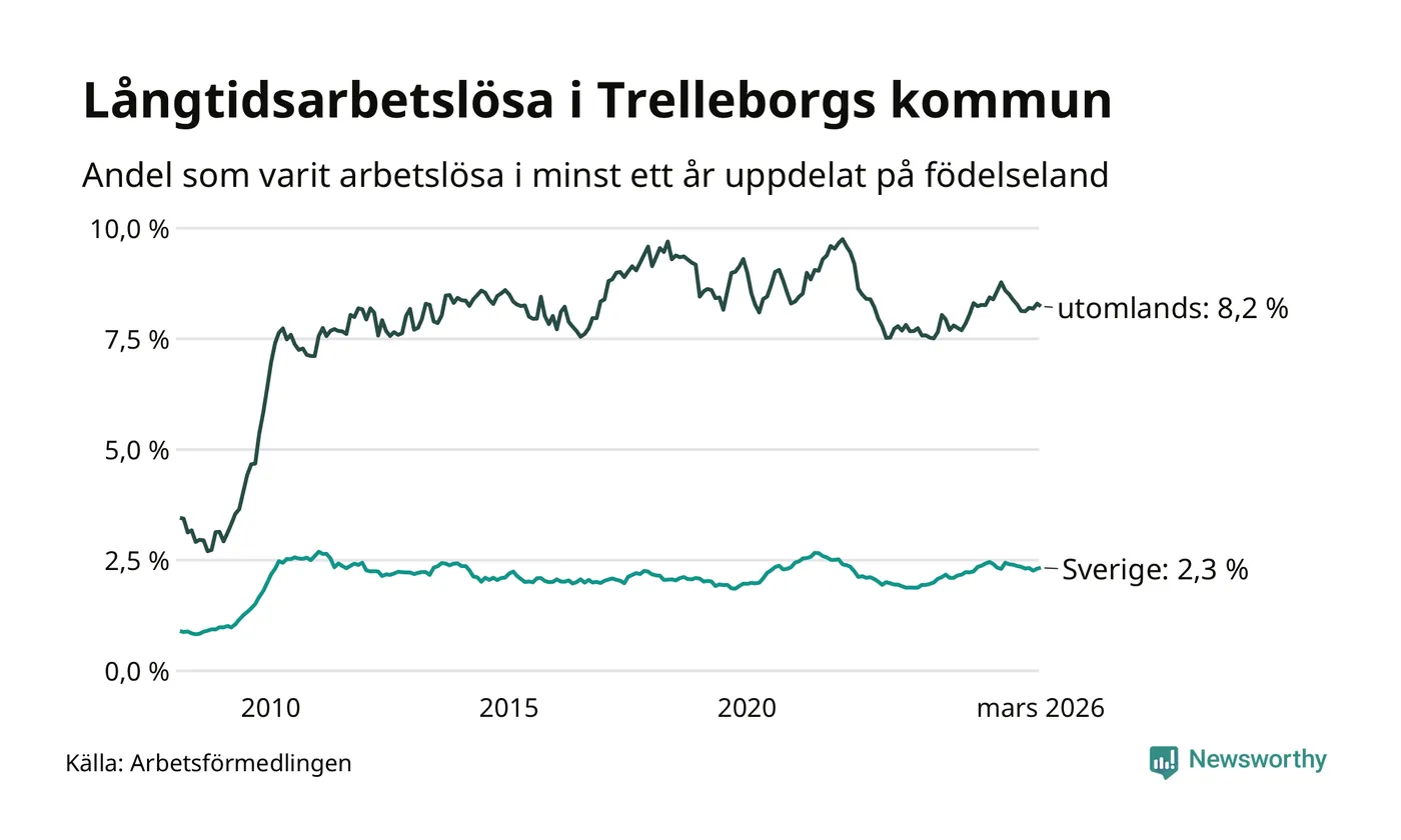 424 av de långtidsarbetslösa i Trelleborg är födda i Sverige, medan 423 är födda utomlands. Det innebär att långtidsarbetslösheten bland Sverigefödda är 2,3 procent, medan den är fyra gånger så hög – 8,2 procent – bland födda utomlands. Även i riket som helhet är arbetslösheten högre bland utrikesfödda.