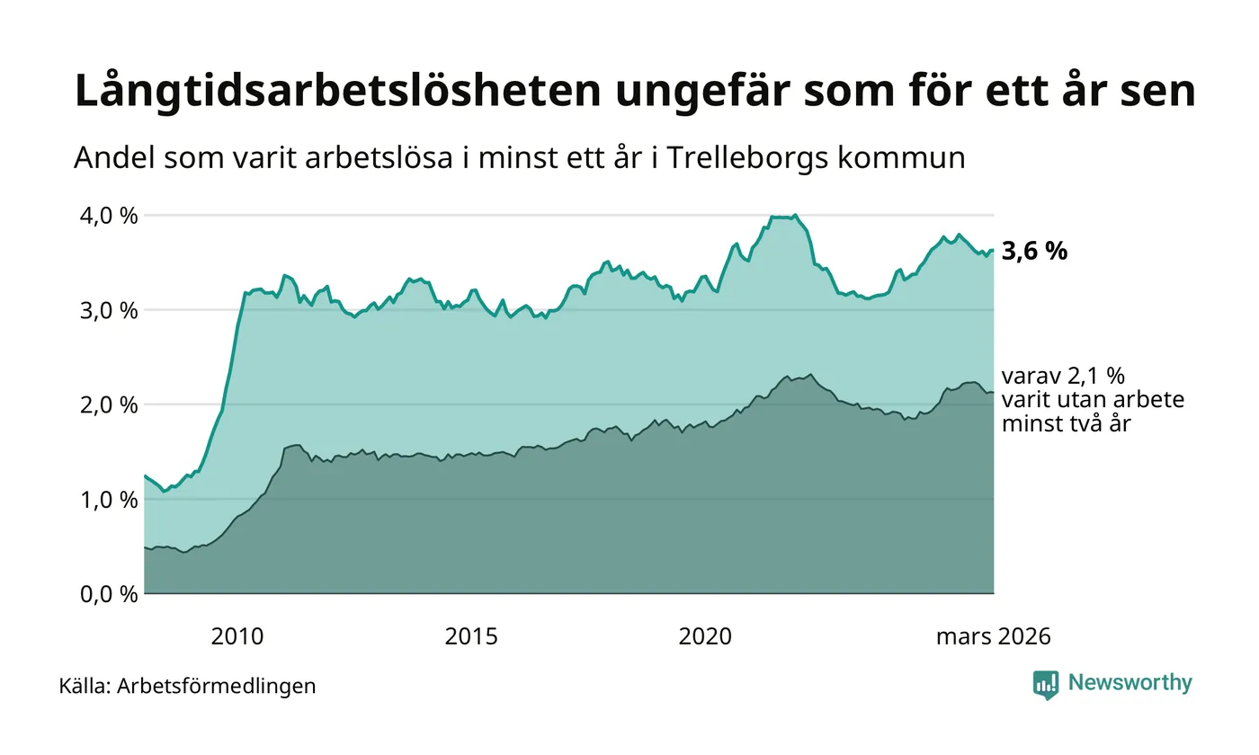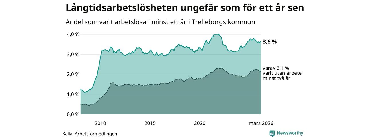 I mars hade 847 Trelleborgsbor varit arbetslösa i minst ett år, vilket är en fler än månaden innan. 847 personer motsvarar 3,6 procent av arbetskraften i kommunen – andelen långtidsarbetslösa är ungefär på samma nivå som för ett år sedan.