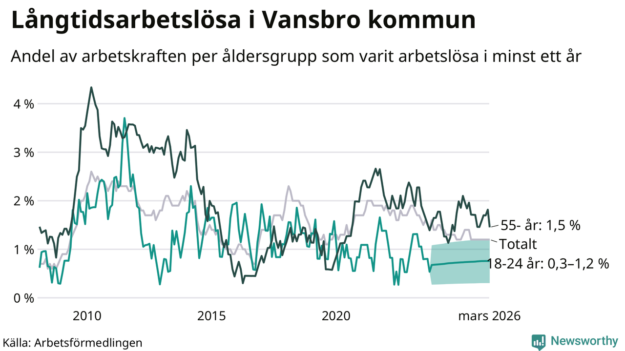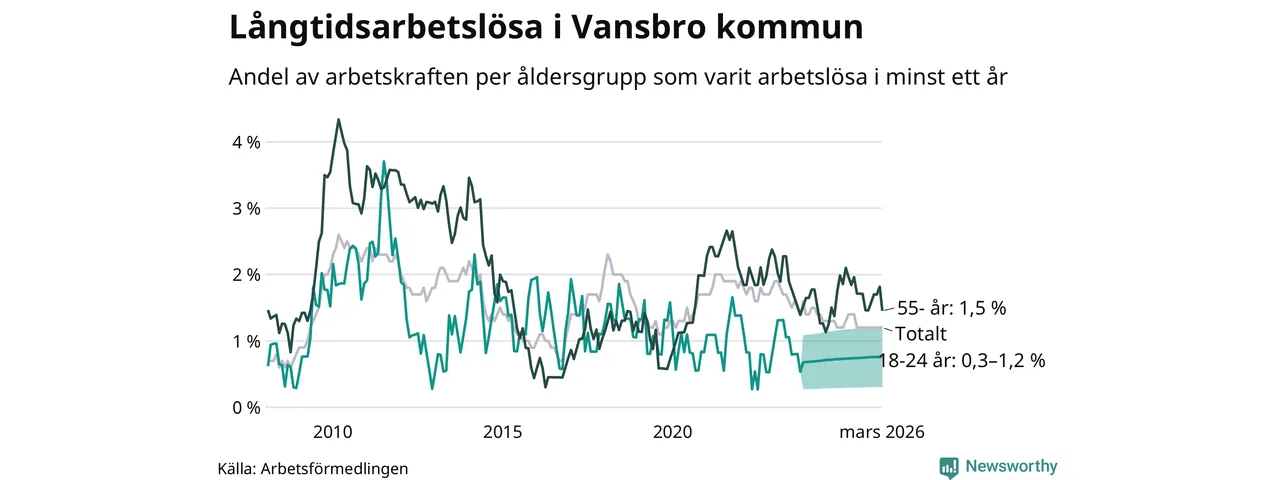 Av de 38 personerna som varit arbetslösa i mer än ett år i Vansbro kommun är tolv personer mellan 55 och 661 år och mellan en och fyra är mellan 18 och 24 år. För den äldre gruppen är andelen arbetslösa 1,5 procent medan den i den yngre gruppen är mellan 0,3 och 1,2 procent. Även i riket som helhet är långtidsarbetslösheten högre i gruppen äldre.