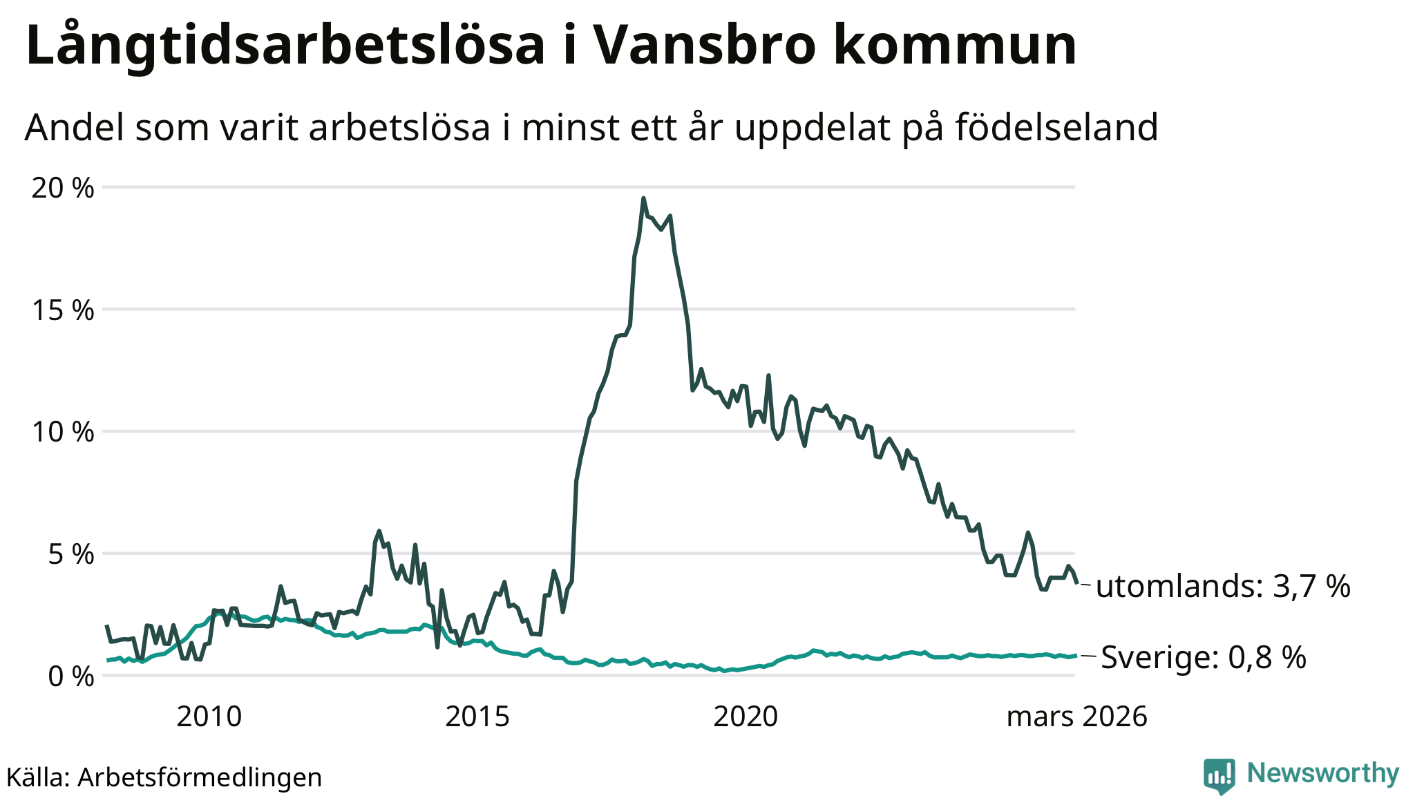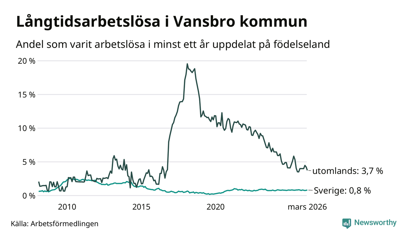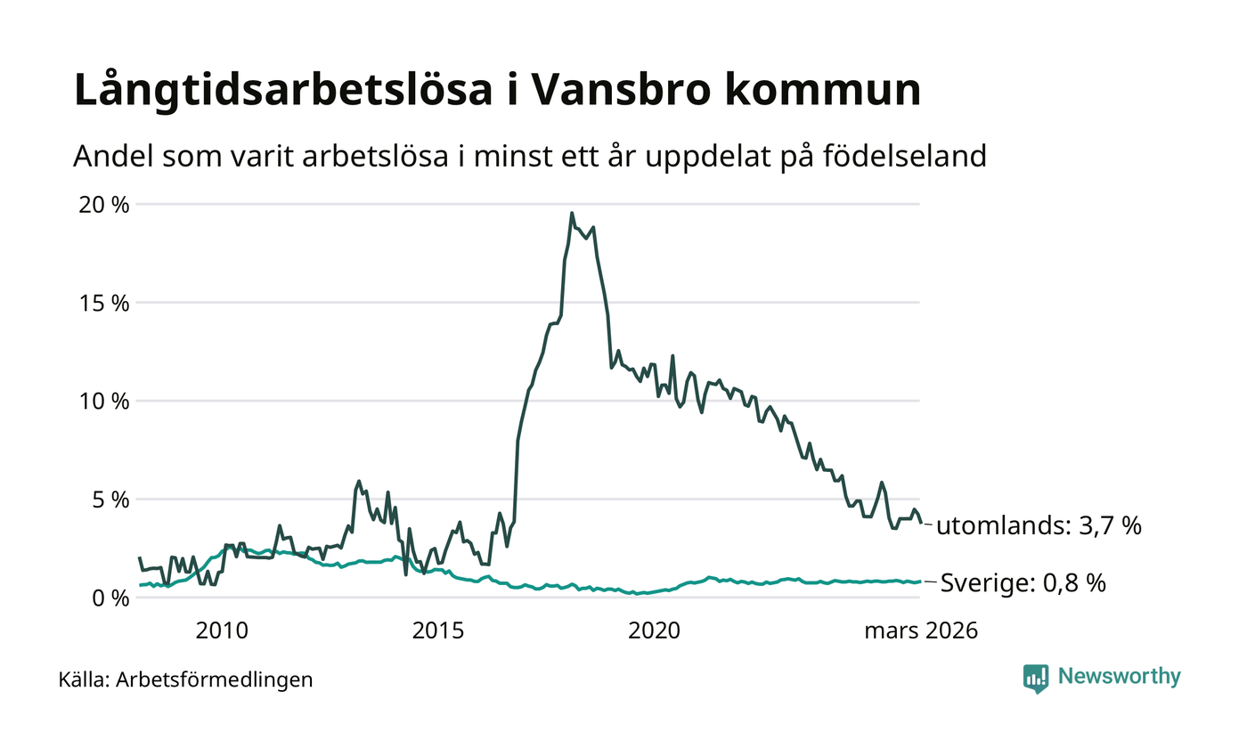 23 av de långtidsarbetslösa i Vansbro är födda i Sverige, medan 15 är födda utomlands. Det innebär att långtidsarbetslösheten bland Sverigefödda är 0,8 procent, medan den är fem gånger så hög – 3,7 procent – bland födda utomlands. Även i riket som helhet är arbetslösheten högre bland utrikesfödda.