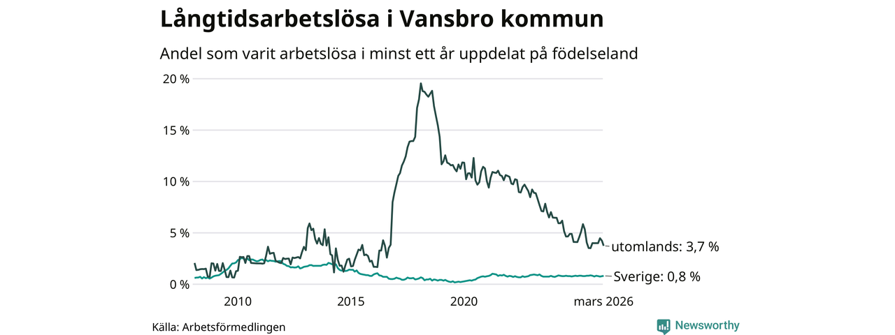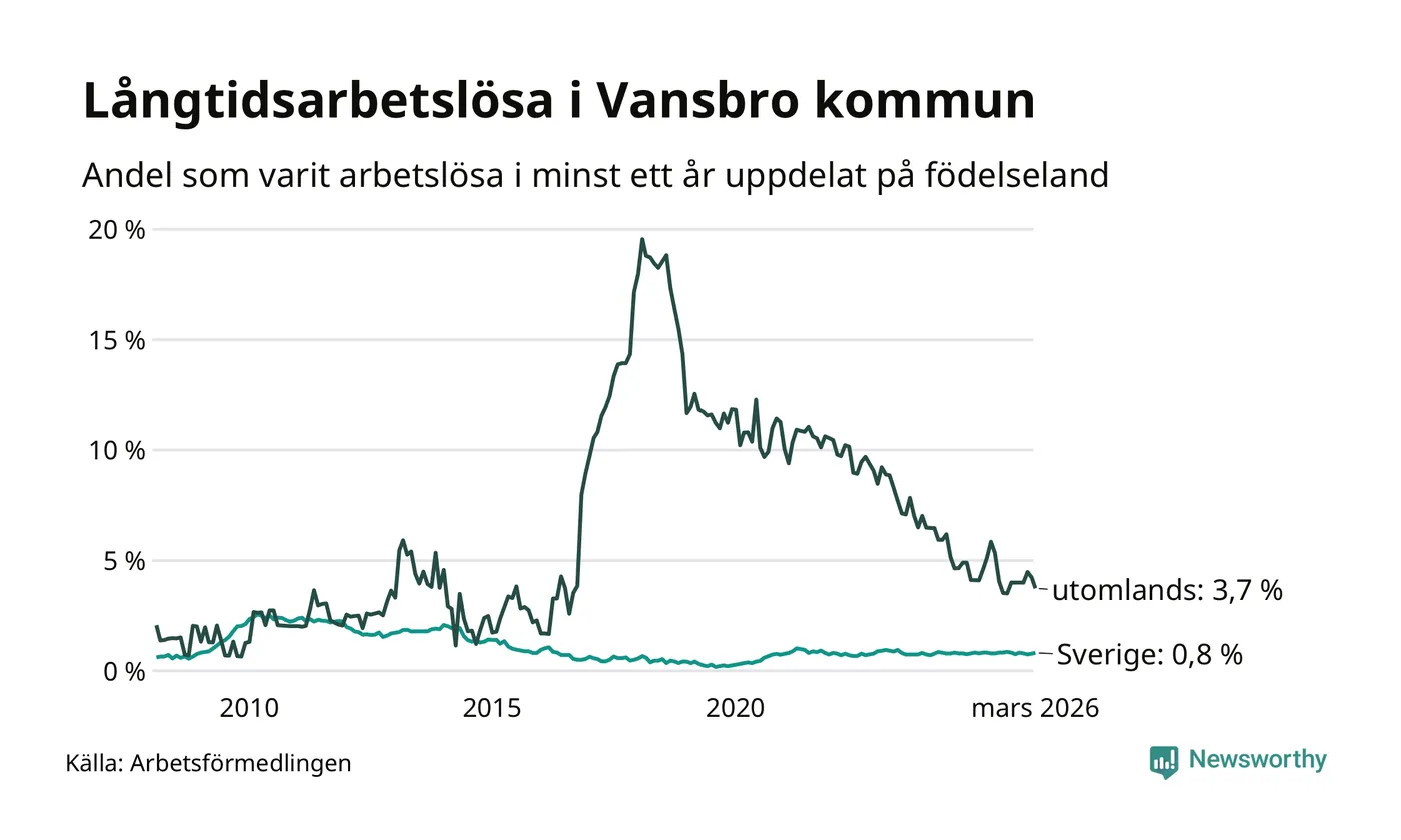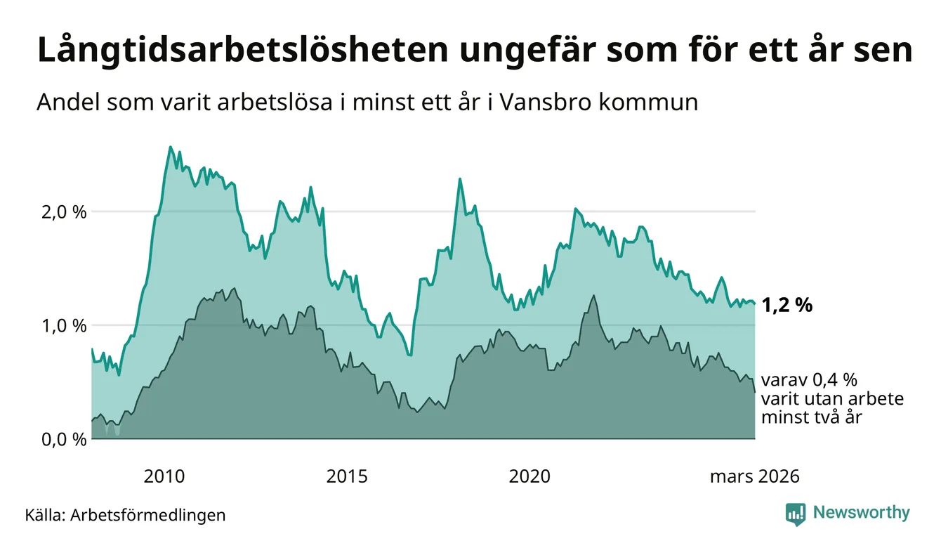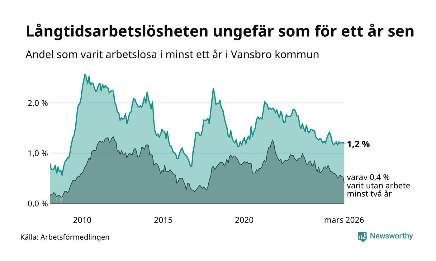 I mars hade 38 Vansbrobor varit arbetslösa i minst ett år, vilket är en färre än månaden innan. 38 personer motsvarar 1,2 procent av arbetskraften i kommunen – andelen långtidsarbetslösa är ungefär på samma nivå som för ett år sedan. Vansbro tillhör de kommuner som har lägst andel långtidsarbetslösa i hela landet just nu.
