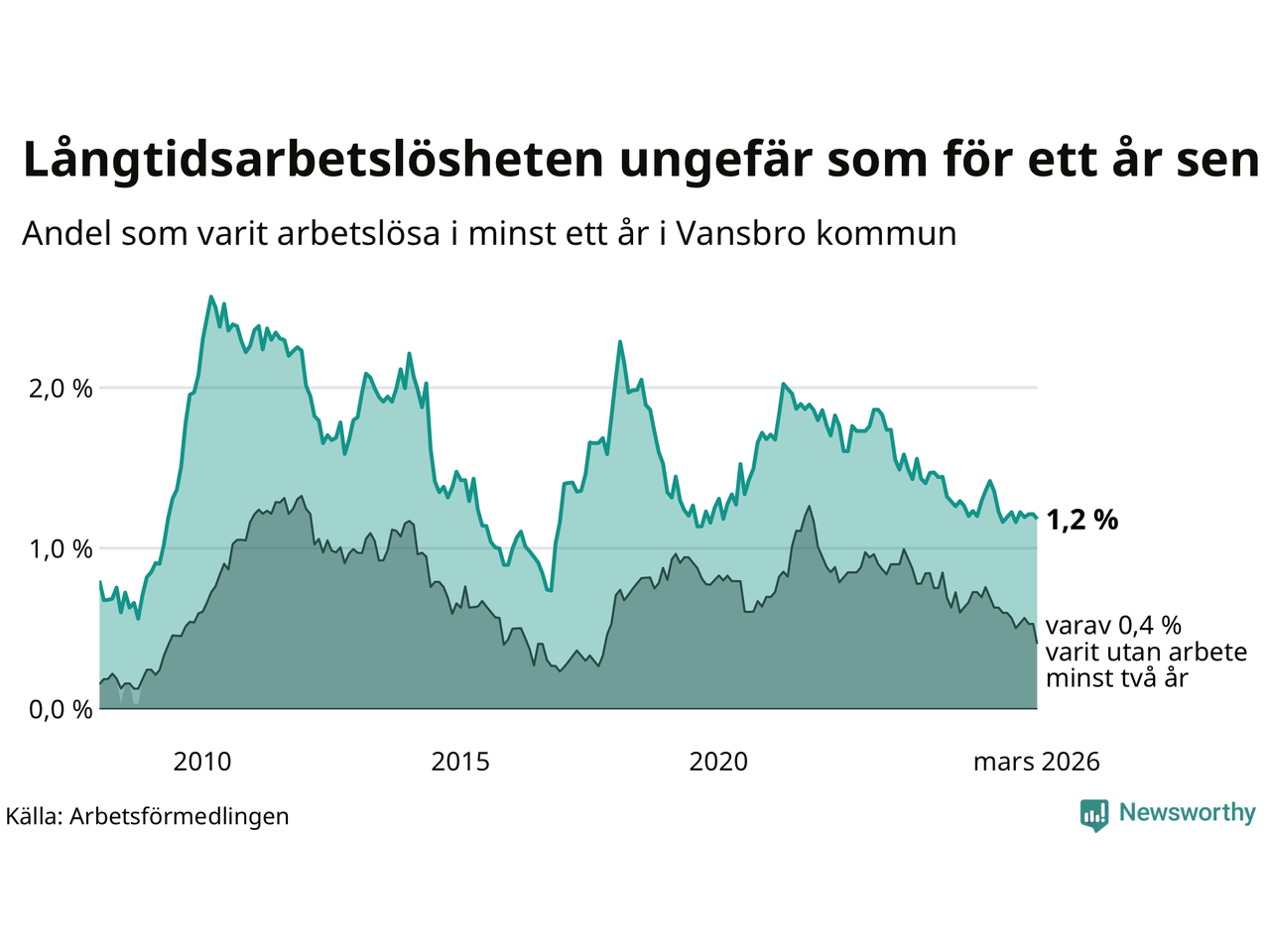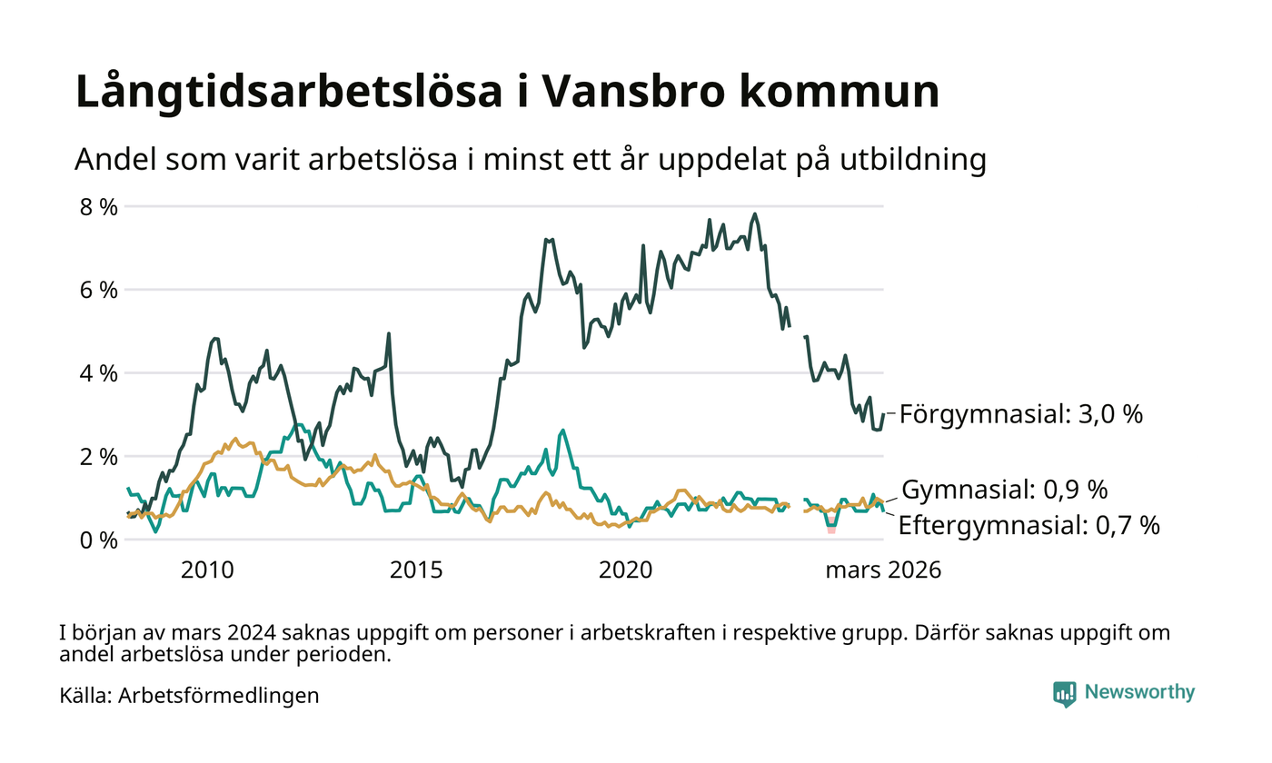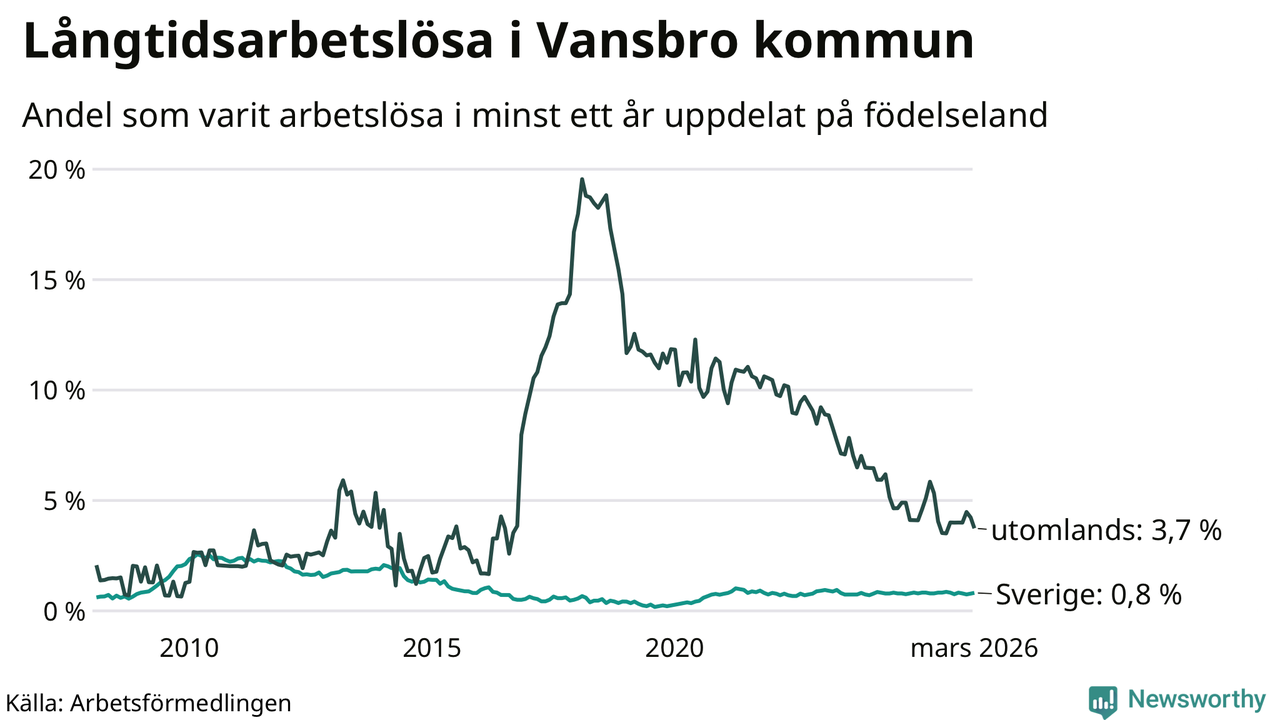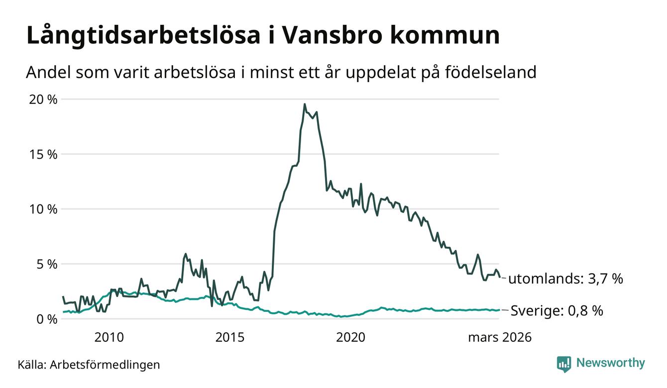 I mars hade 38 Vansbrobor varit arbetslösa i minst ett år, vilket är en färre än månaden innan. 38 personer motsvarar 1,2 procent av arbetskraften i kommunen – andelen långtidsarbetslösa är ungefär på samma nivå som för ett år sedan. Vansbro tillhör de kommuner som har lägst andel långtidsarbetslösa i hela landet just nu.