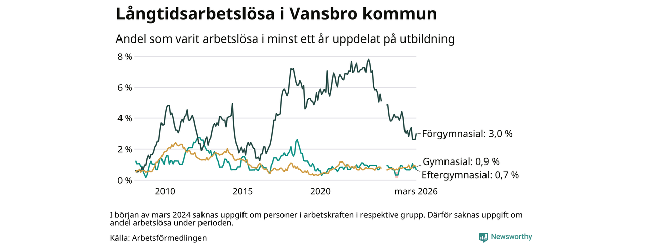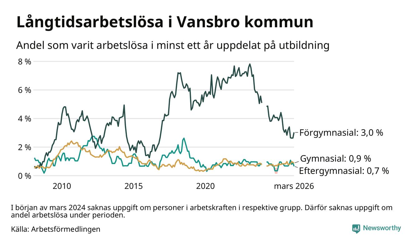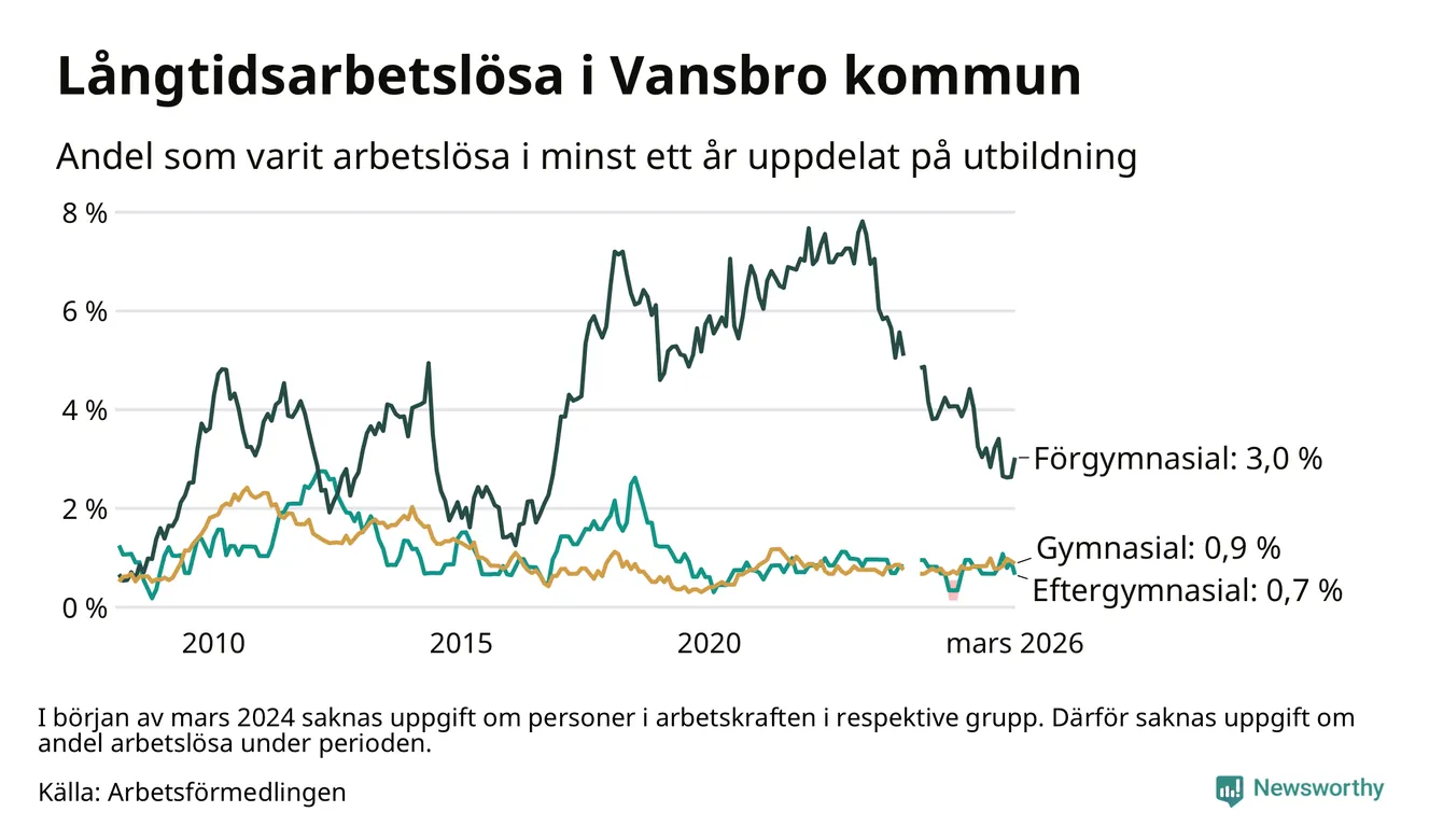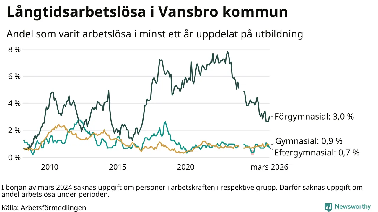 Andelen som varit utan arbete i minst ett år i Vansbro var ungefär lika stor i mars jämfört med samma månad för ett år sedan. Det visar Arbetsfömedlingens senaste månadsstatistik.