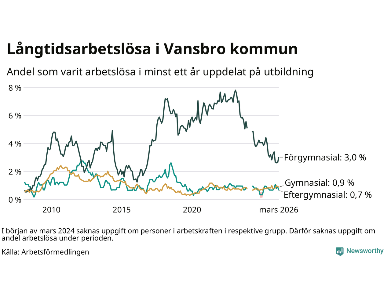 | Bland dem utan gymnasieutbildning | 3,0 % | 6,4 % | 7,8 % |