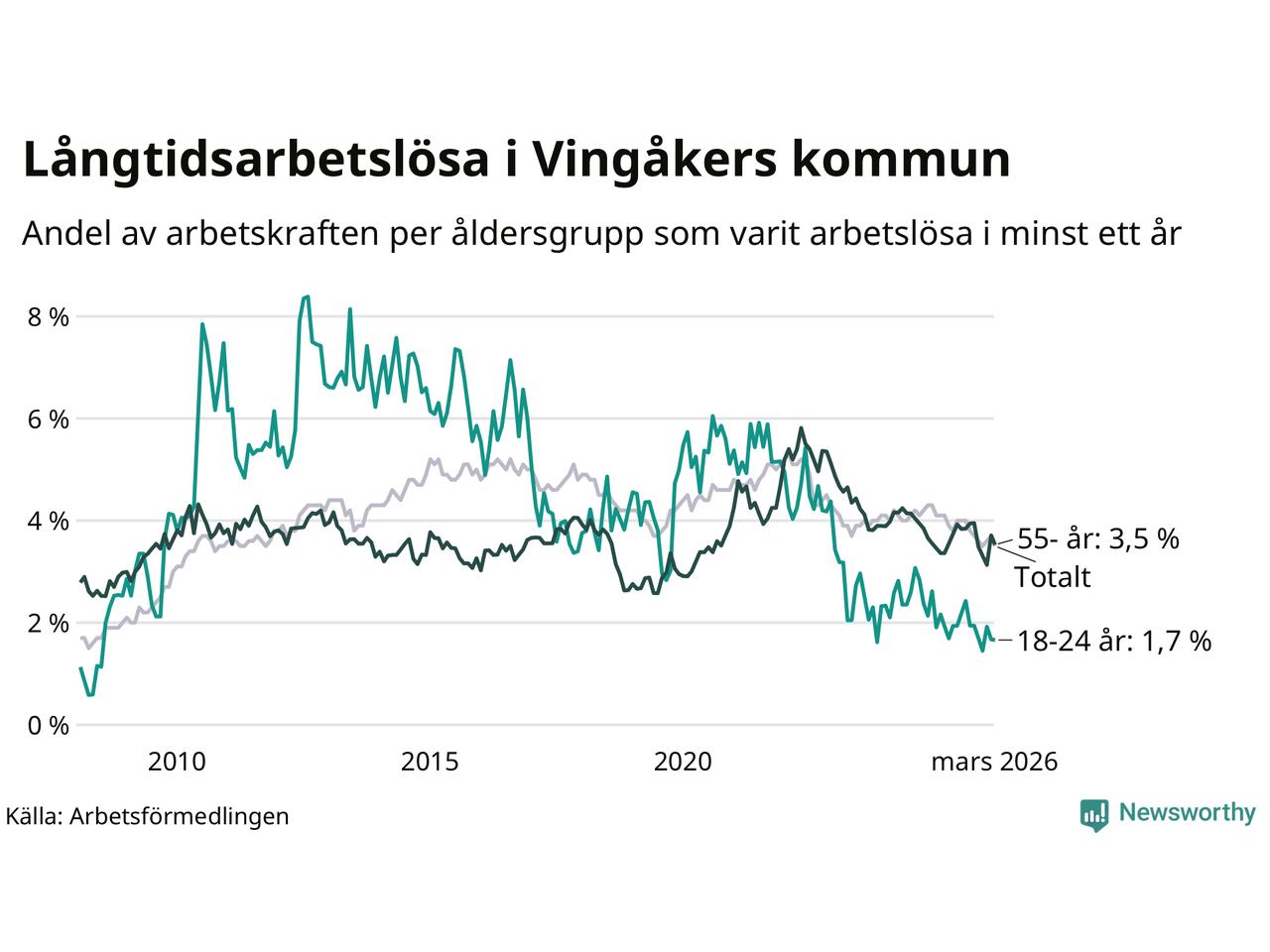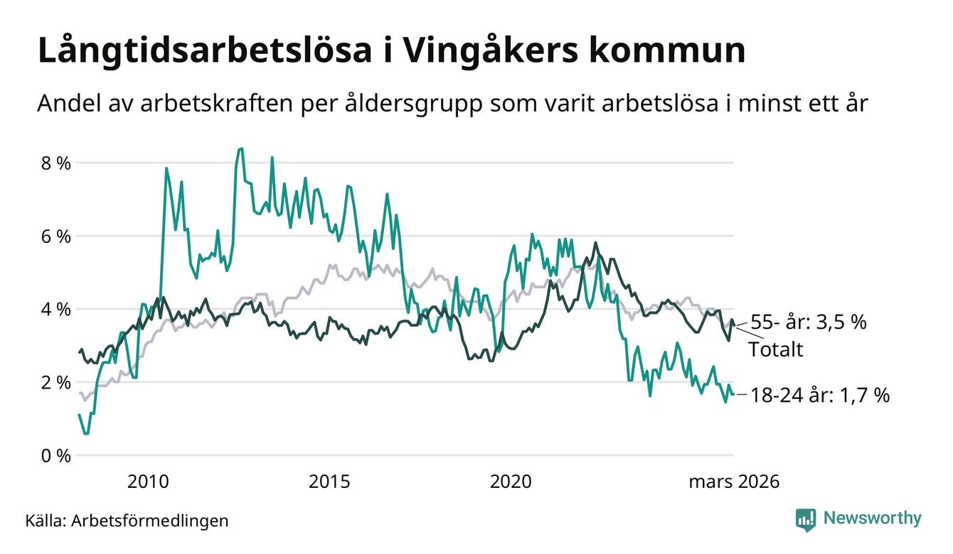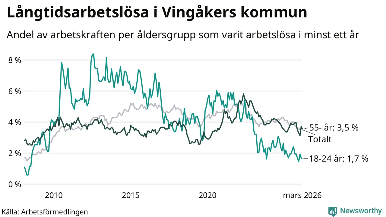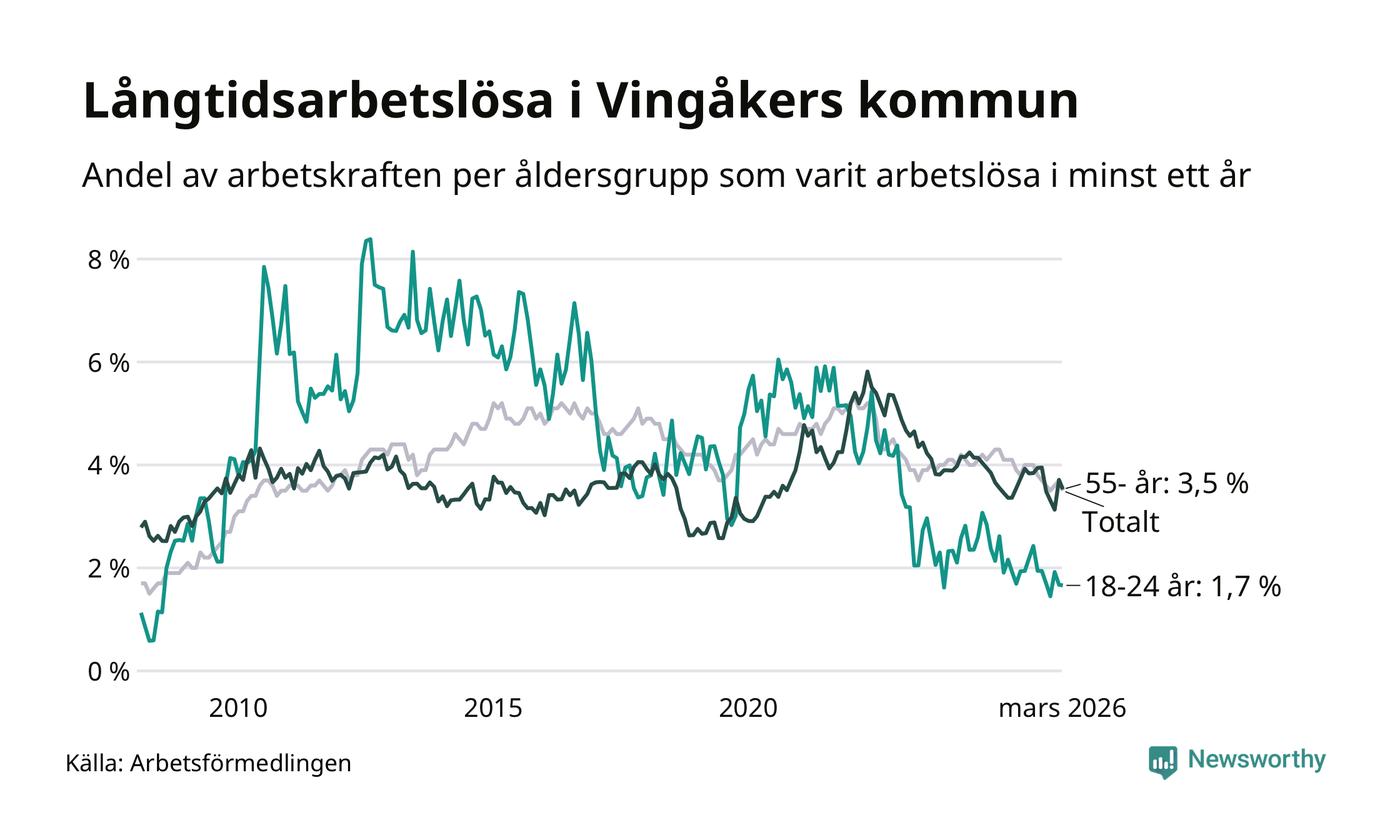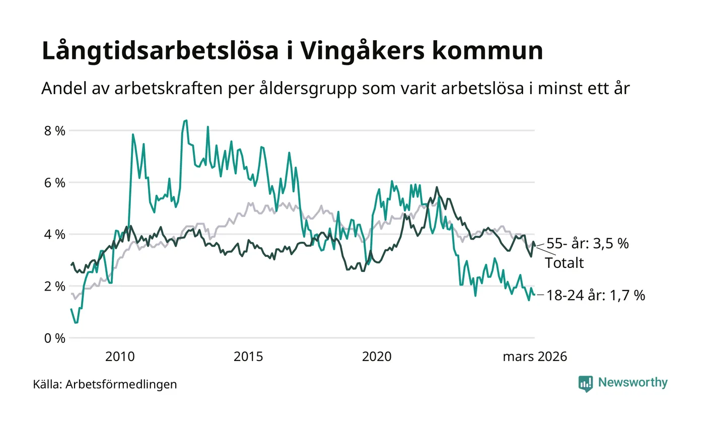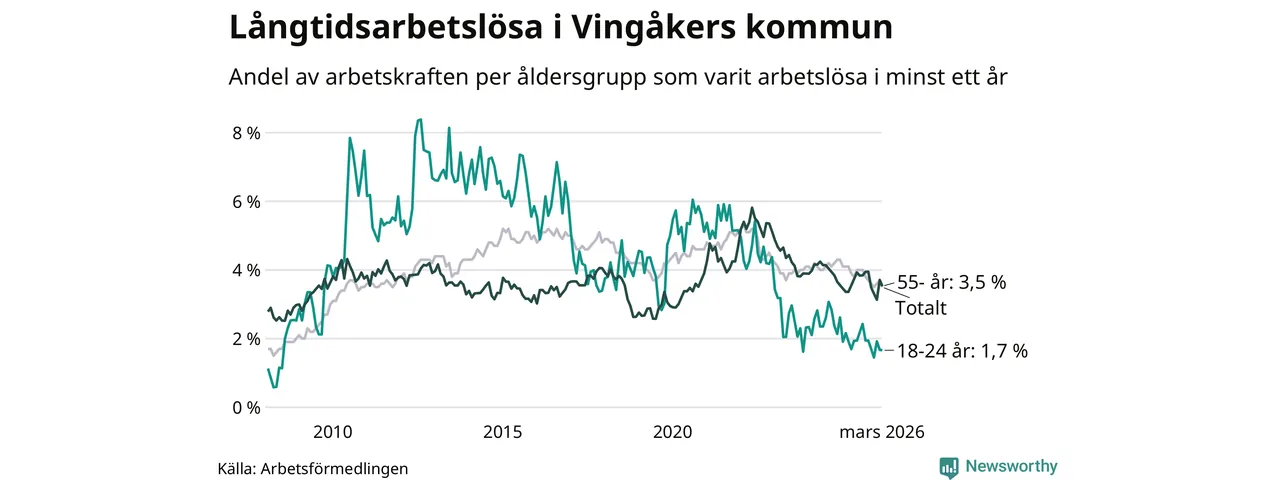 Av de 139 personerna som varit arbetslösa i mer än ett år i Vingåkers kommun är 37 personer mellan 55 och 661 år och sju är mellan 18 och 24 år. För den äldre gruppen är andelen arbetslösa 3,5 procent medan den i den yngre gruppen är 1,7 procent. Även i riket som helhet är långtidsarbetslösheten högre i gruppen äldre.