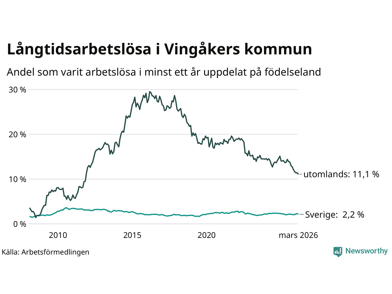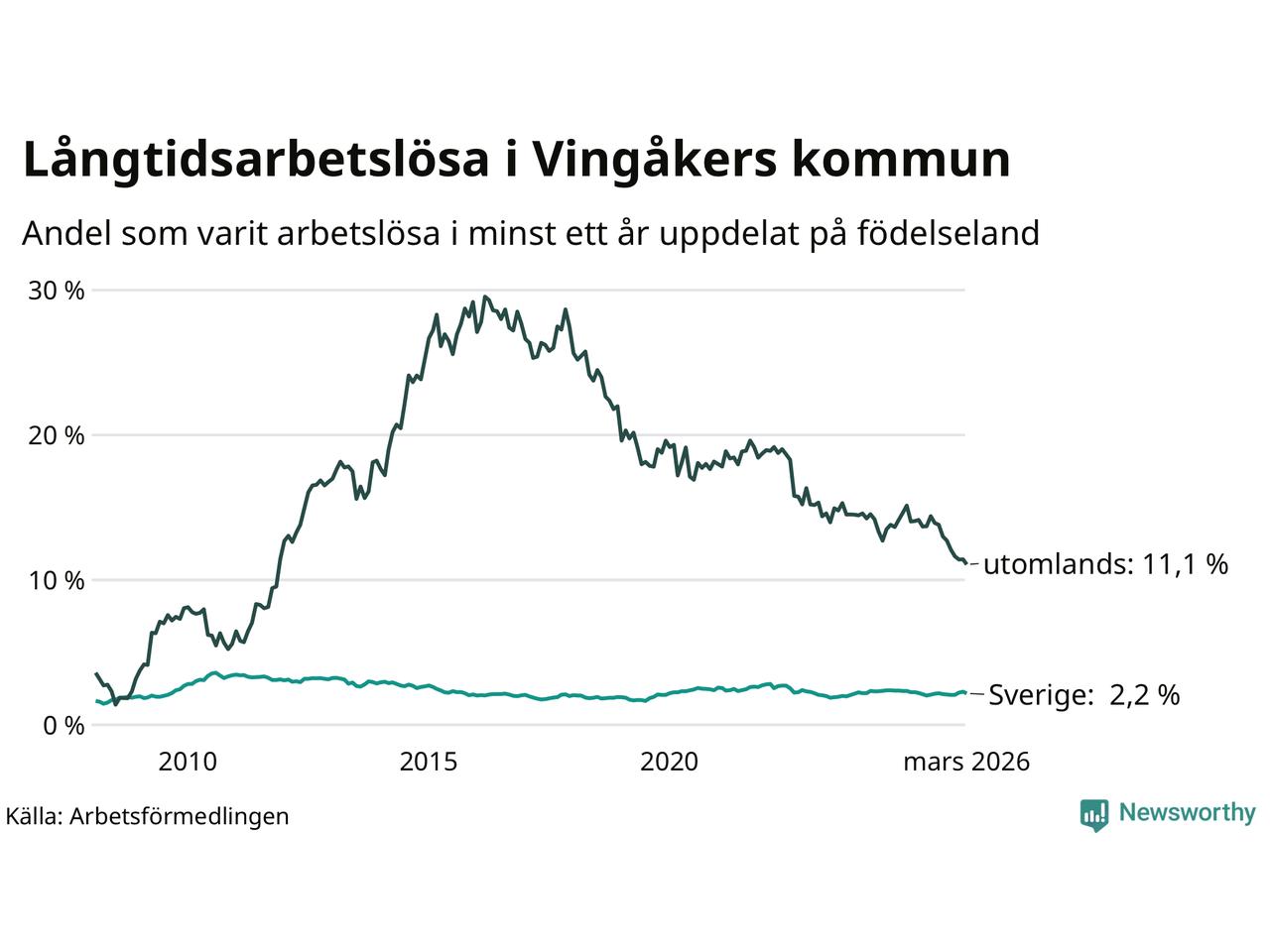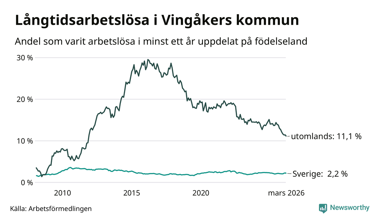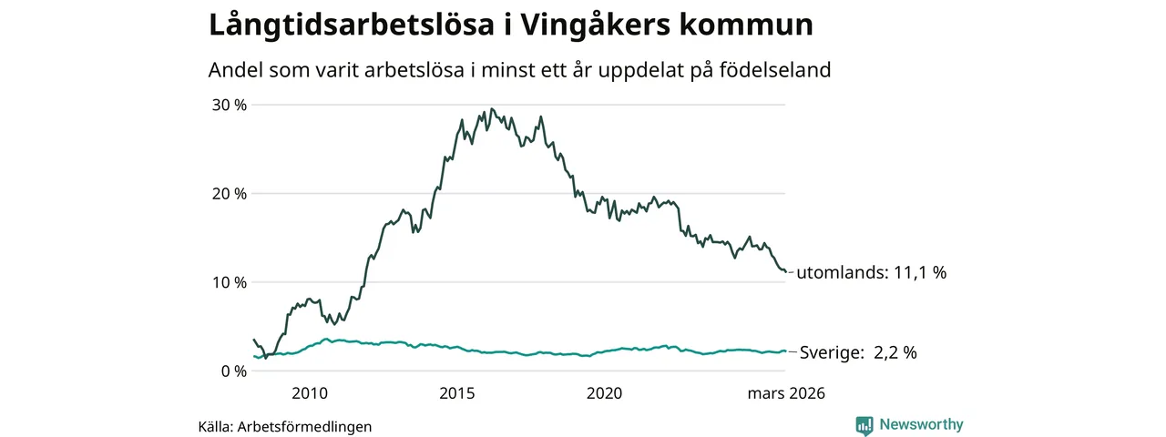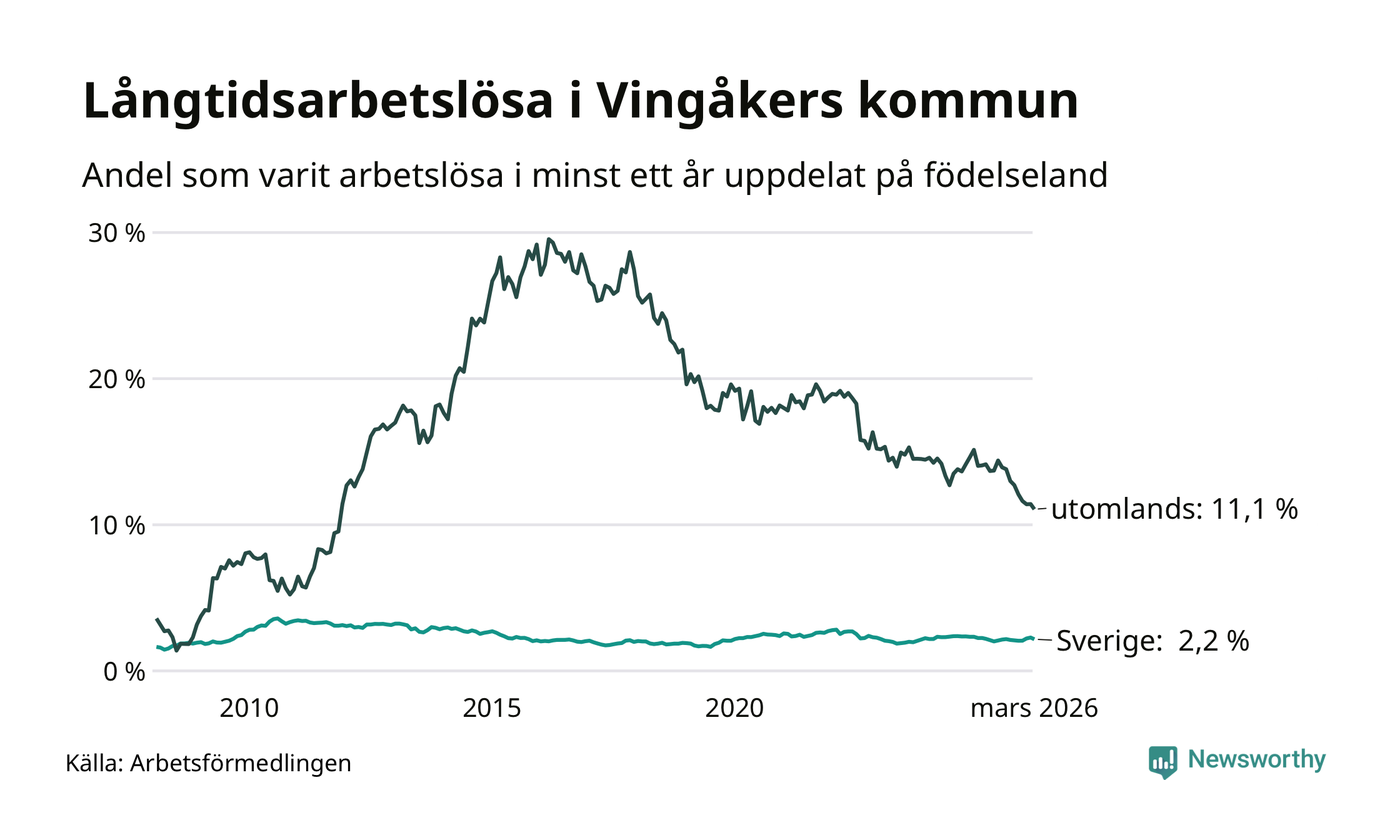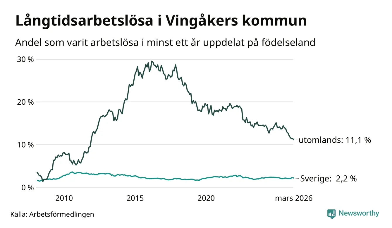 72 av de långtidsarbetslösa i Vingåker är födda i Sverige, medan 67 är födda utomlands. Det innebär att långtidsarbetslösheten bland Sverigefödda är 2,2 procent, medan den är fem gånger så hög – 11,1 procent – bland födda utomlands. Även i riket som helhet är arbetslösheten högre bland utrikesfödda.