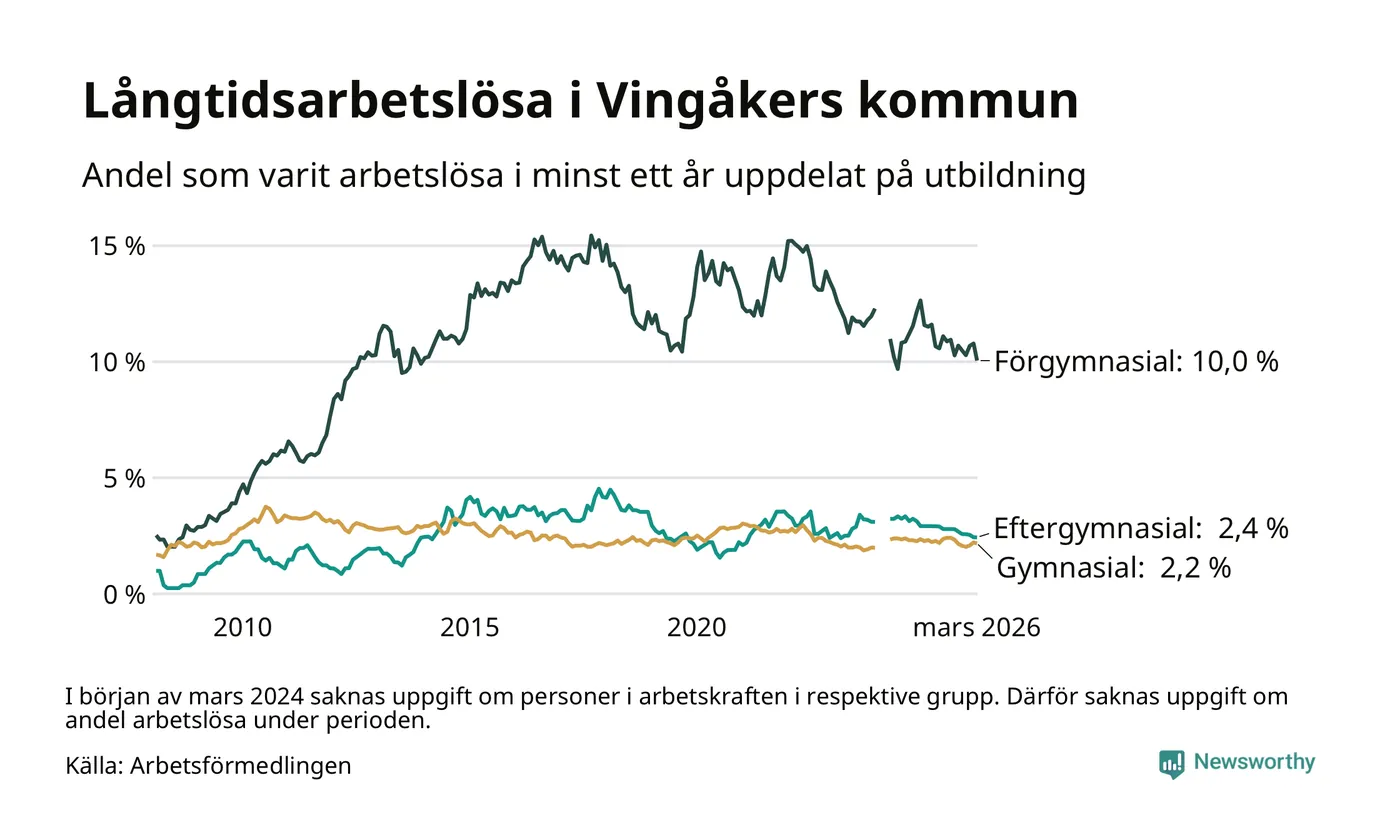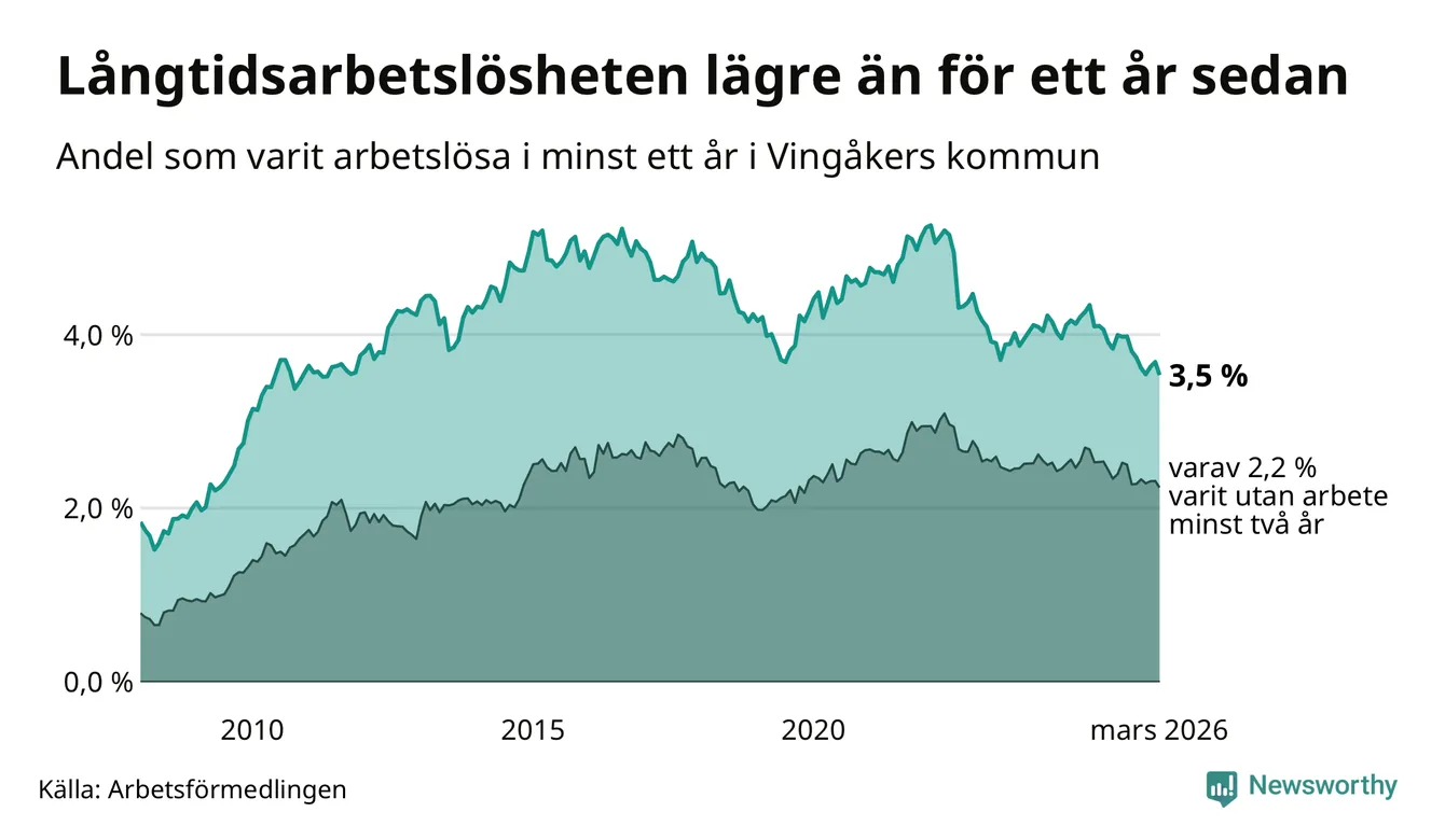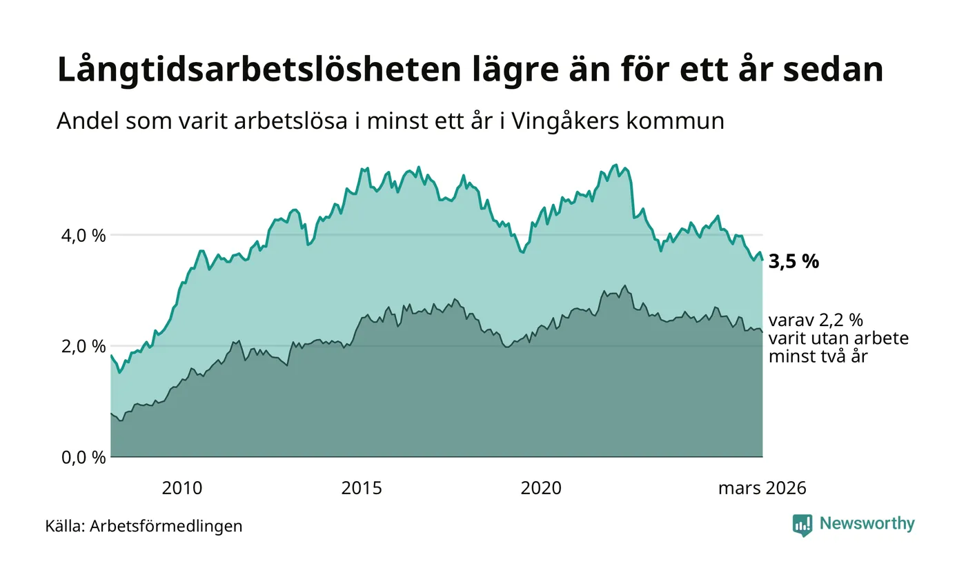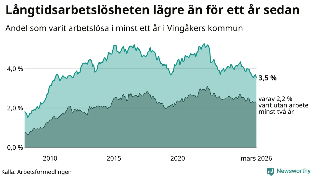 I mars hade 139 Vingåkersbor varit arbetslösa i minst ett år, vilket är sex färre än månaden innan. 139 personer motsvarar 3,5 procent av arbetskraften i kommunen – andelen långtidsarbetslösa är 0,6 procentenheter lägre än samma månad för ett år sedan.