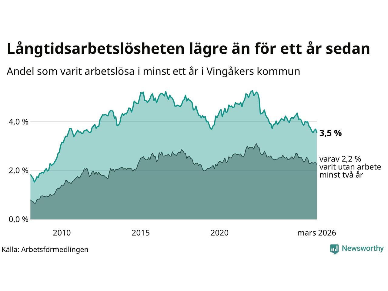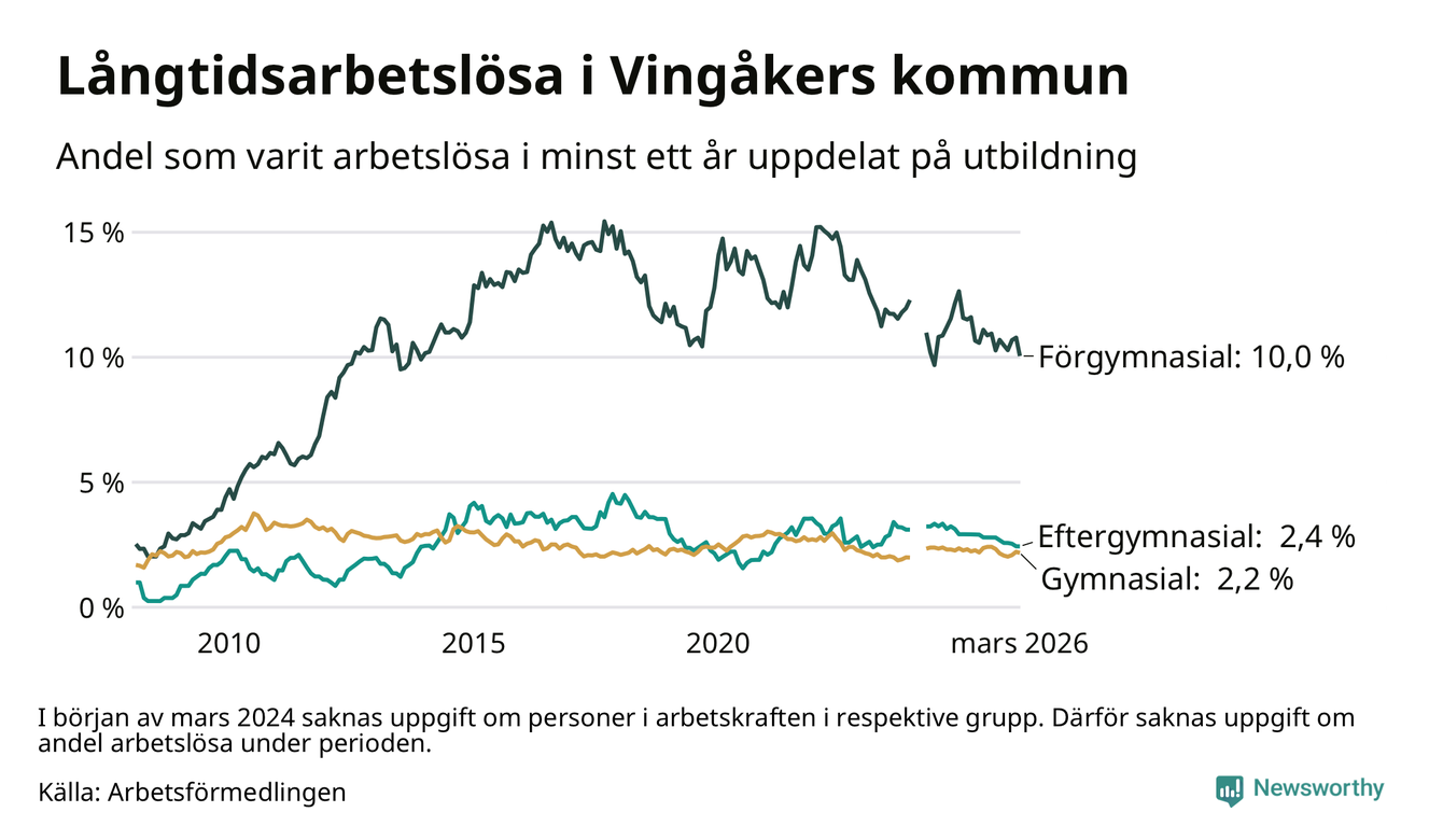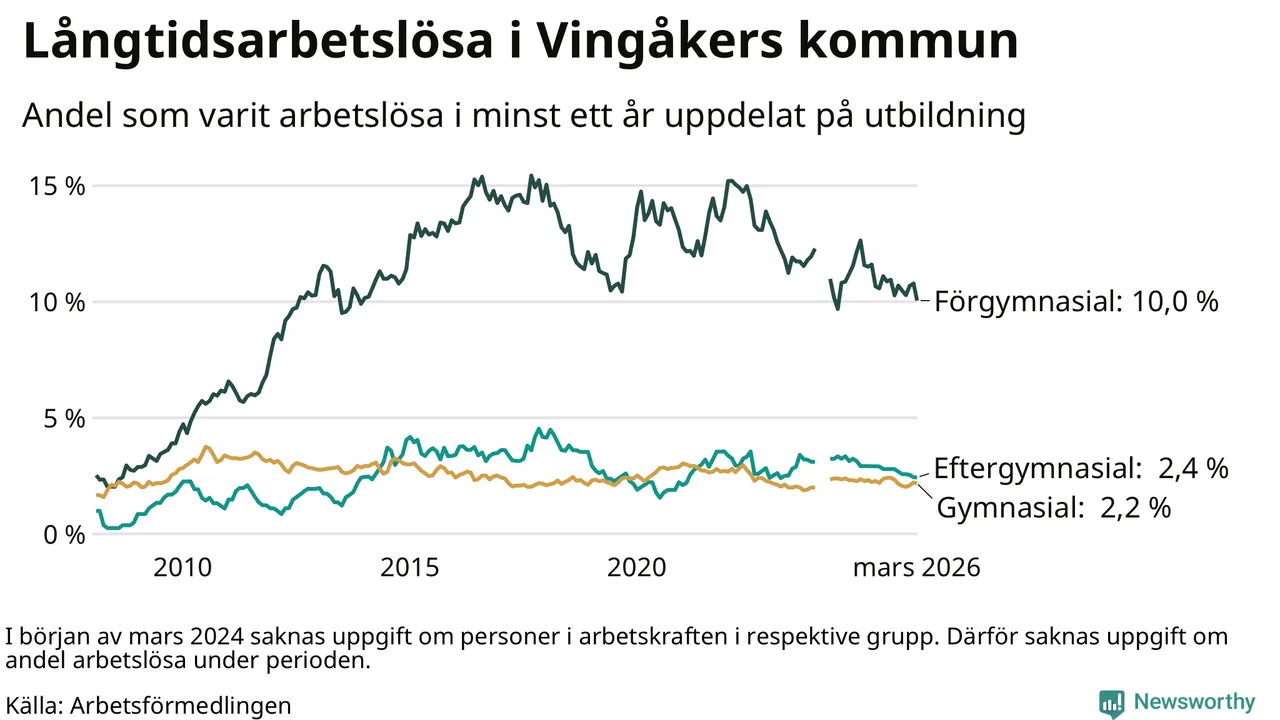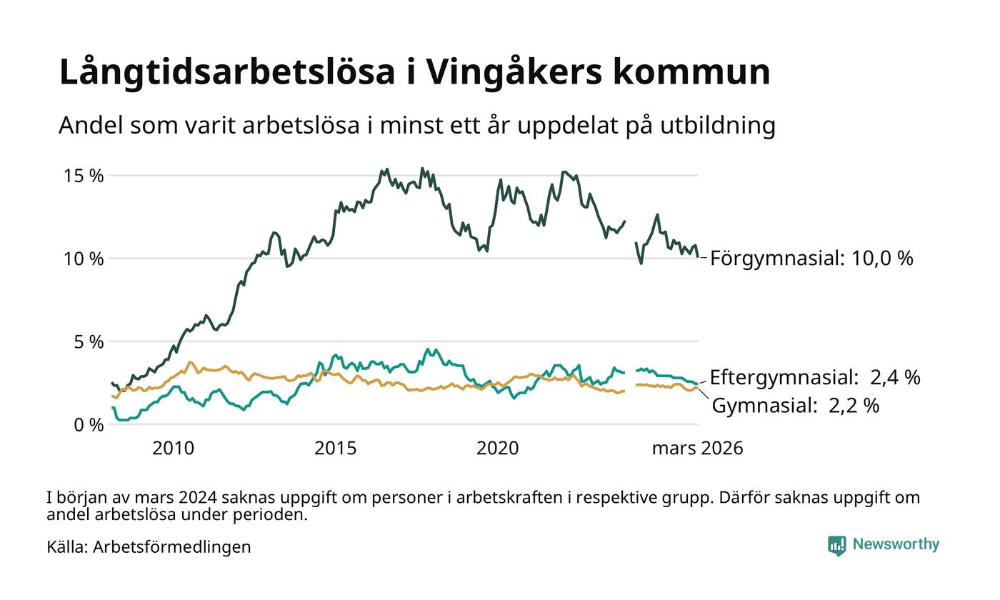 I mars hade 139 Vingåkersbor varit arbetslösa i minst ett år, vilket är sex färre än månaden innan. 139 personer motsvarar 3,5 procent av arbetskraften i kommunen – andelen långtidsarbetslösa är 0,6 procentenheter lägre än samma månad för ett år sedan.