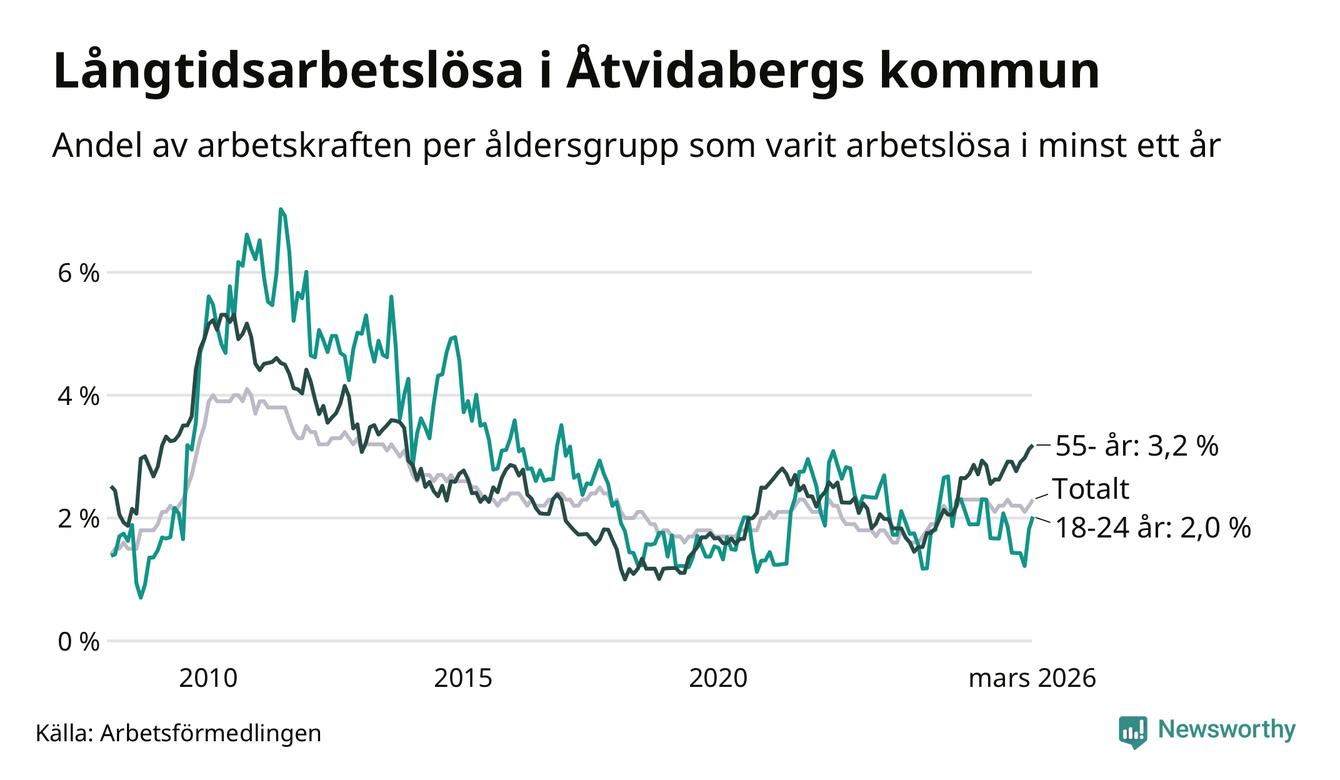 Av de 123 personerna som varit arbetslösa i mer än ett år i Åtvidabergs kommun är 43 personer mellan 55 och 661 år och tio är mellan 18 och 24 år. För den äldre gruppen är andelen arbetslösa 3,2 procent medan den i den yngre gruppen är 2,0 procent. Även i riket som helhet är långtidsarbetslösheten högre i gruppen äldre.