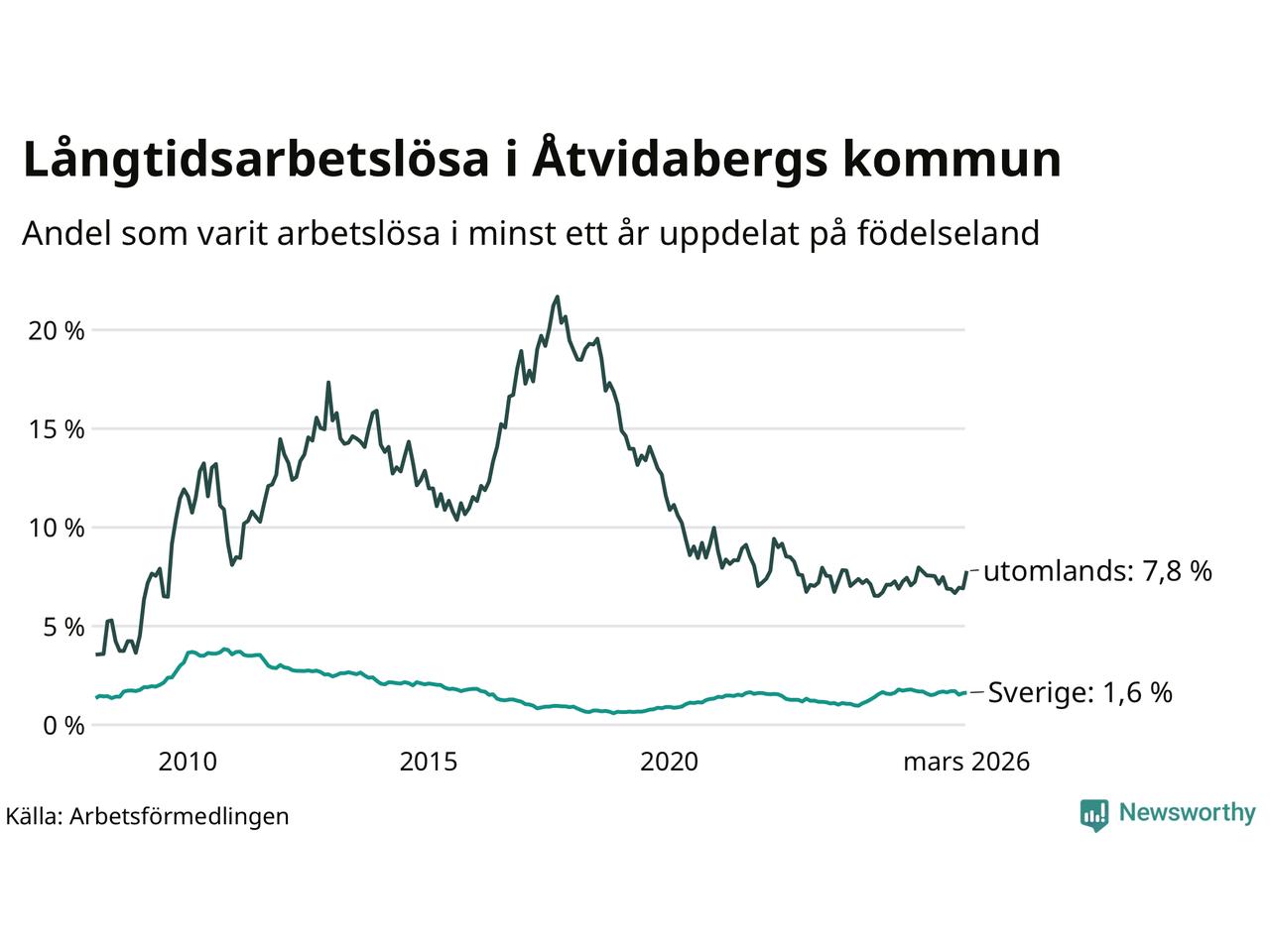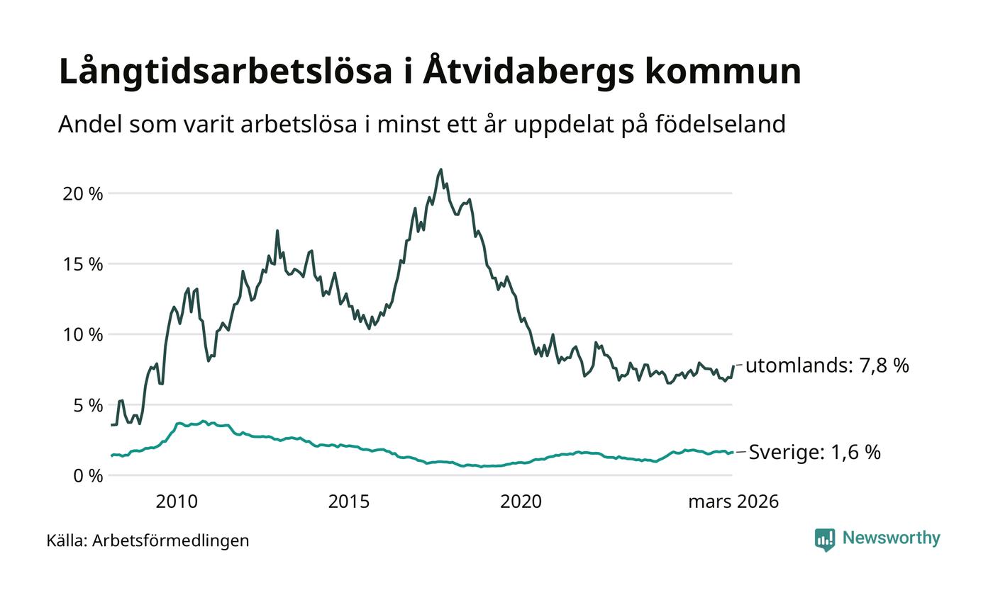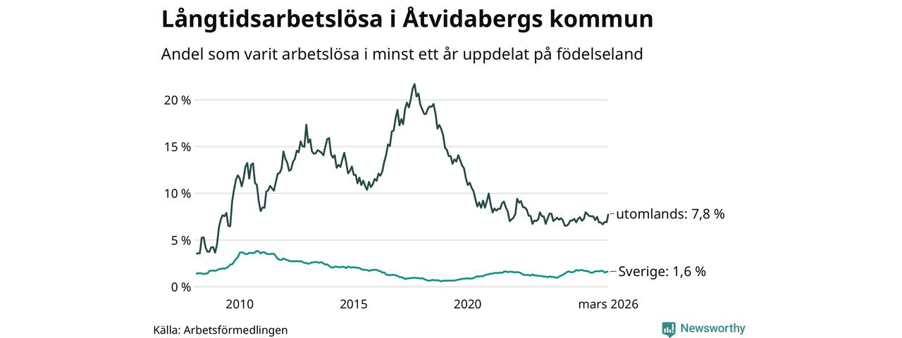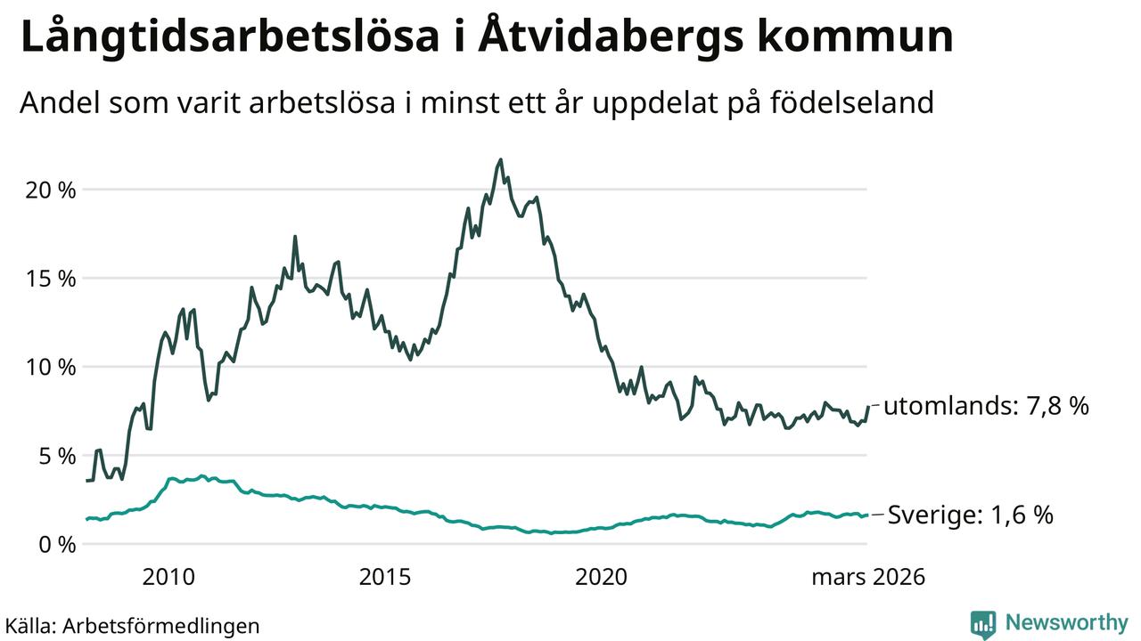 79 av de långtidsarbetslösa i Åtvidaberg är födda i Sverige, medan 44 är födda utomlands. Det innebär att långtidsarbetslösheten bland Sverigefödda är 1,6 procent, medan den är fem gånger så hög – 7,8 procent – bland födda utomlands. Även i riket som helhet är arbetslösheten högre bland utrikesfödda.