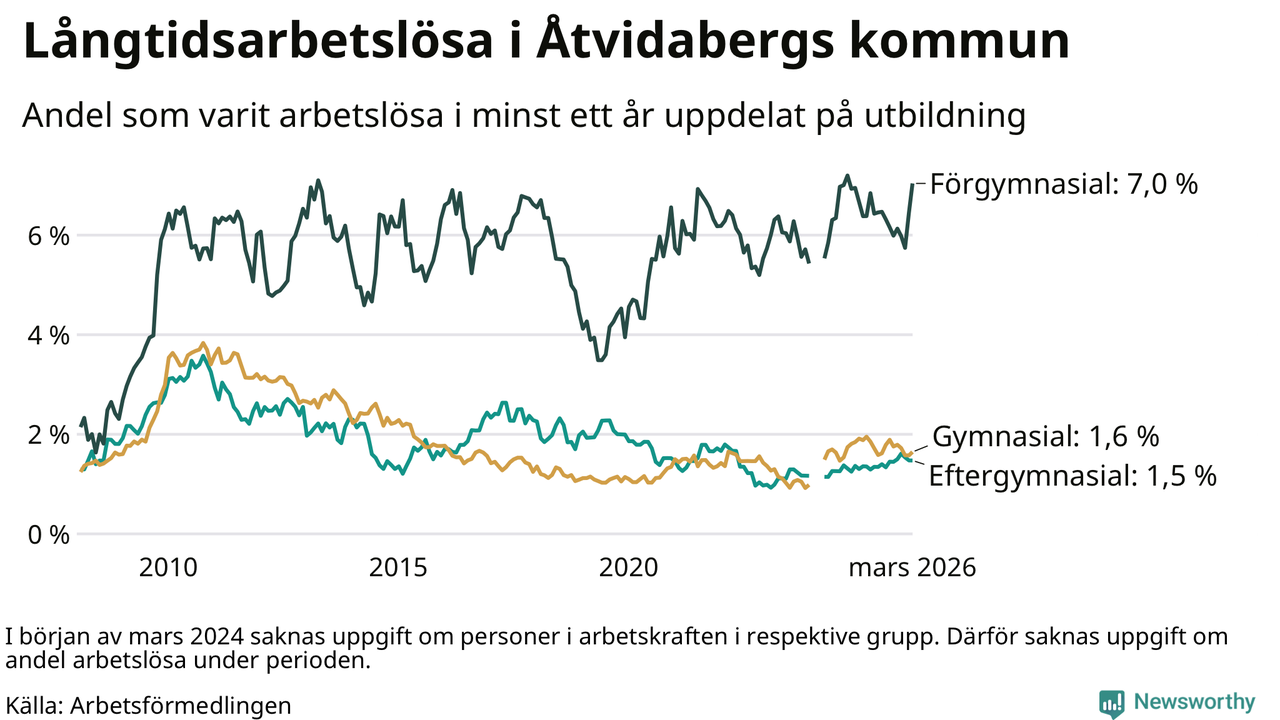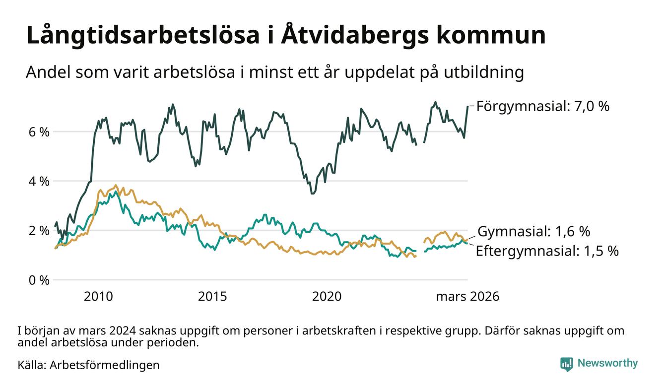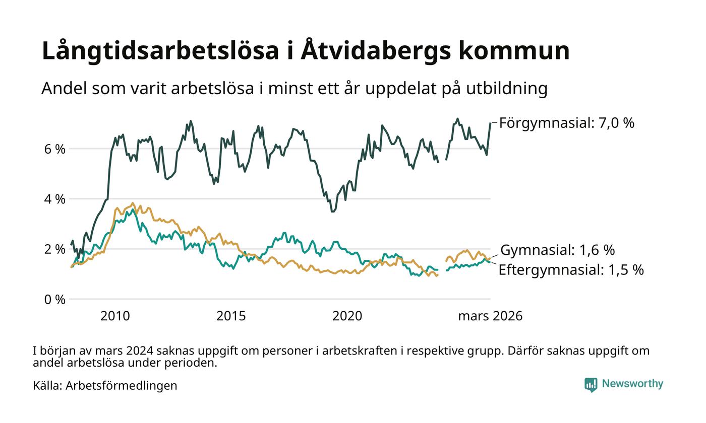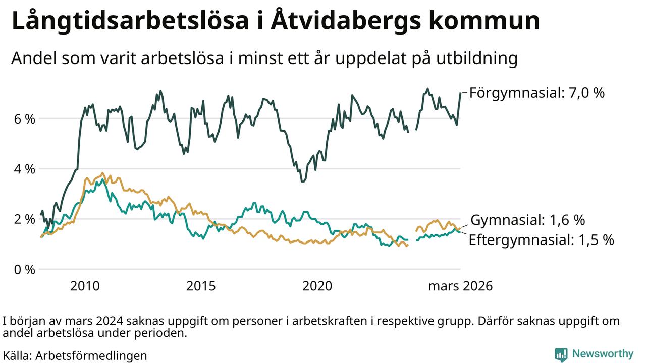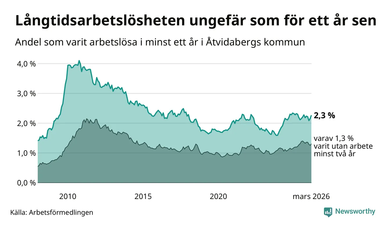 I mars hade 123 Åtvidabergsbor varit arbetslösa i minst ett år, vilket är sex fler än månaden innan. 123 personer motsvarar 2,3 procent av arbetskraften i kommunen – andelen långtidsarbetslösa är ungefär på samma nivå som för ett år sedan.