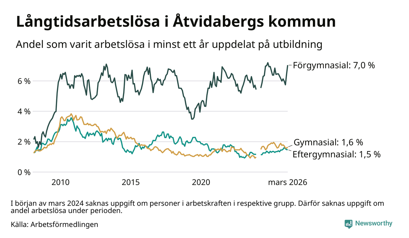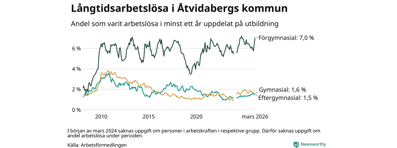 Andelen som varit utan arbete i minst ett år i Åtvidaberg var ungefär lika stor i mars jämfört med samma månad för ett år sedan. Det visar Arbetsfömedlingens senaste månadsstatistik.