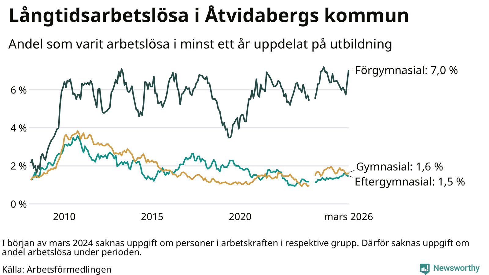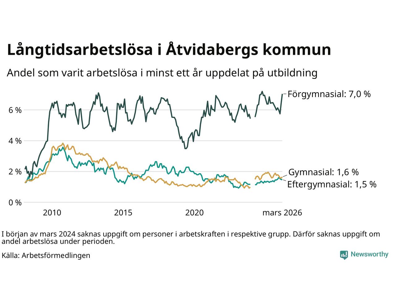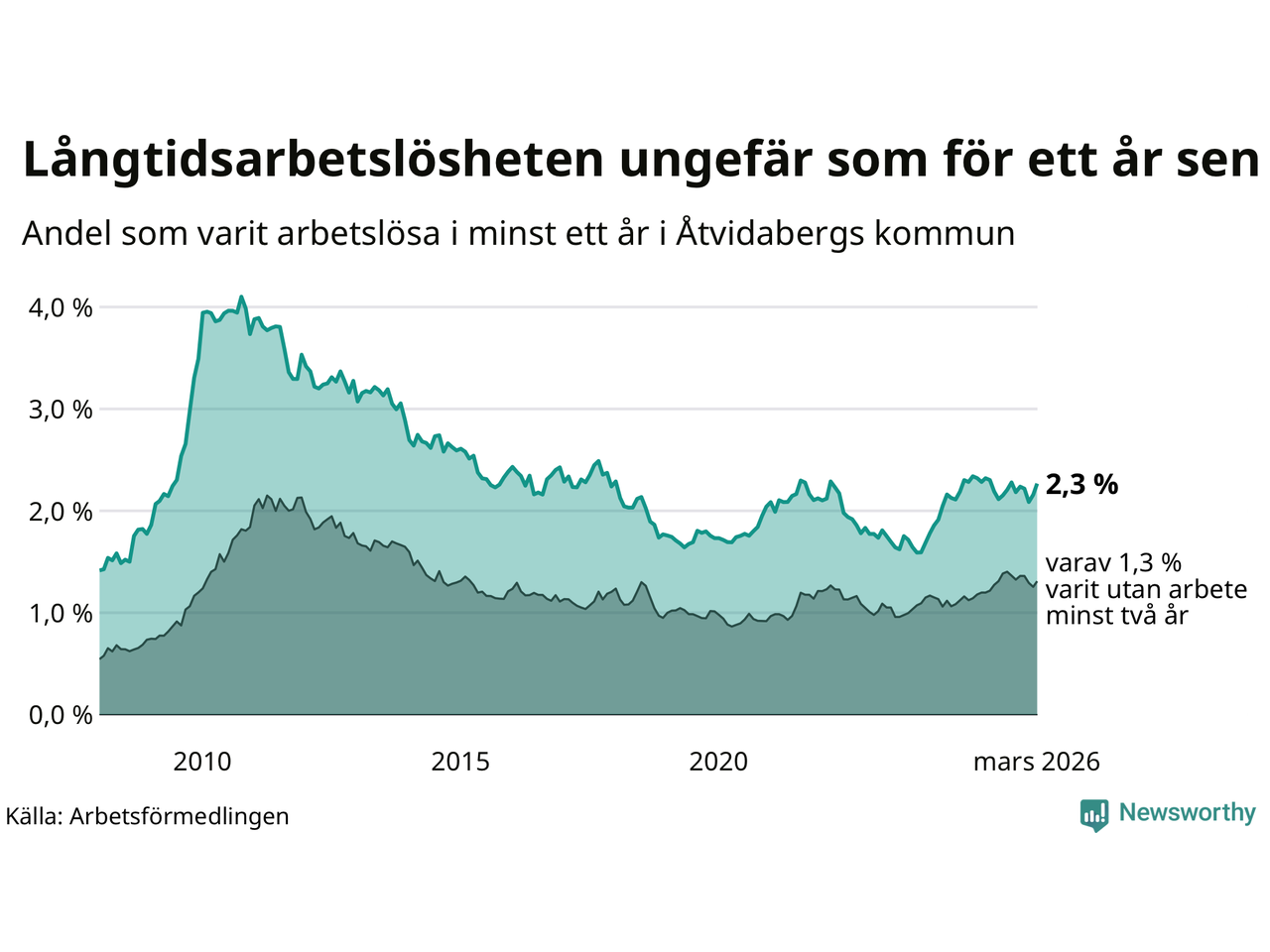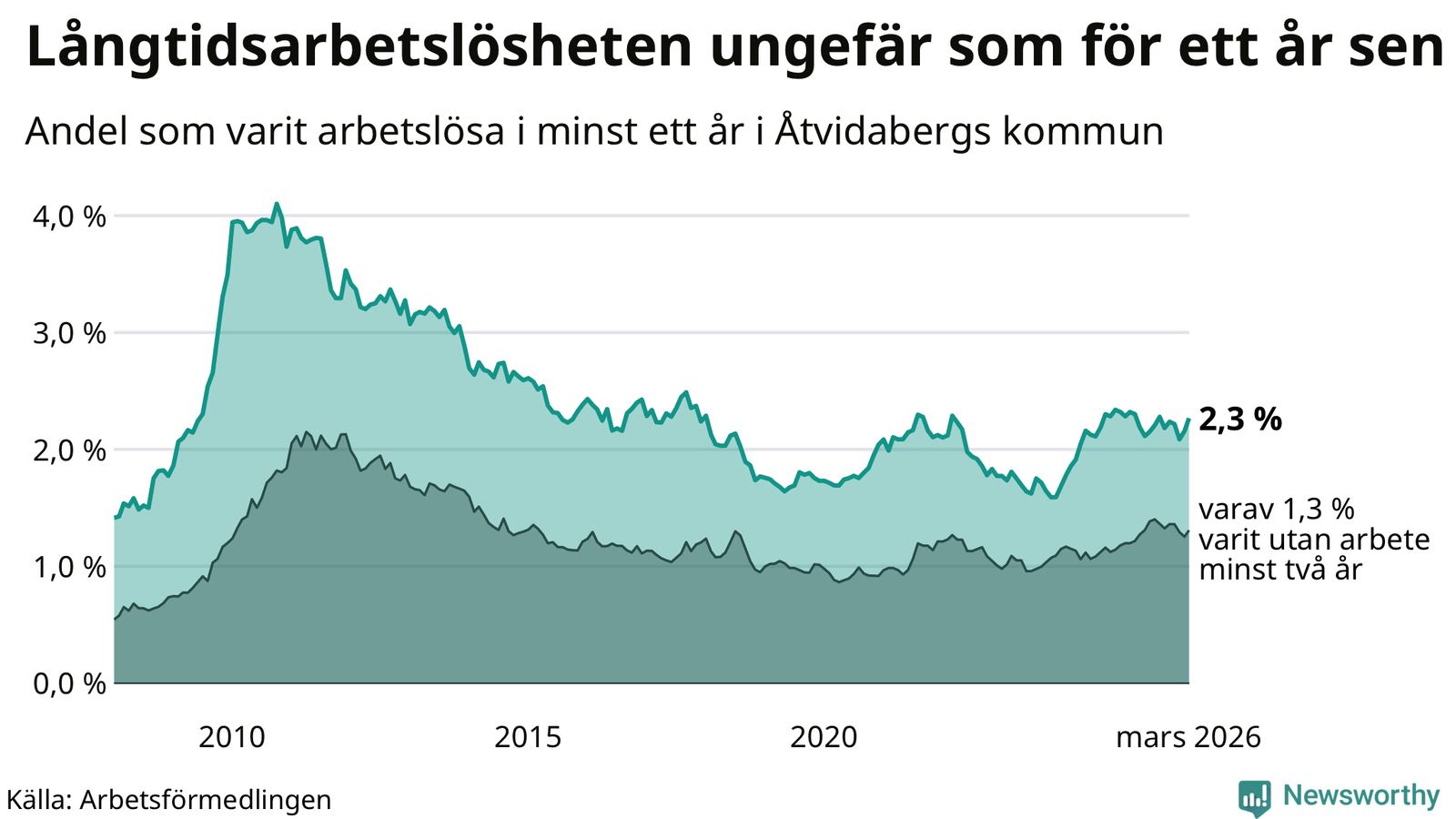 | Andel arbetslösa i minst två år | 1,3 % | 1,9 % | 1,6 % |