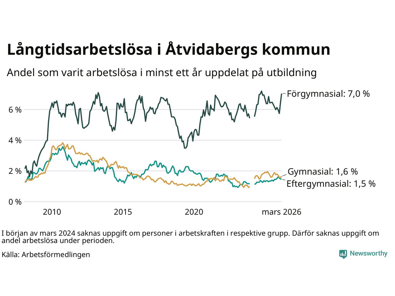 | Bland dem med gymnasieutbildning | 1,6 % | 2,6 % | 2,4 % |