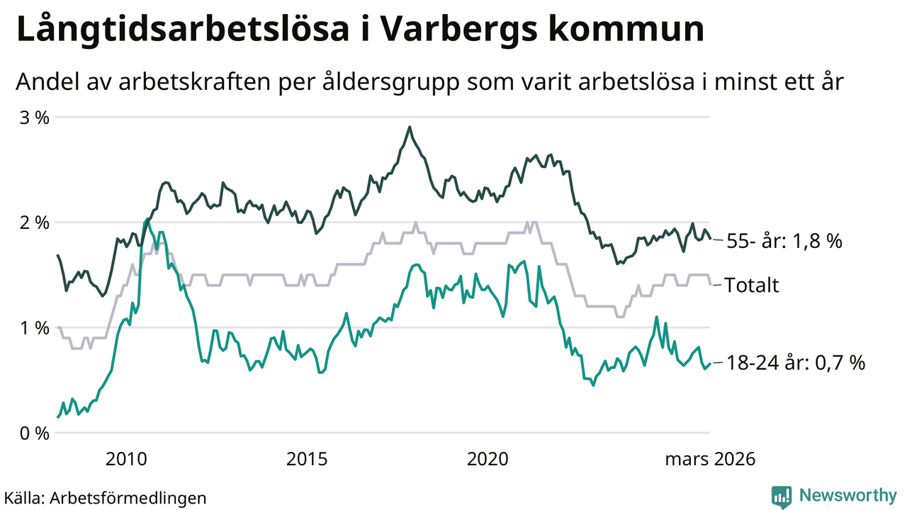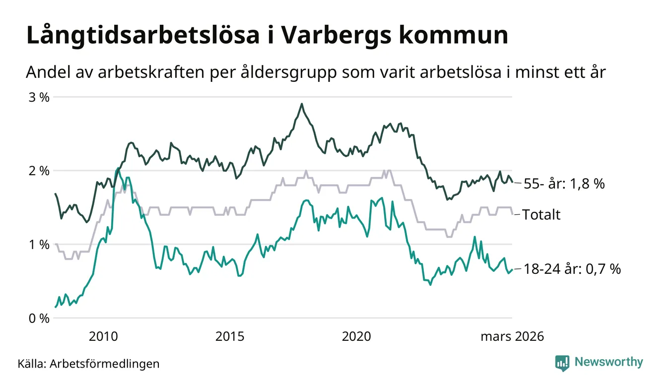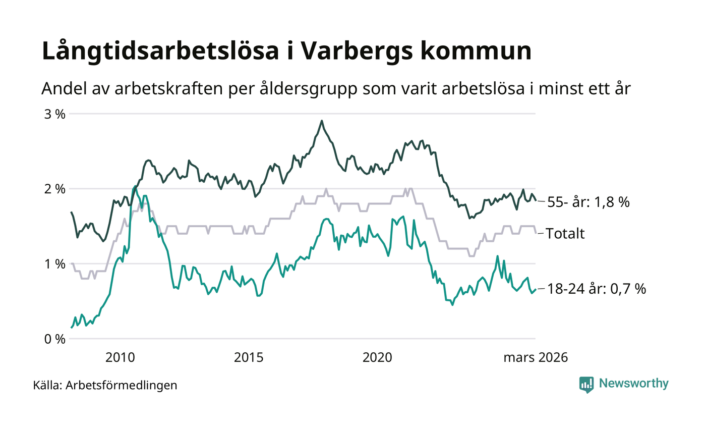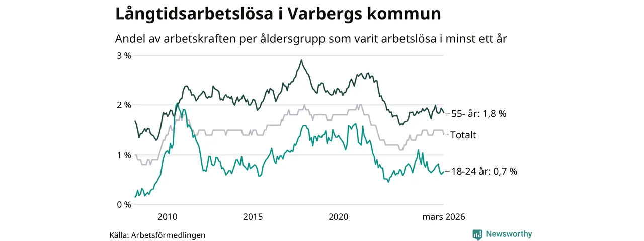 Av de 484 personerna som varit arbetslösa i mer än ett år i Varbergs kommun är 142 personer mellan 55 och 661 år och 23 är mellan 18 och 24 år. För den äldre gruppen är andelen arbetslösa 1,8 procent medan den i den yngre gruppen är 0,7 procent. Även i riket som helhet är långtidsarbetslösheten högre i gruppen äldre.
