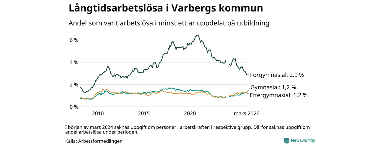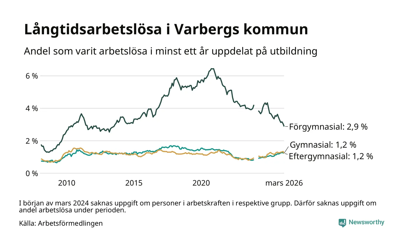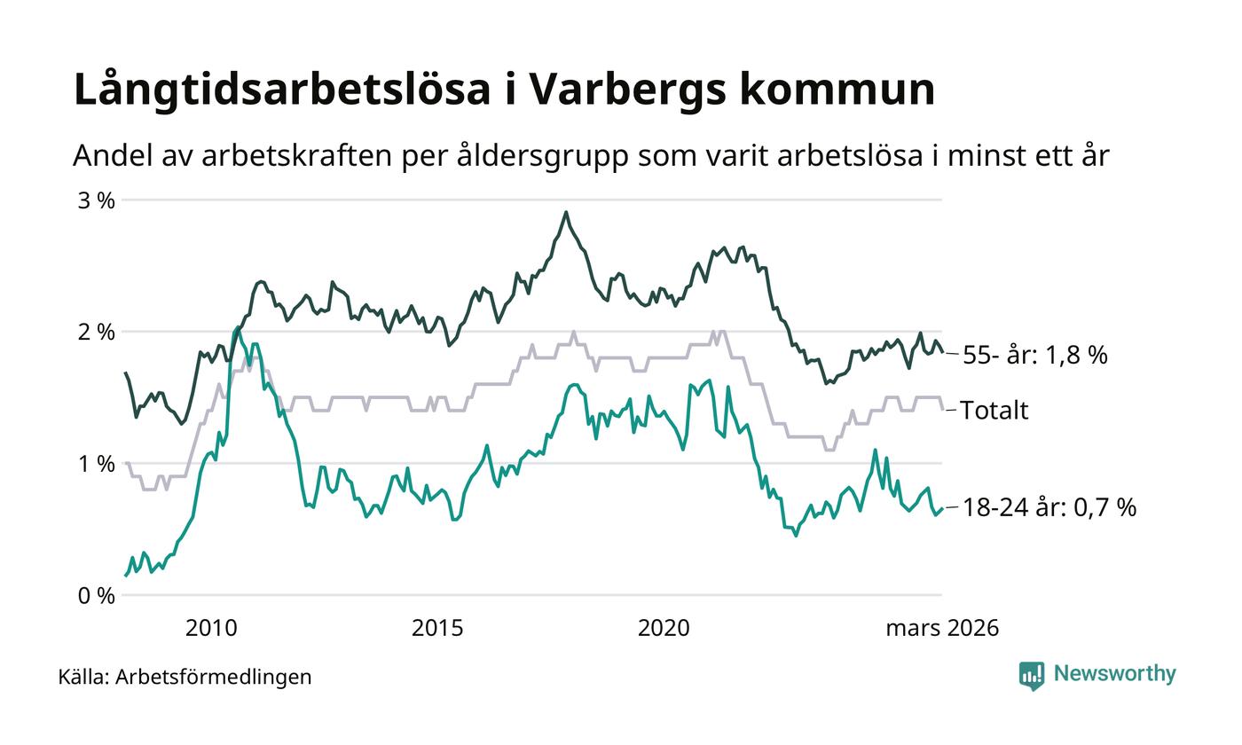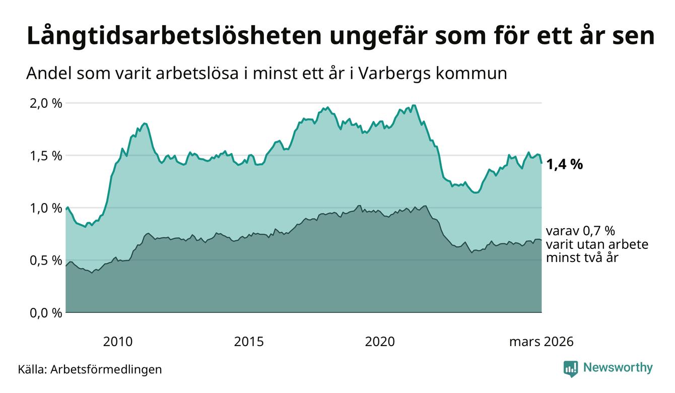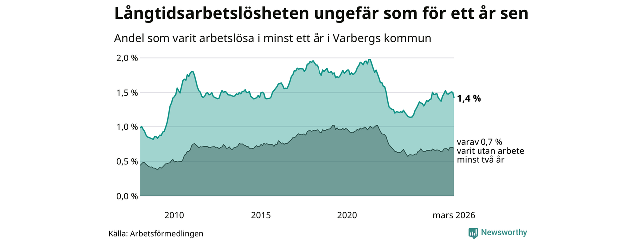 I mars hade 484 Varbergsbor varit arbetslösa i minst ett år, vilket är 28 färre än månaden innan. 484 personer motsvarar 1,4 procent av arbetskraften i kommunen – andelen långtidsarbetslösa är ungefär på samma nivå som för ett år sedan.