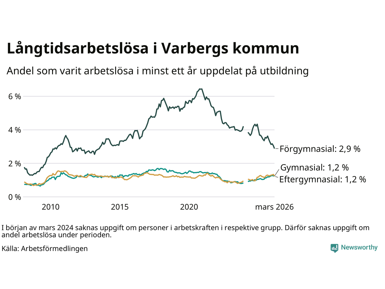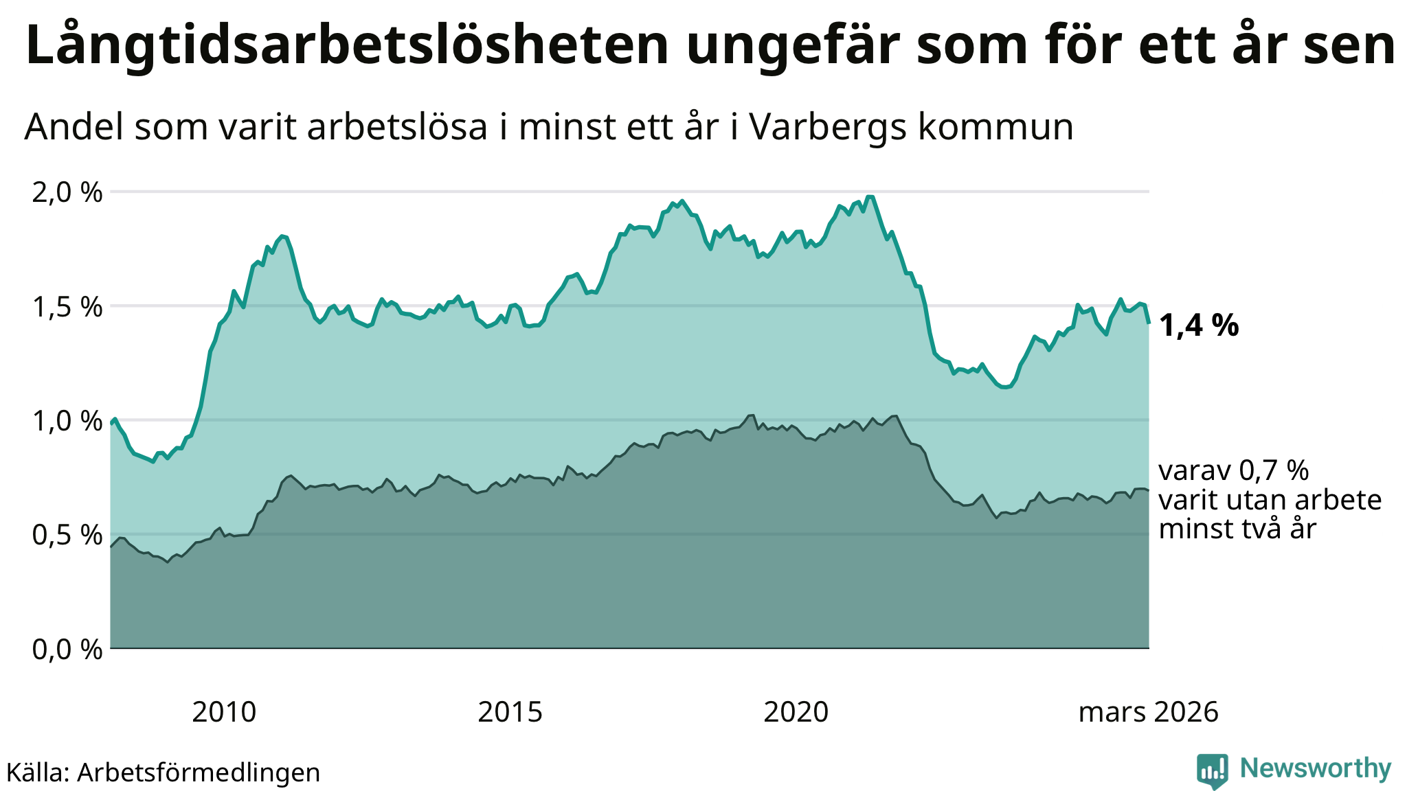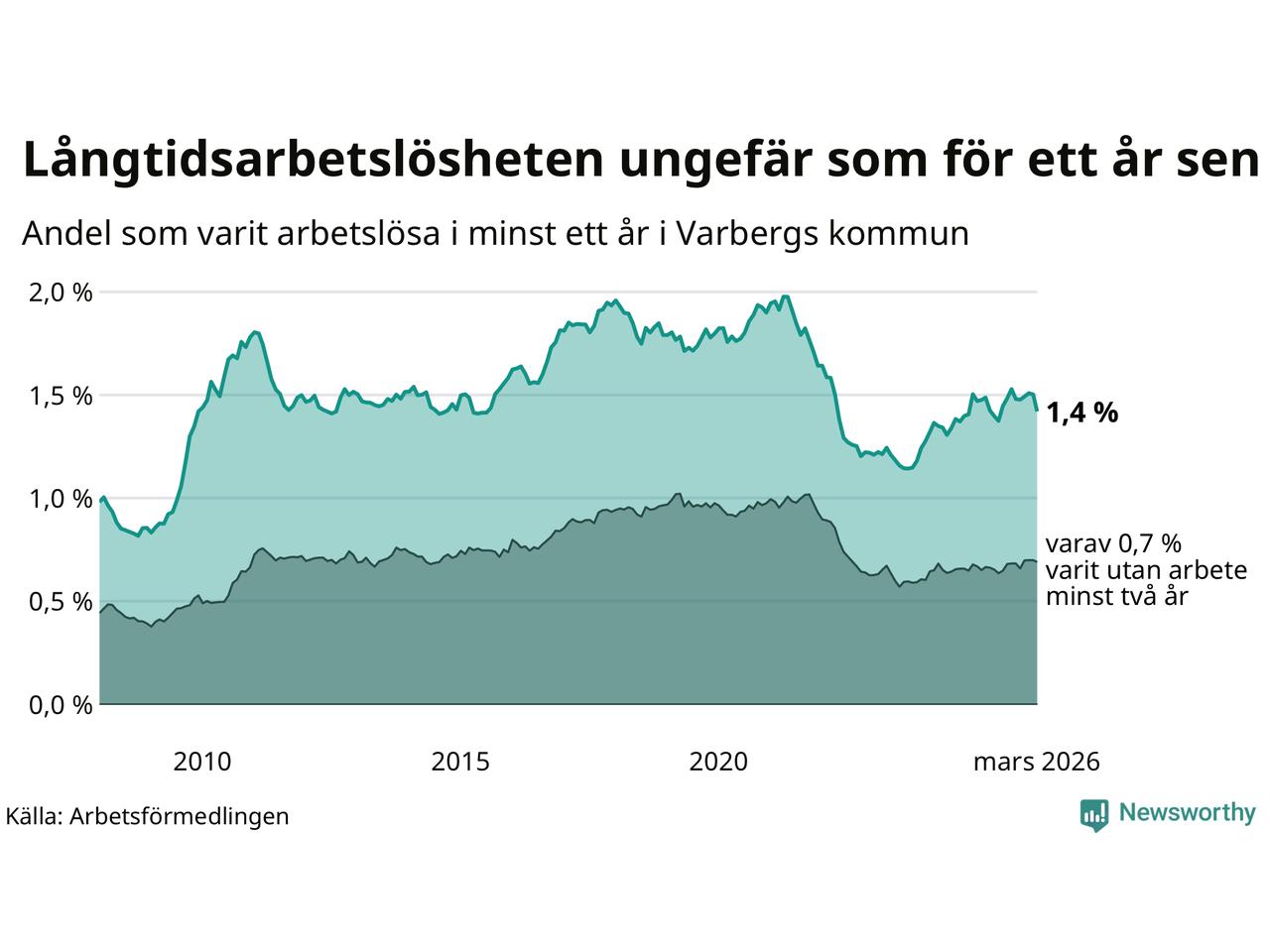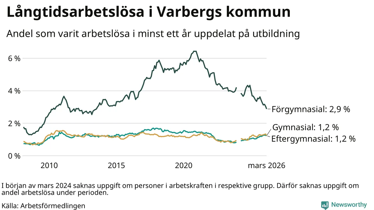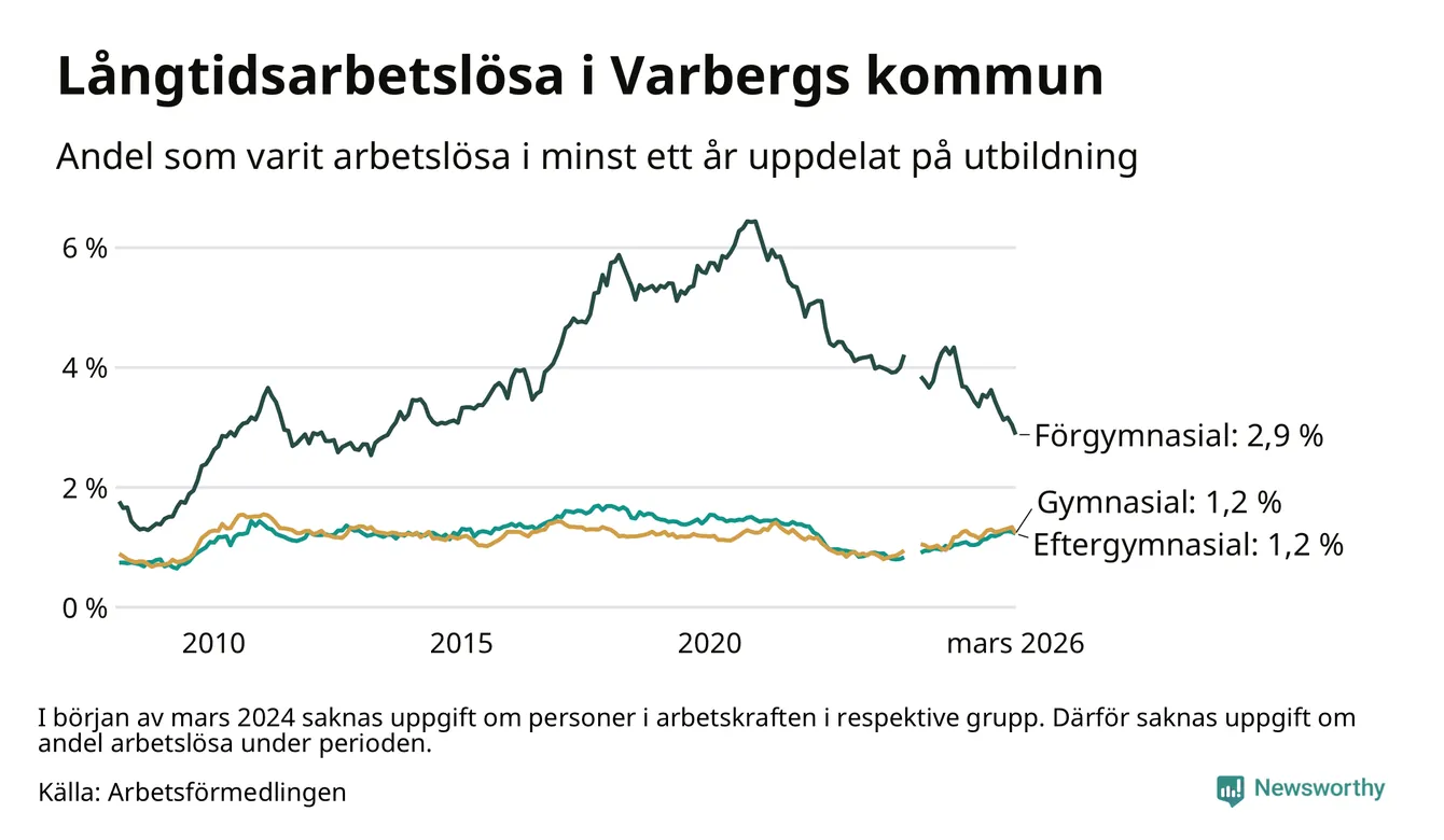 I mars hade 484 Varbergsbor varit arbetslösa i minst ett år, vilket är 28 färre än månaden innan. 484 personer motsvarar 1,4 procent av arbetskraften i kommunen – andelen långtidsarbetslösa är ungefär på samma nivå som för ett år sedan.