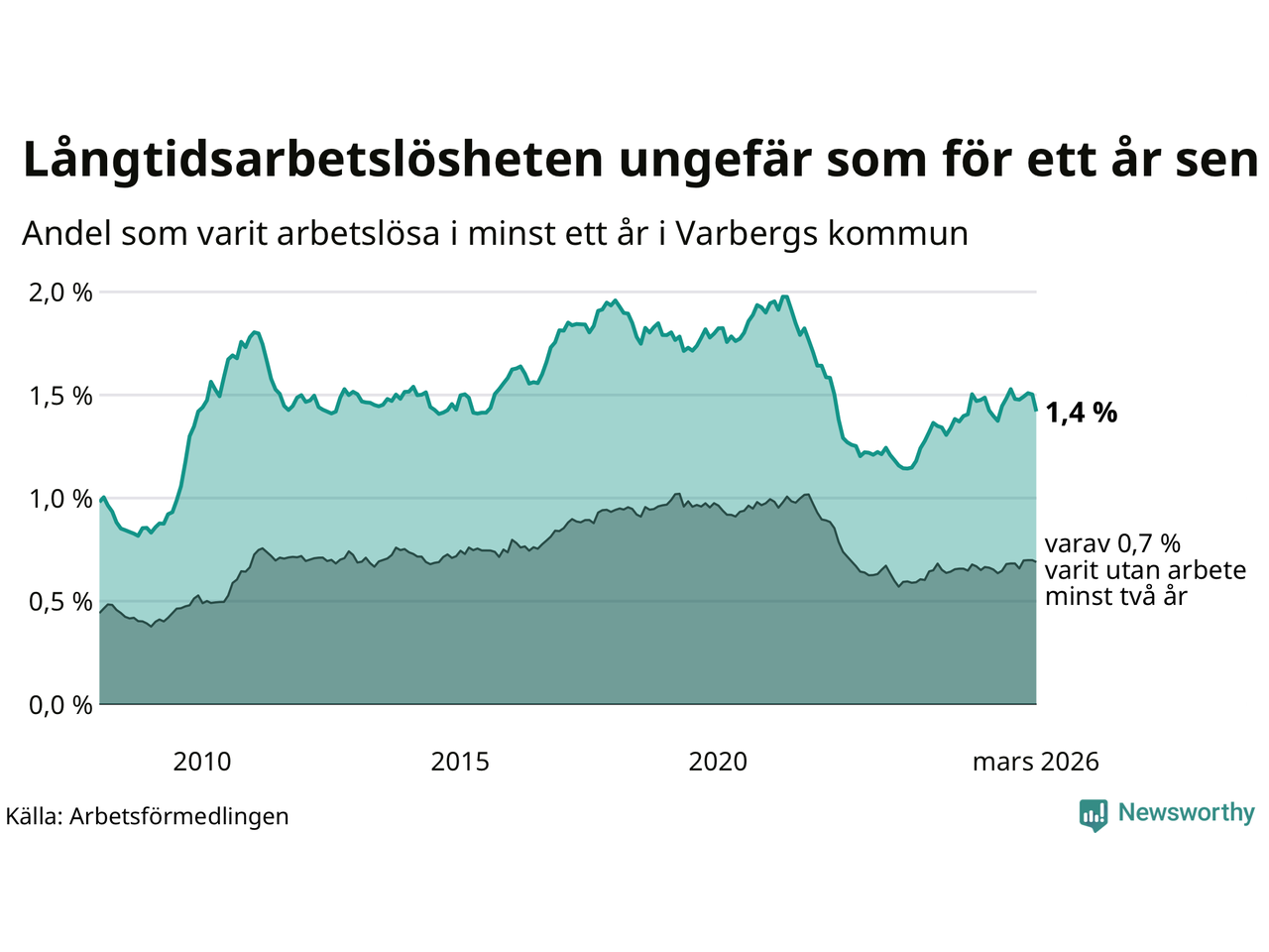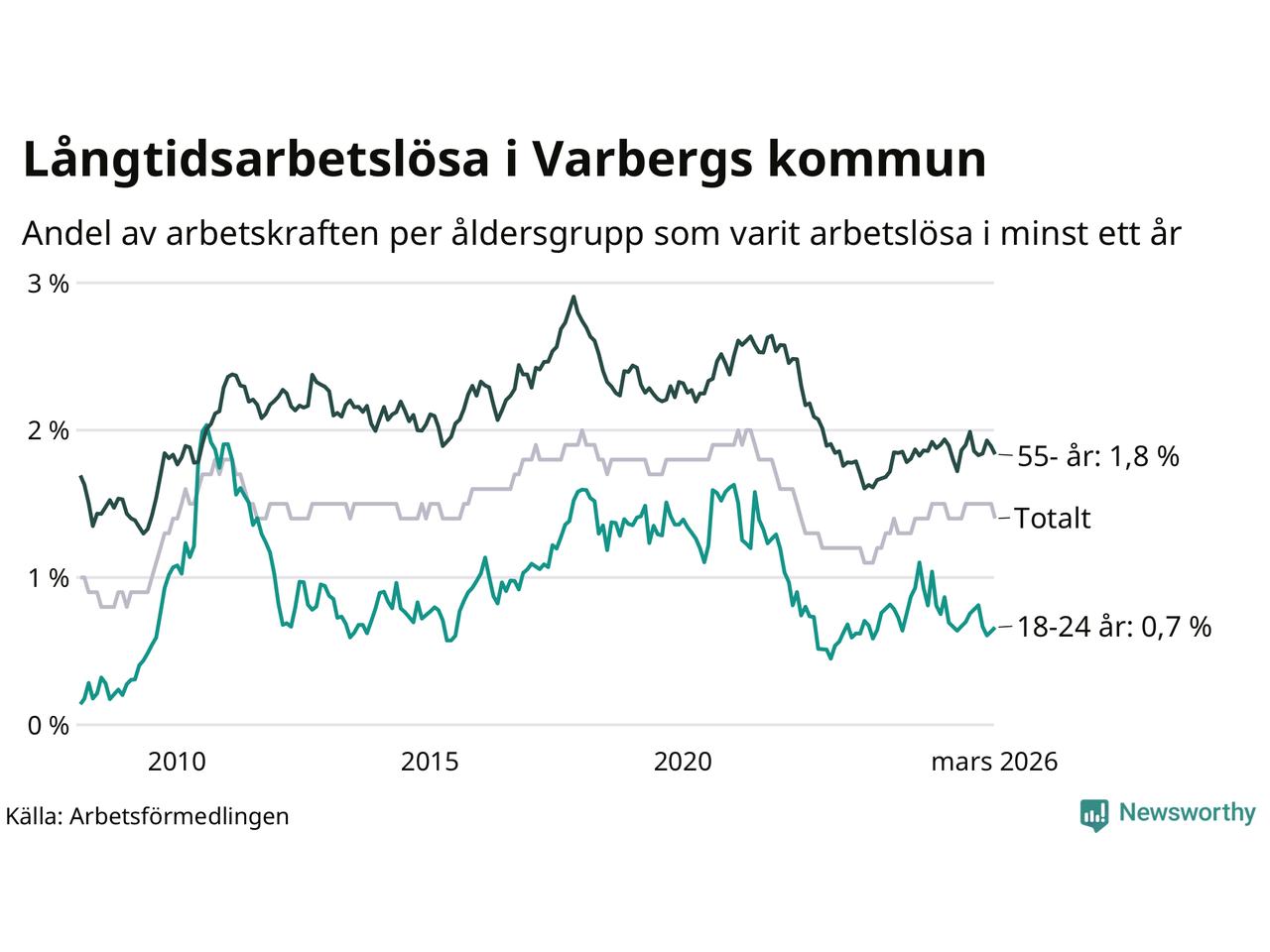 | Andel arbetslösa i minst två år | 0,7 % | 1,1 % | 1,6 % |