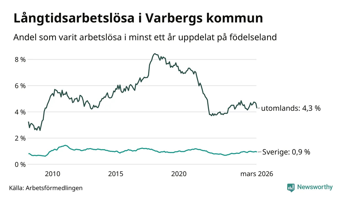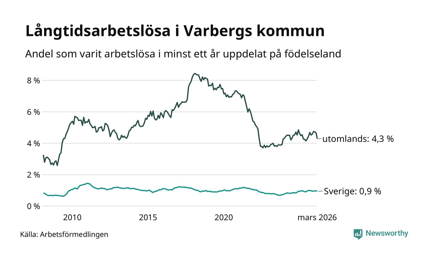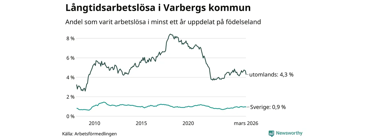 274 av de långtidsarbetslösa i Varberg är födda i Sverige, medan 210 är födda utomlands. Det innebär att långtidsarbetslösheten bland Sverigefödda är 0,9 procent, medan den är fem gånger så hög – 4,3 procent – bland födda utomlands. Även i riket som helhet är arbetslösheten högre bland utrikesfödda.