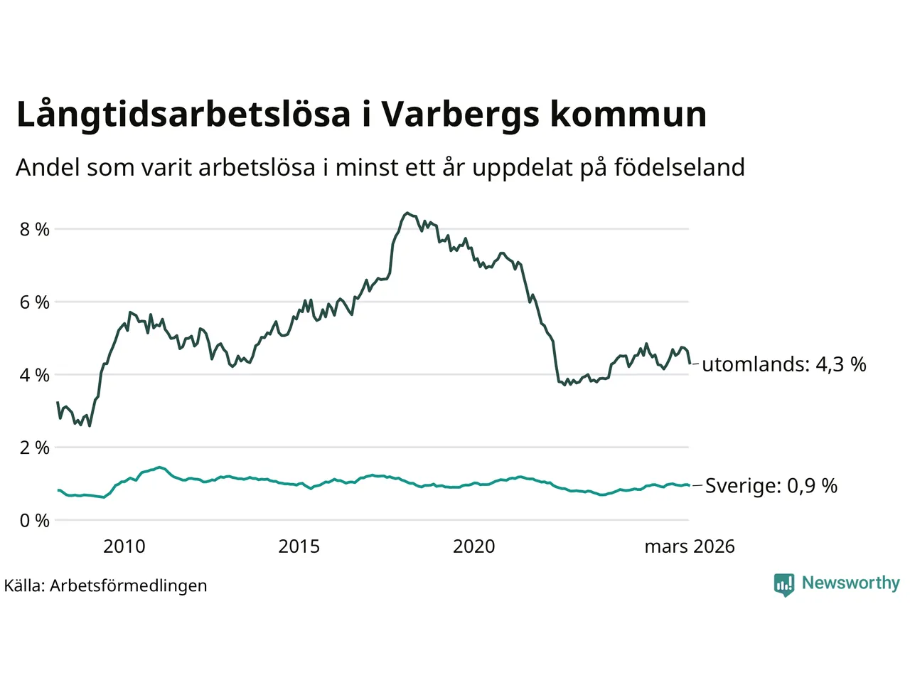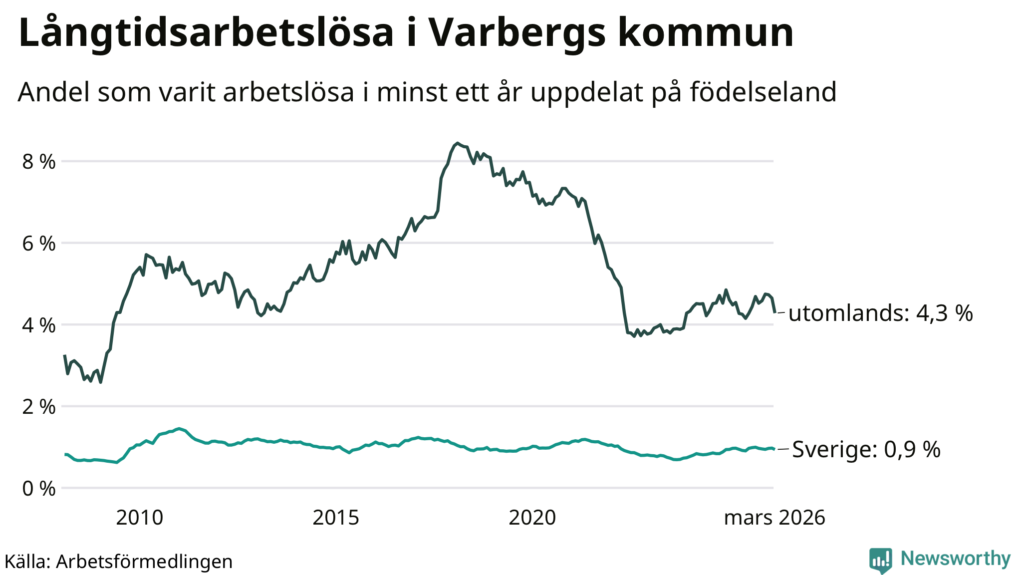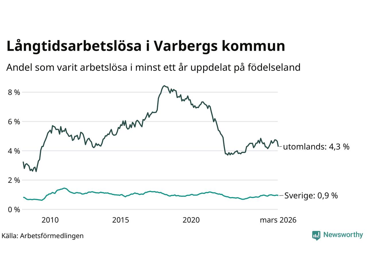 274 av de långtidsarbetslösa i Varberg är födda i Sverige, medan 210 är födda utomlands. Det innebär att långtidsarbetslösheten bland Sverigefödda är 0,9 procent, medan den är fem gånger så hög – 4,3 procent – bland födda utomlands. Även i riket som helhet är arbetslösheten högre bland utrikesfödda.