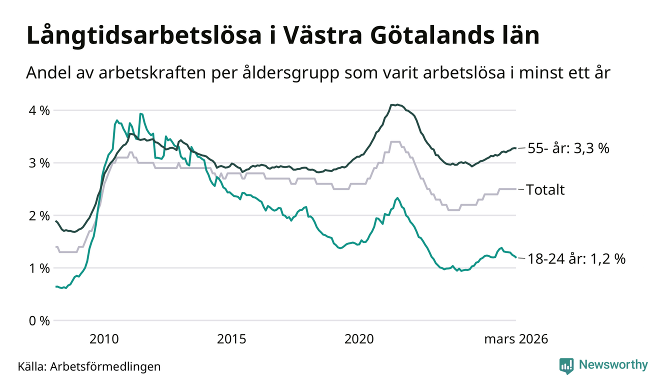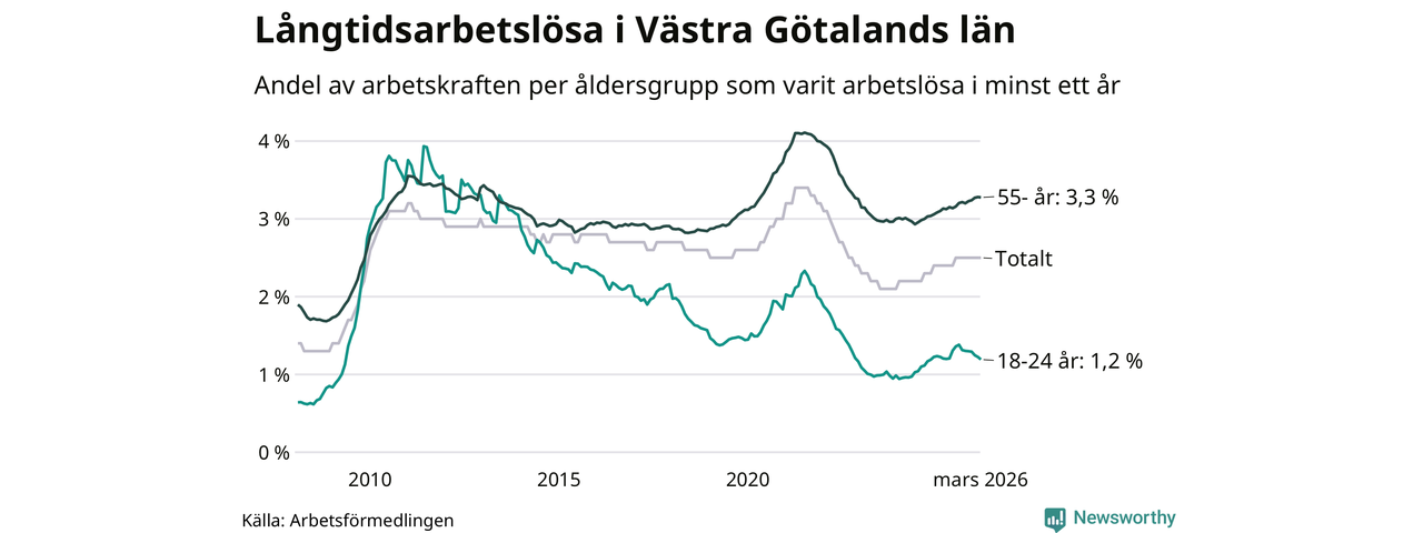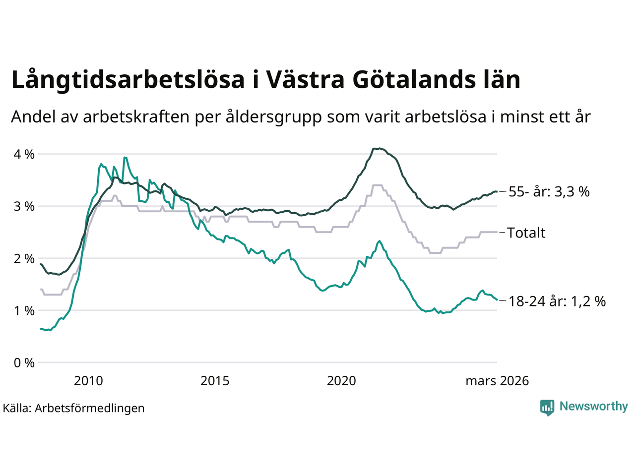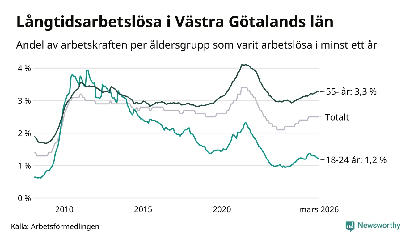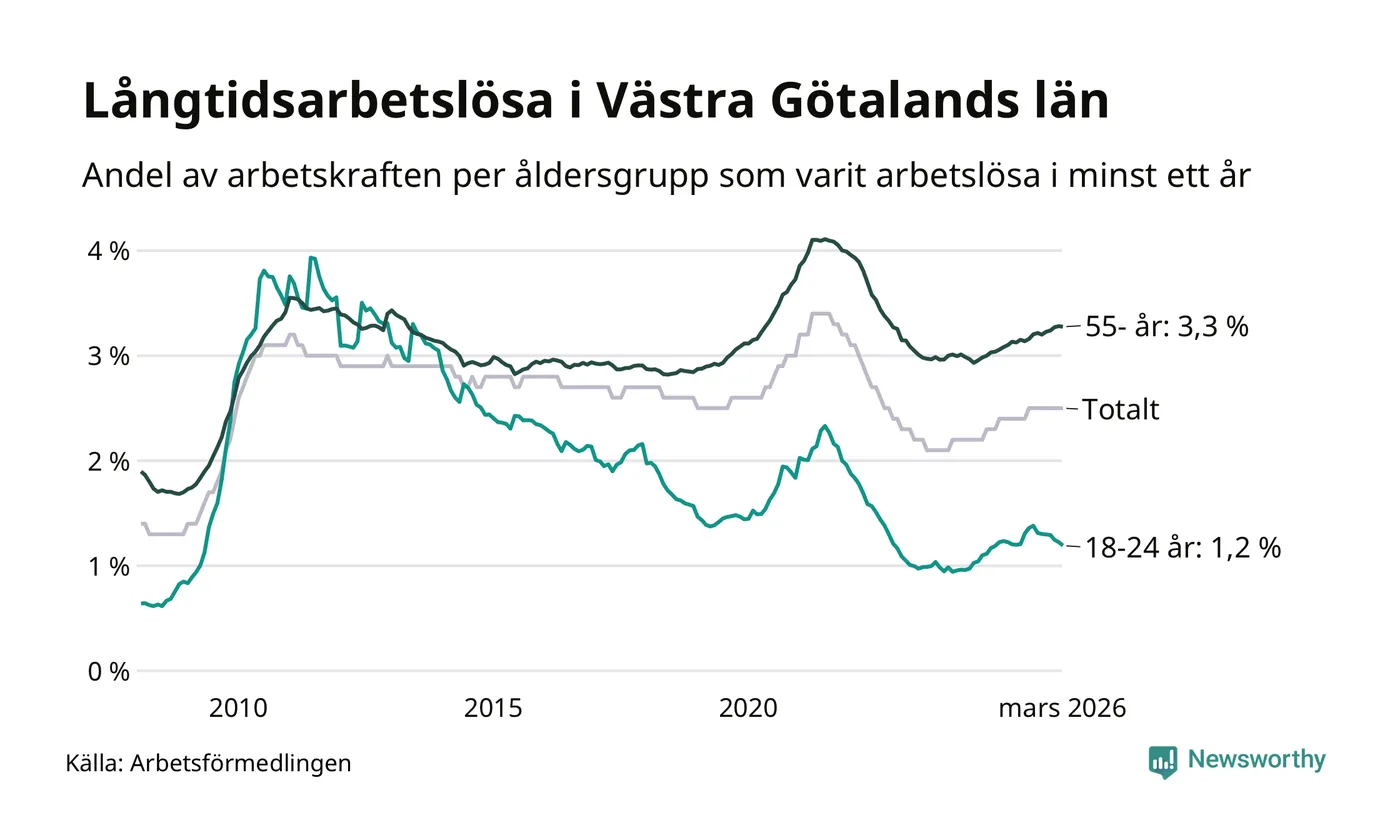 Av de 22 794 personerna som varit arbetslösa i mer än ett år i Västra Götalands län är mellan 6 131 och 6 131 personer mellan 55 och 661 år och mellan 1 107 och 1 107 är mellan 18 och 24 år. För den äldre gruppen är andelen arbetslösa 3,3 procent medan den i den yngre gruppen är 1,2 procent. Även i riket som helhet är långtidsarbetslösheten högre i gruppen äldre.