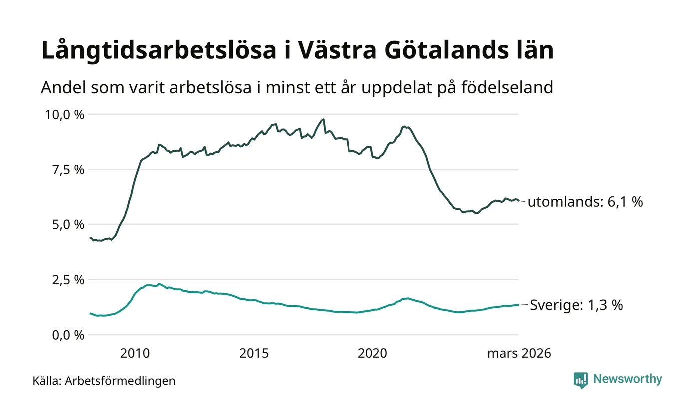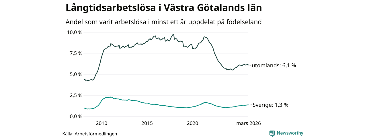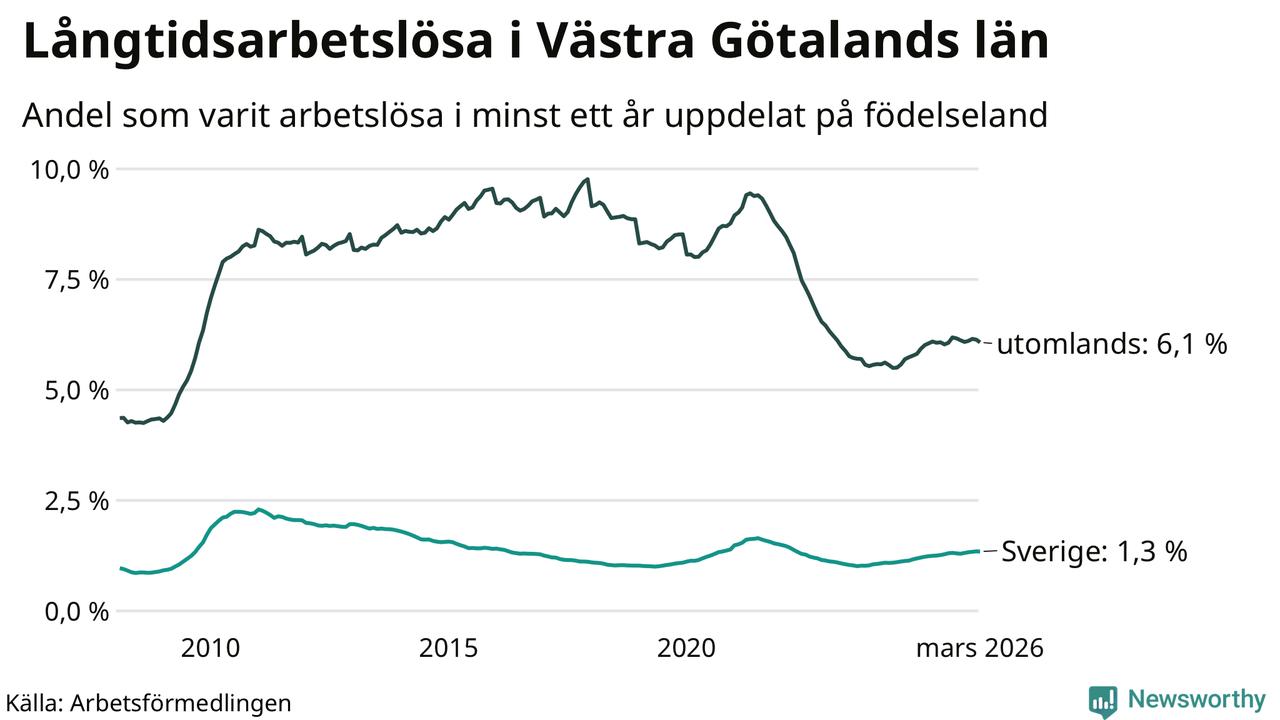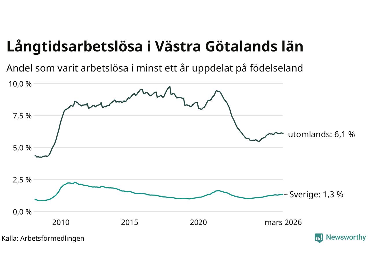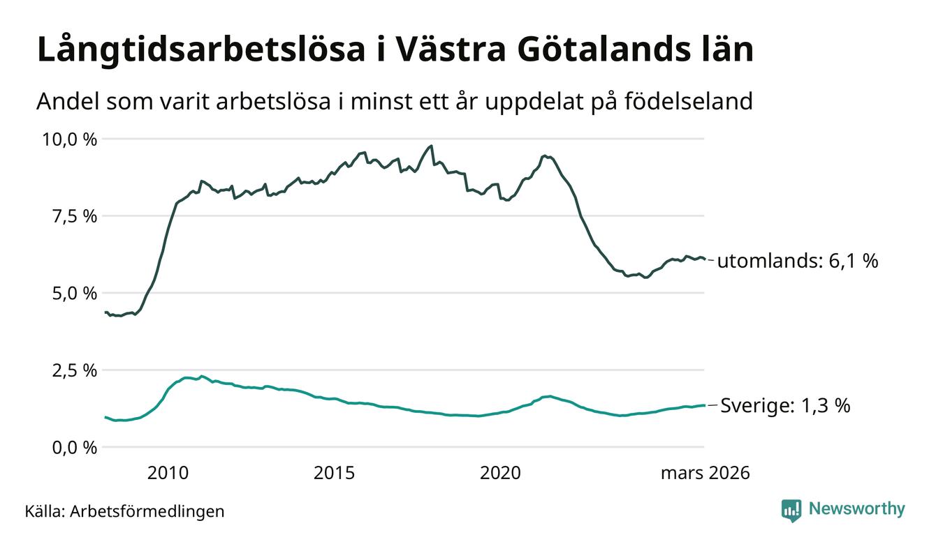 9 183 av de långtidsarbetslösa i Västra Götaland är födda i Sverige och mellan 13 612 och 13 615 är födda utomlands. Det innebär att långtidsarbetslösheten bland Sverigefödda är 1,3 procent, medan den ligger på 6,1 procent för utlandsfödda.