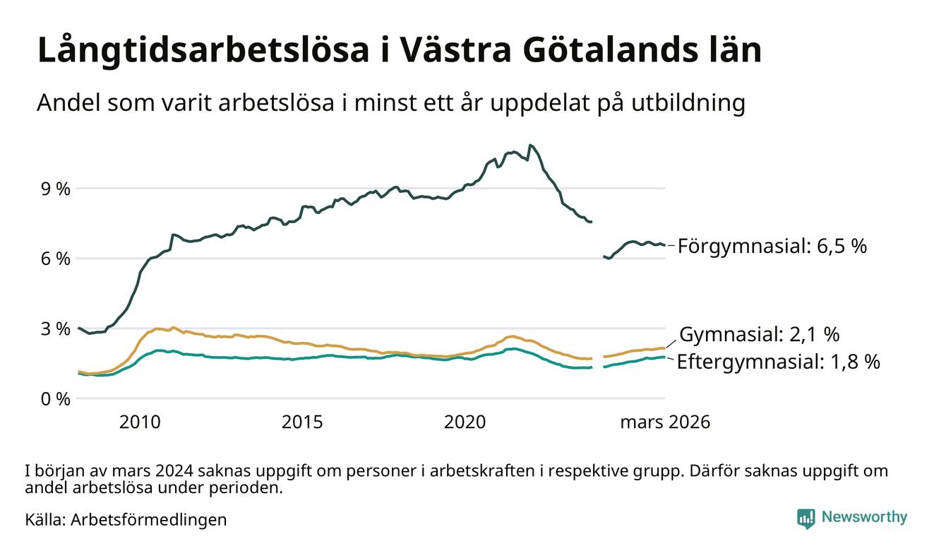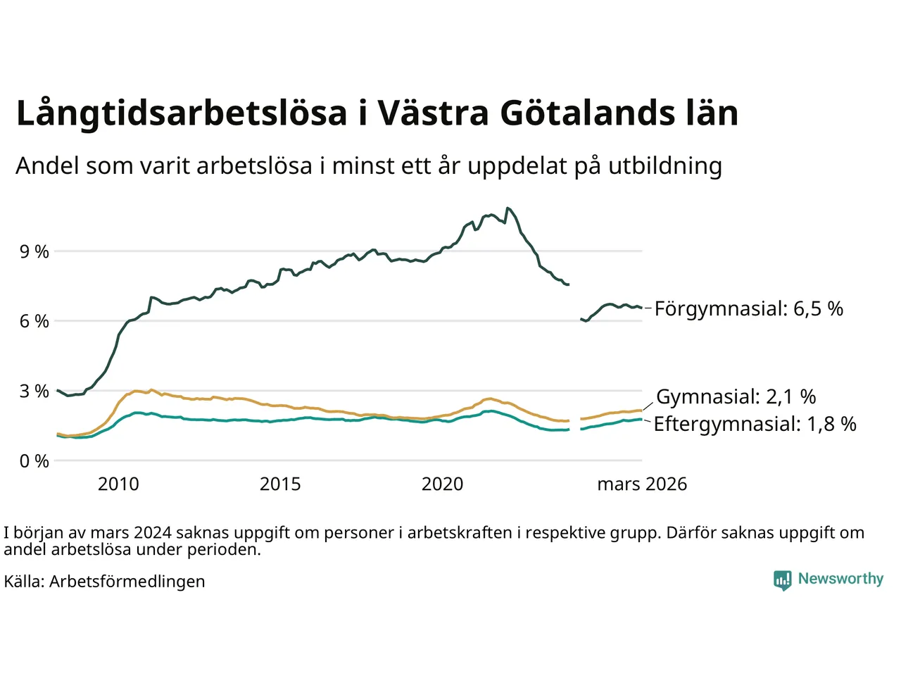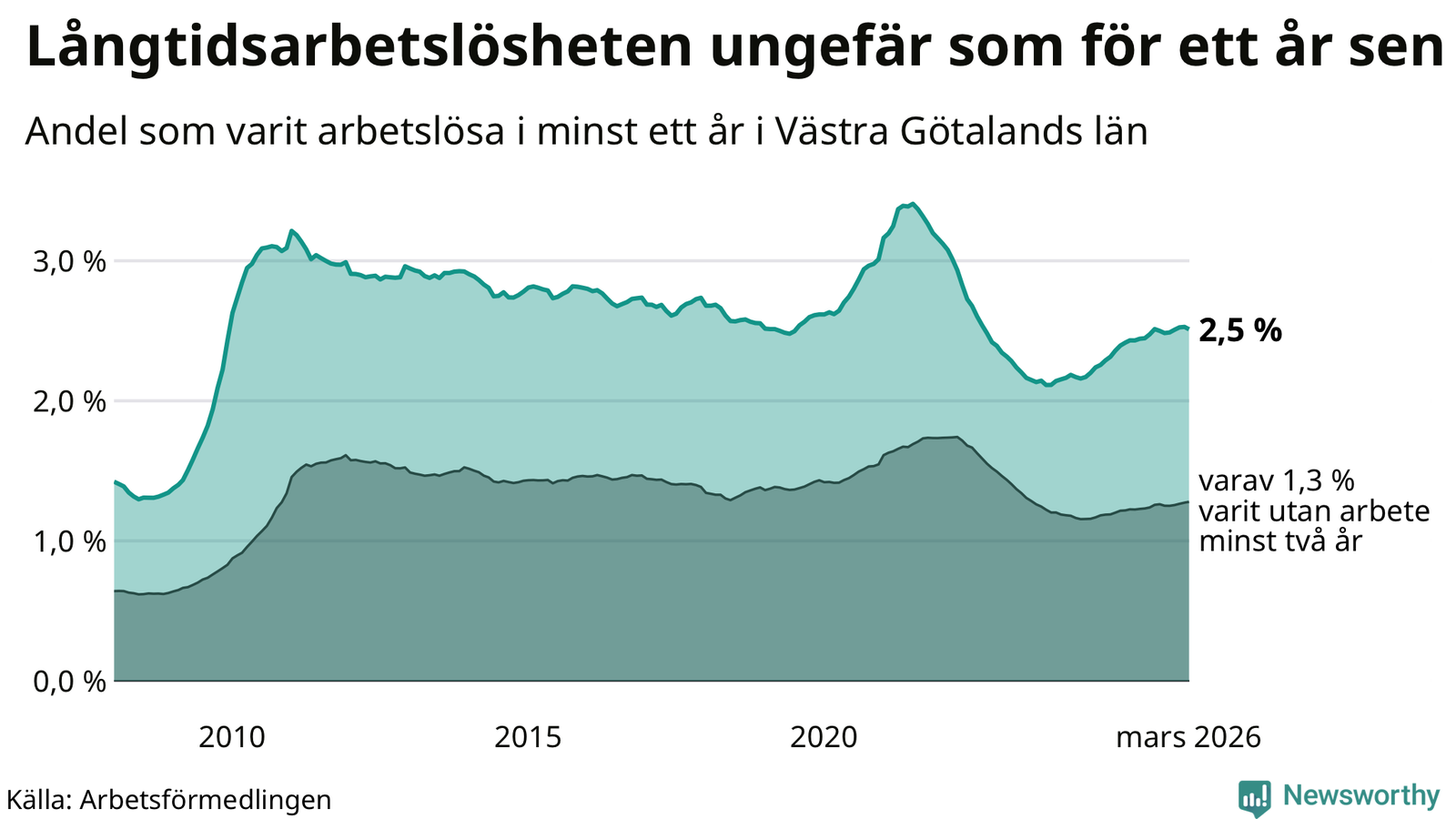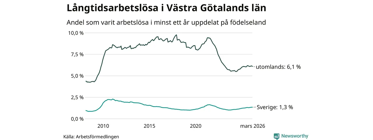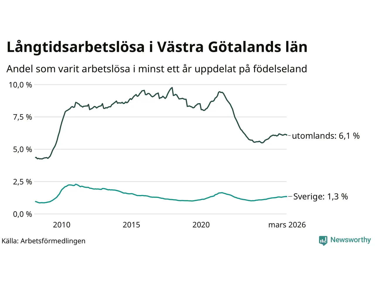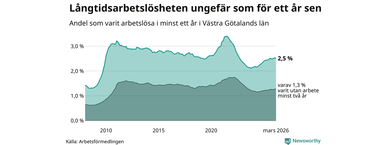 I mars hade 22 794 Västra Götalandsbor varit arbetslösa i minst ett år, vilket är 150 färre än månaden innan. Det är den första månaden sedan oktober 2025 som antalet arbetslösa minskar. 22 794 personer motsvarar 2,5 procent av arbetskraften i länet – andelen långtidsarbetslösa är ungefär på samma nivå som för ett år sedan.