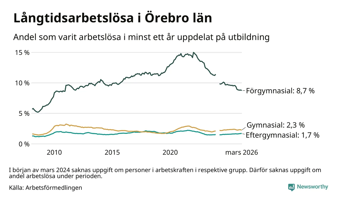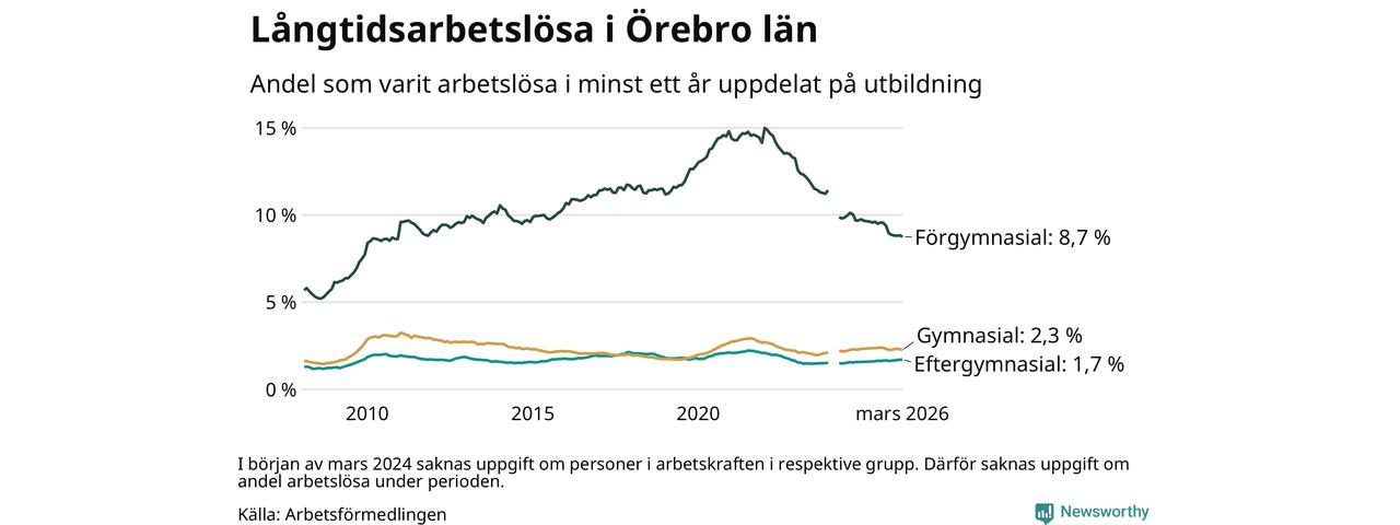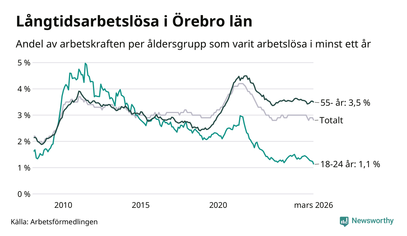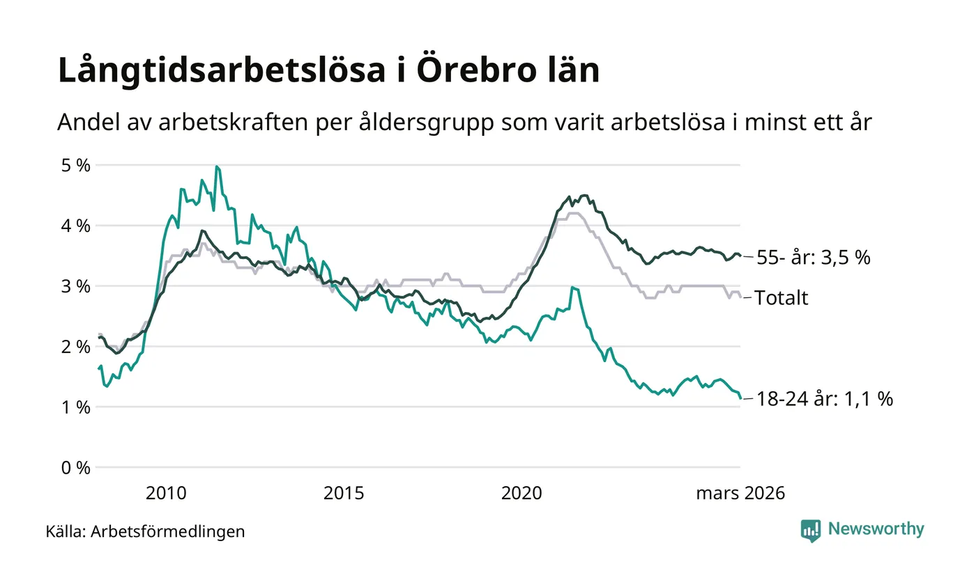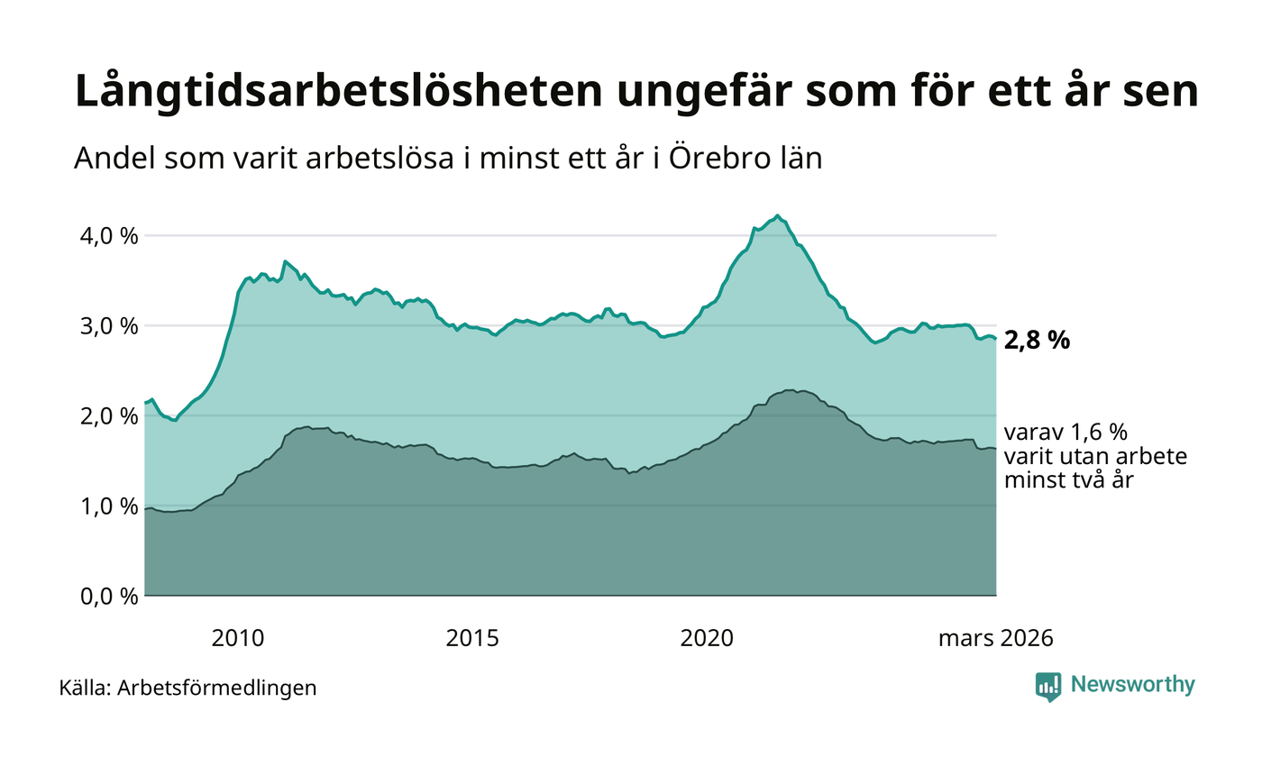I mars hade 4 328 Örebrobor varit arbetslösa i minst ett år, vilket är 45 färre än månaden innan. 4 328 personer motsvarar 2,8 procent av arbetskraften i länet – andelen långtidsarbetslösa är ungefär på samma nivå som för ett år sedan.