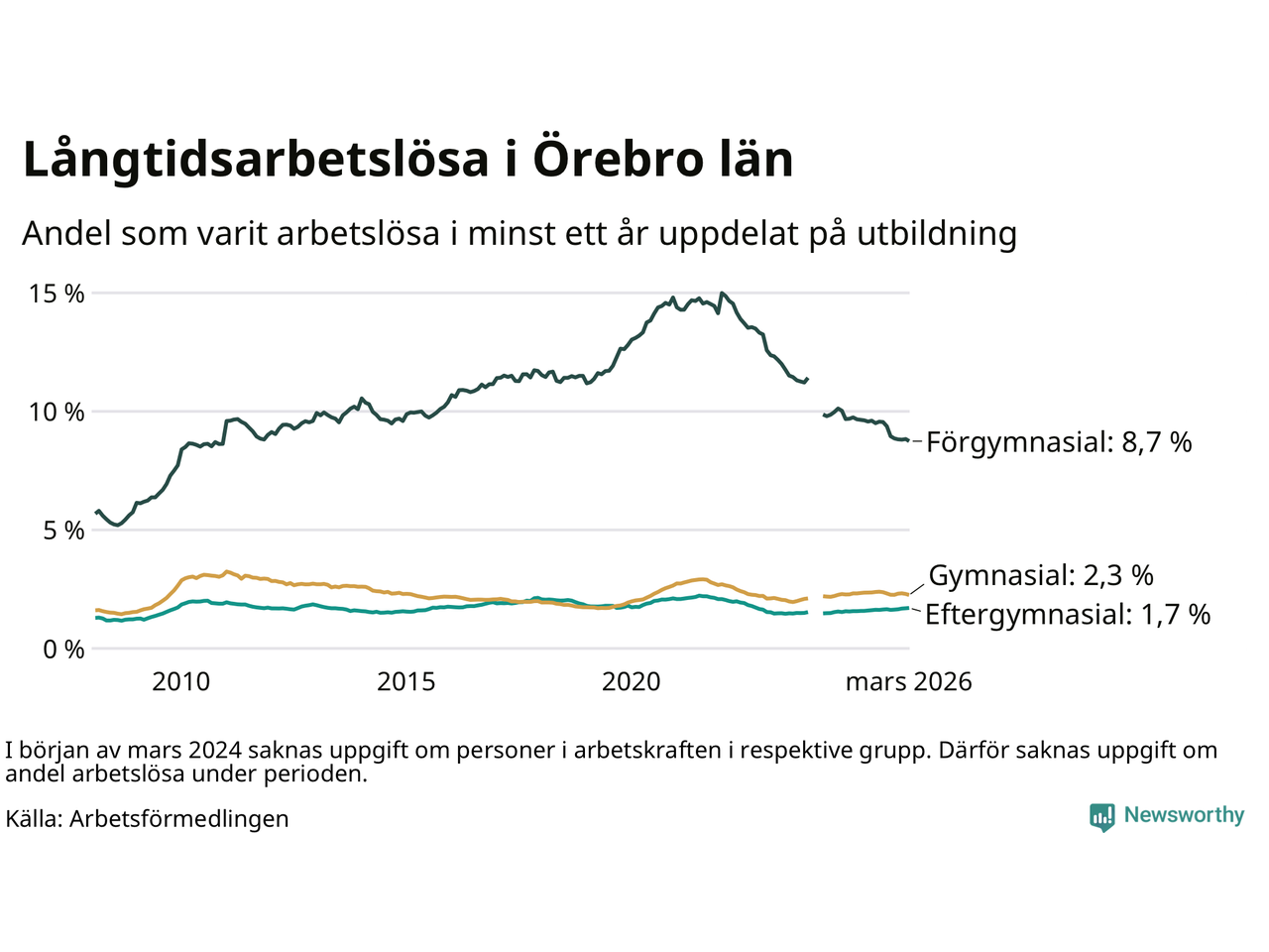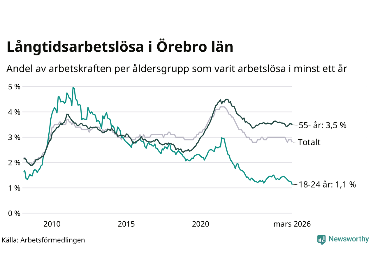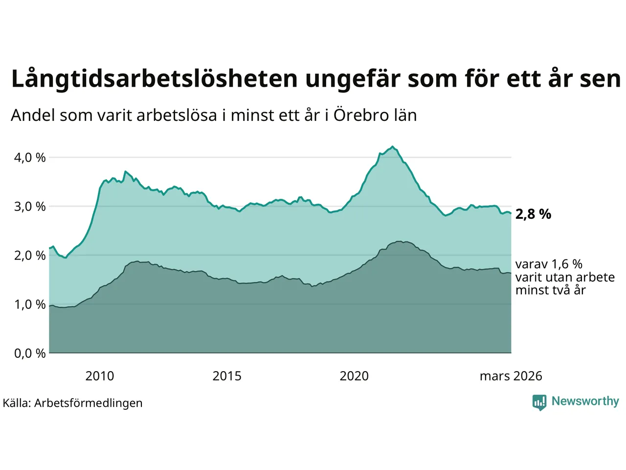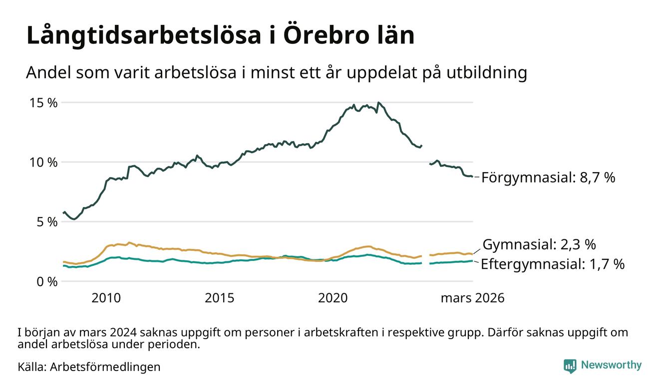 I mars hade 4 328 Örebrobor varit arbetslösa i minst ett år, vilket är 45 färre än månaden innan. 4 328 personer motsvarar 2,8 procent av arbetskraften i länet – andelen långtidsarbetslösa är ungefär på samma nivå som för ett år sedan.