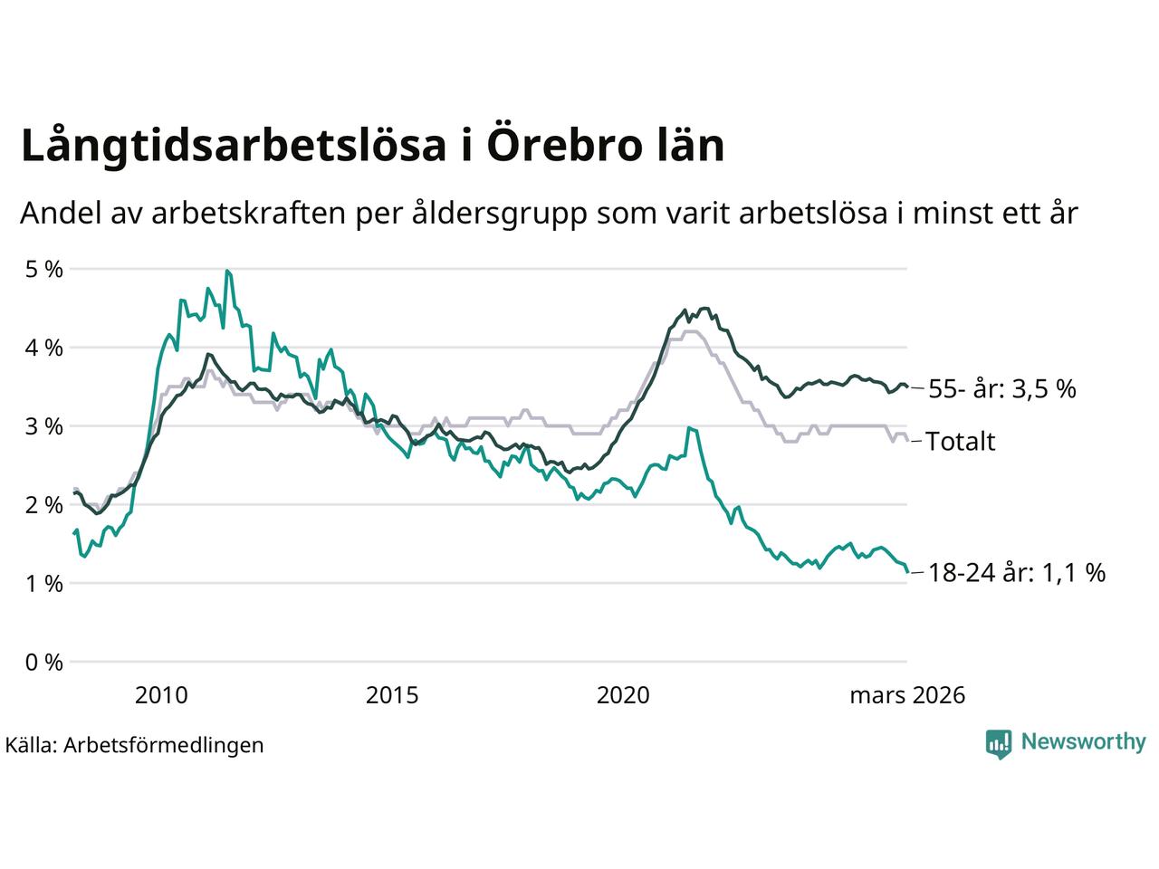 Av de 4 328 personerna som varit arbetslösa i mer än ett år i Örebro län är 1 135 personer mellan 55 och 661 år och mellan 193 och 193 är mellan 18 och 24 år. För den äldre gruppen är andelen arbetslösa 3,5 procent medan den i den yngre gruppen är 1,1 procent. Även i riket som helhet är långtidsarbetslösheten högre i gruppen äldre.