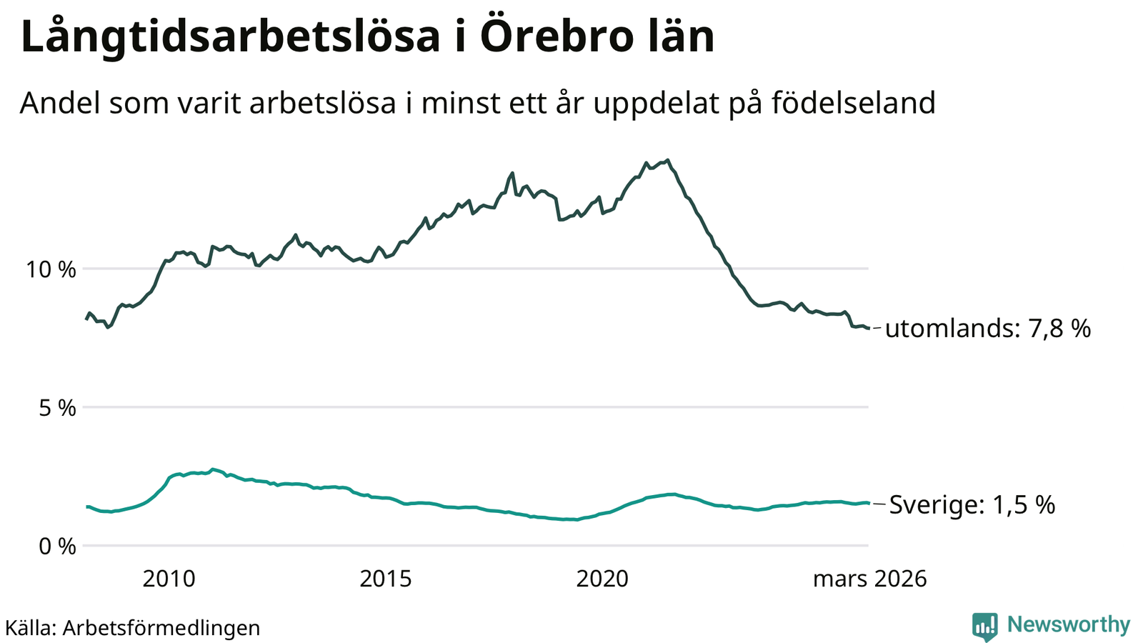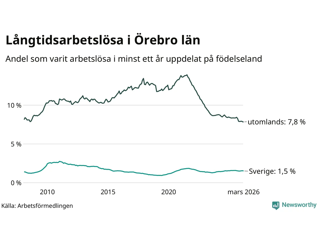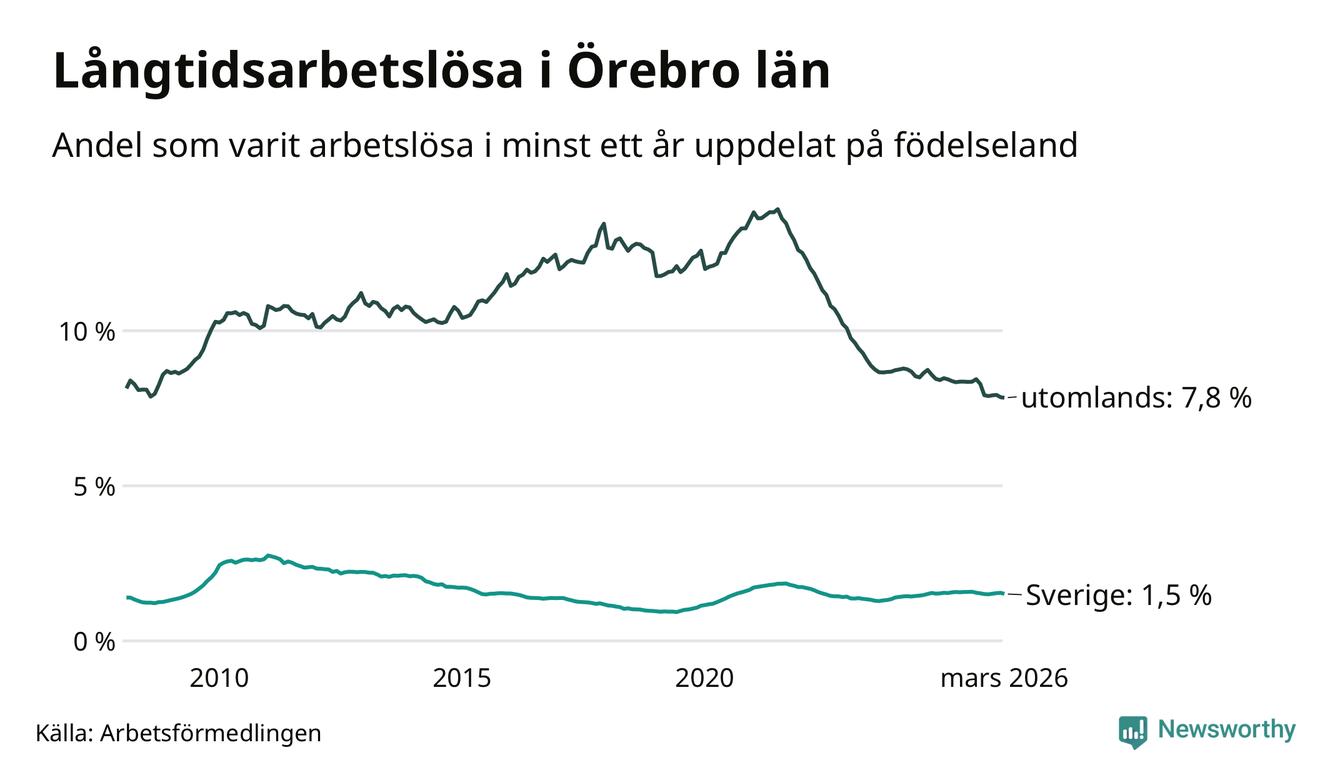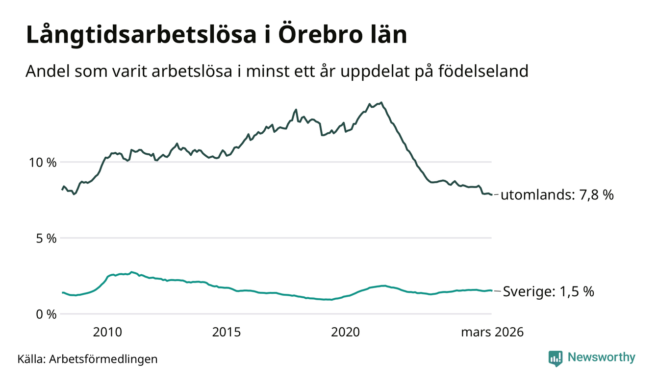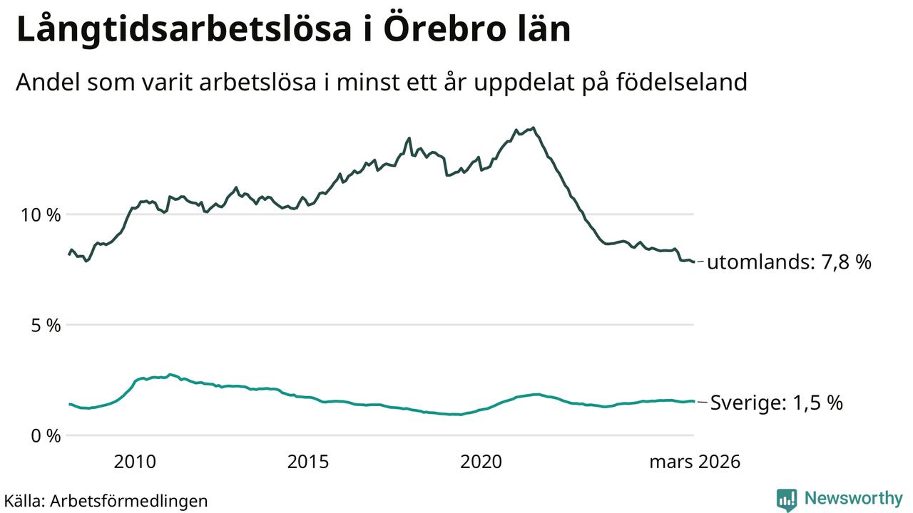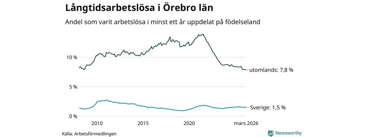 1 819 av de långtidsarbetslösa i Örebro län är födda i Sverige och mellan 2 510 och 2 513 är födda utomlands. Det innebär att långtidsarbetslösheten bland Sverigefödda är 1,5 procent, medan den ligger på 7,8 procent för utlandsfödda.