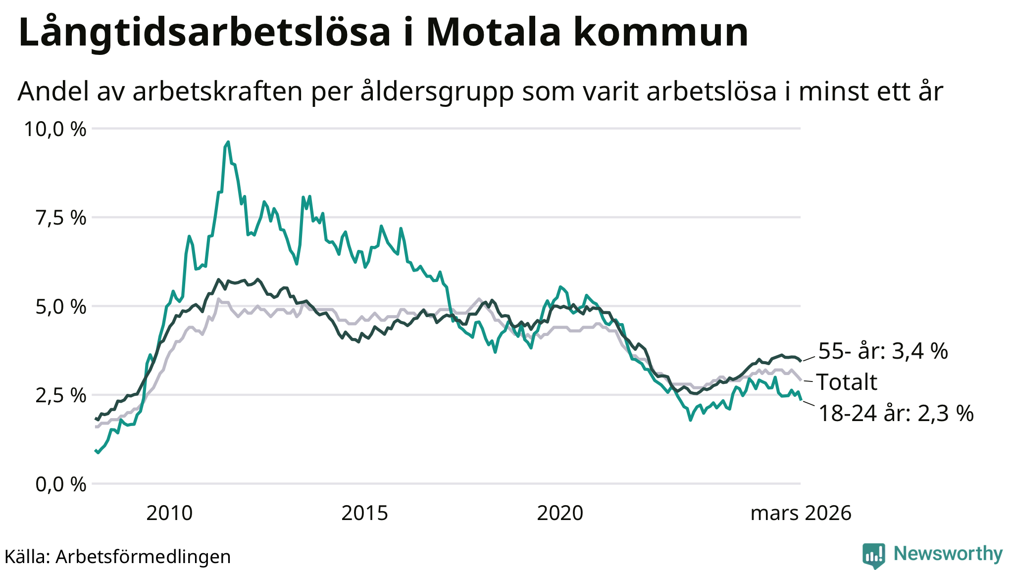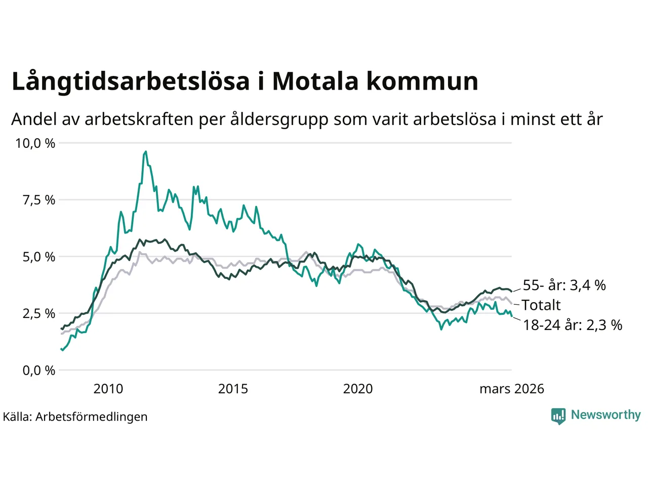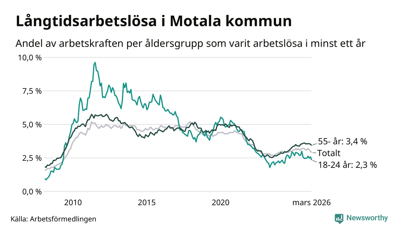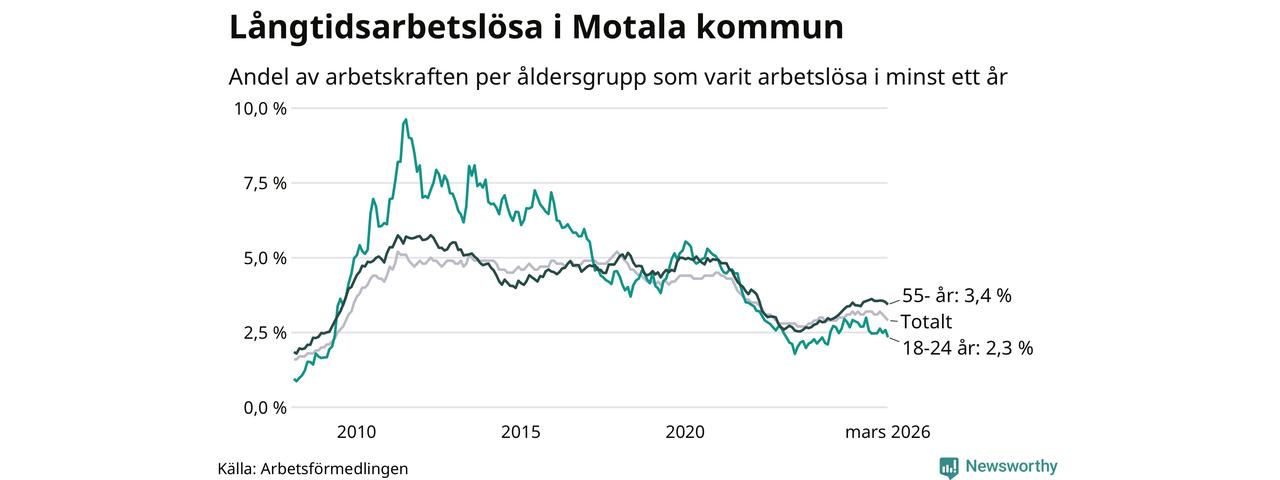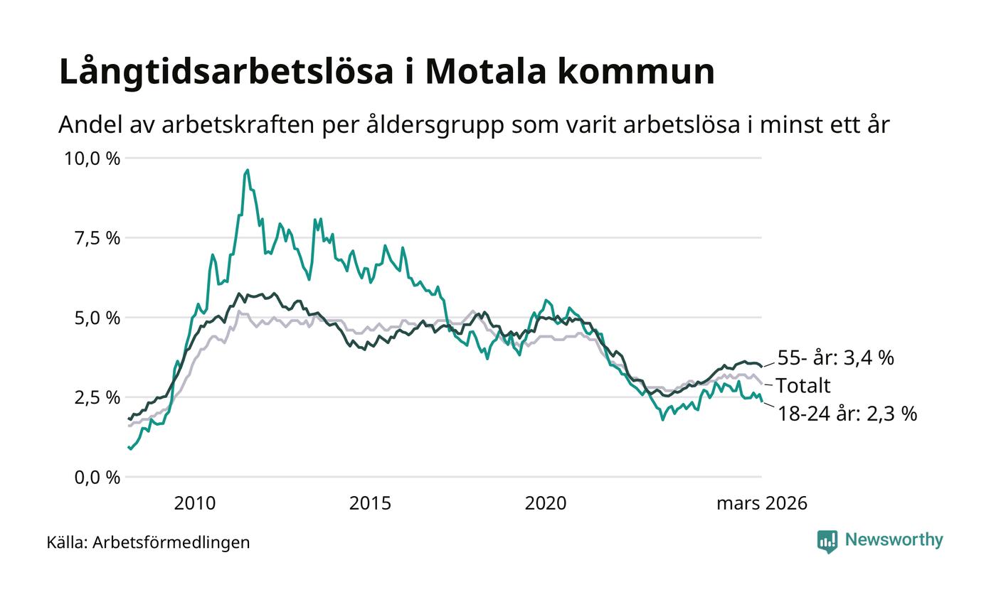 Av de 602 personerna som varit arbetslösa i mer än ett år i Motala kommun är 171 personer mellan 55 och 661 år och 48 är mellan 18 och 24 år. För den äldre gruppen är andelen arbetslösa 3,4 procent medan den i den yngre gruppen är 2,3 procent. Även i riket som helhet är långtidsarbetslösheten högre i gruppen äldre.