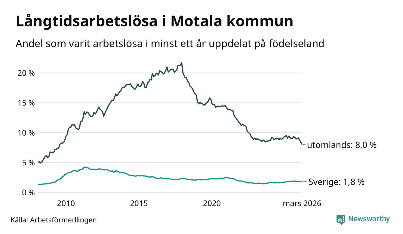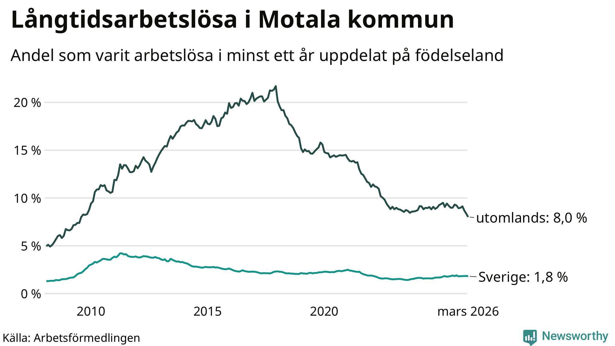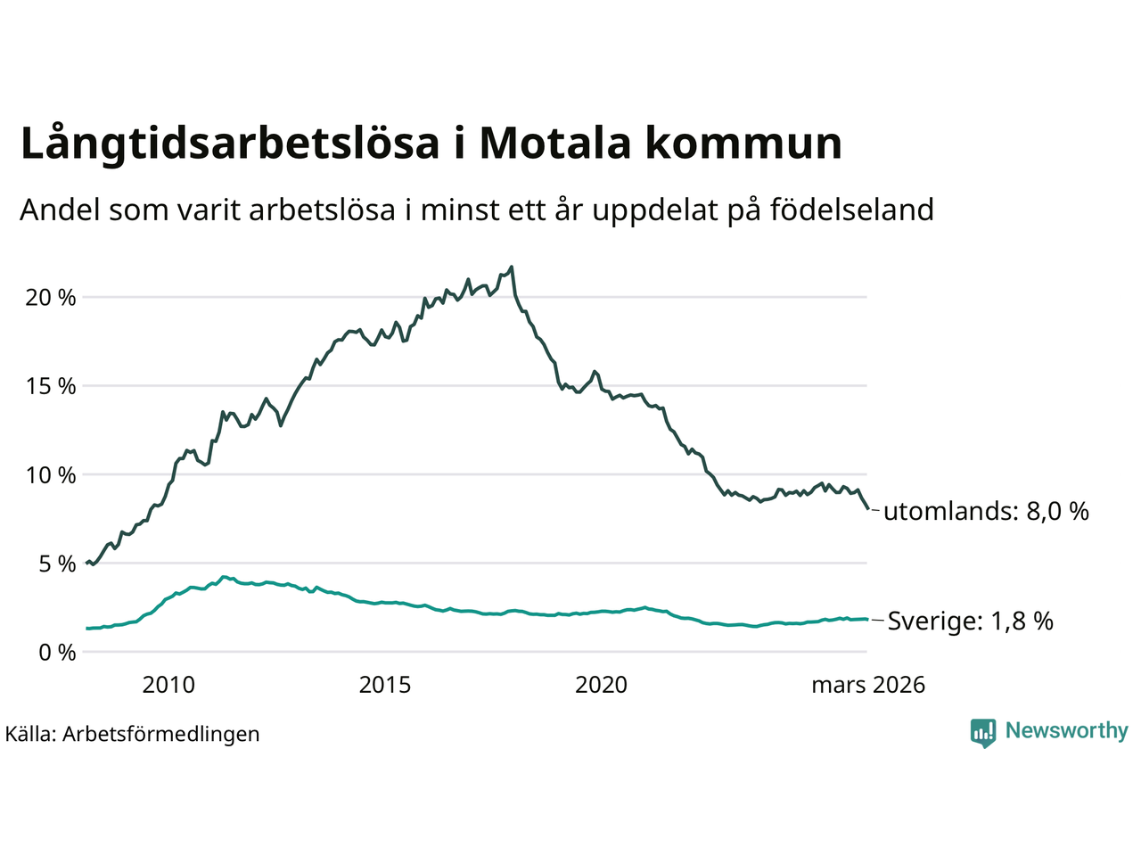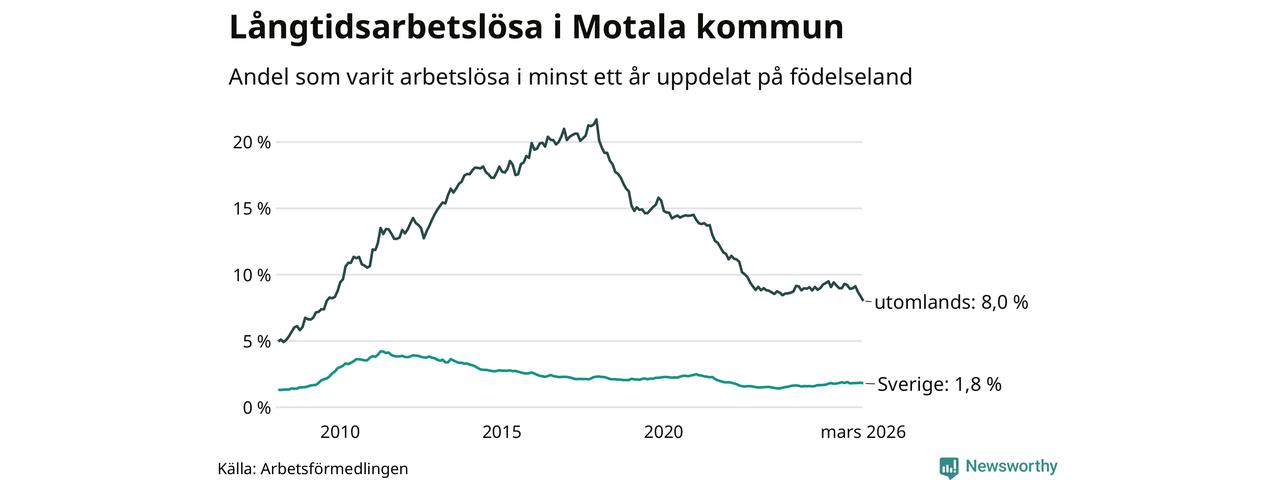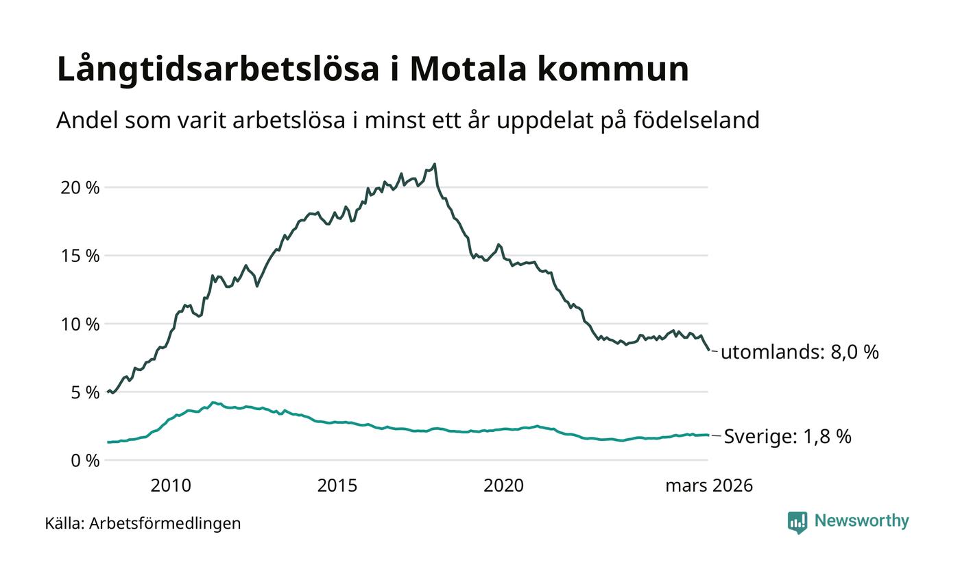 304 av de långtidsarbetslösa i Motala är födda i Sverige, medan 298 är födda utomlands. Det innebär att långtidsarbetslösheten bland Sverigefödda är 1,8 procent, medan den är fyra gånger så hög – 8,0 procent – bland födda utomlands. Även i riket som helhet är arbetslösheten högre bland utrikesfödda.
